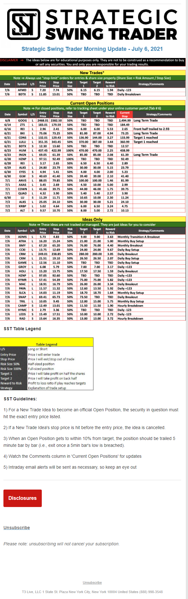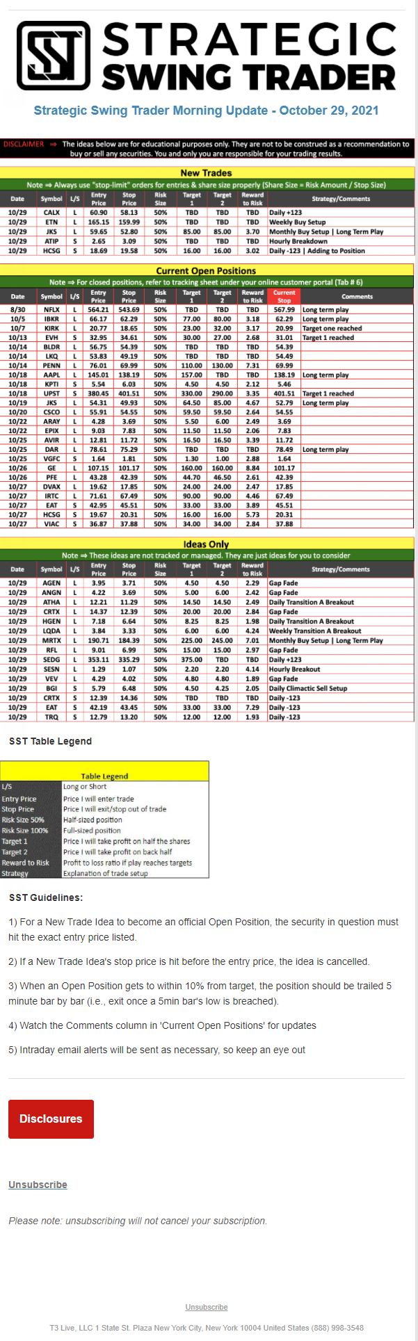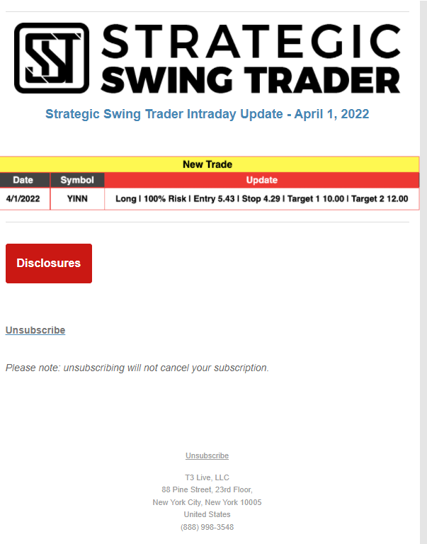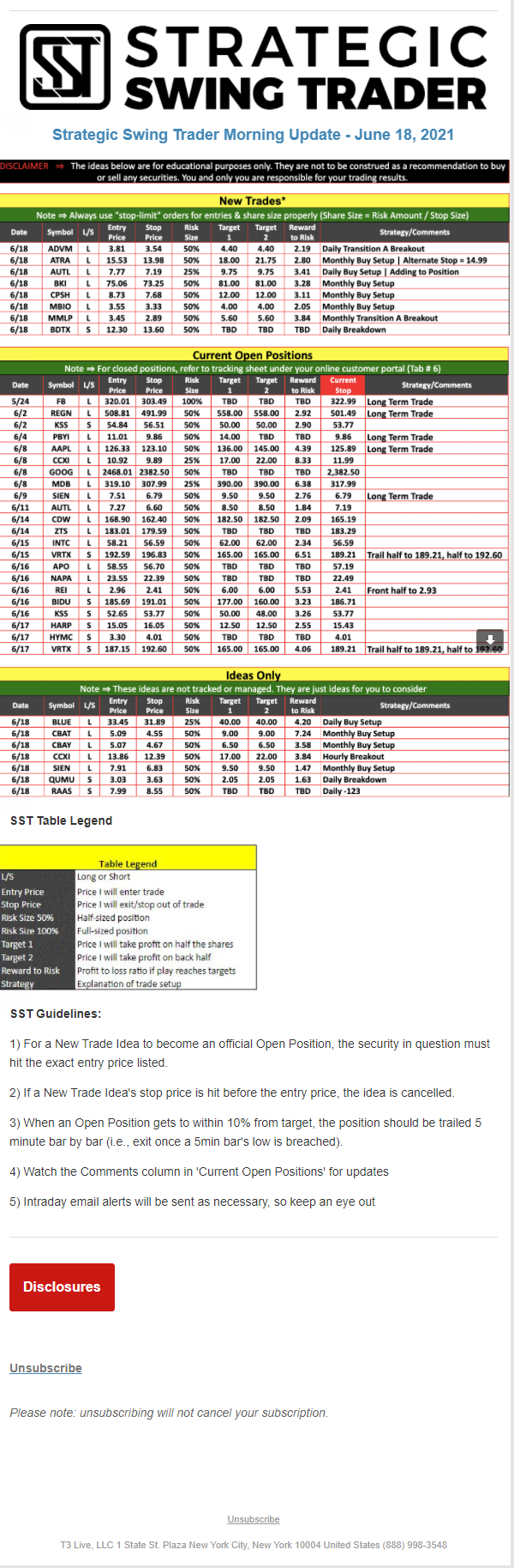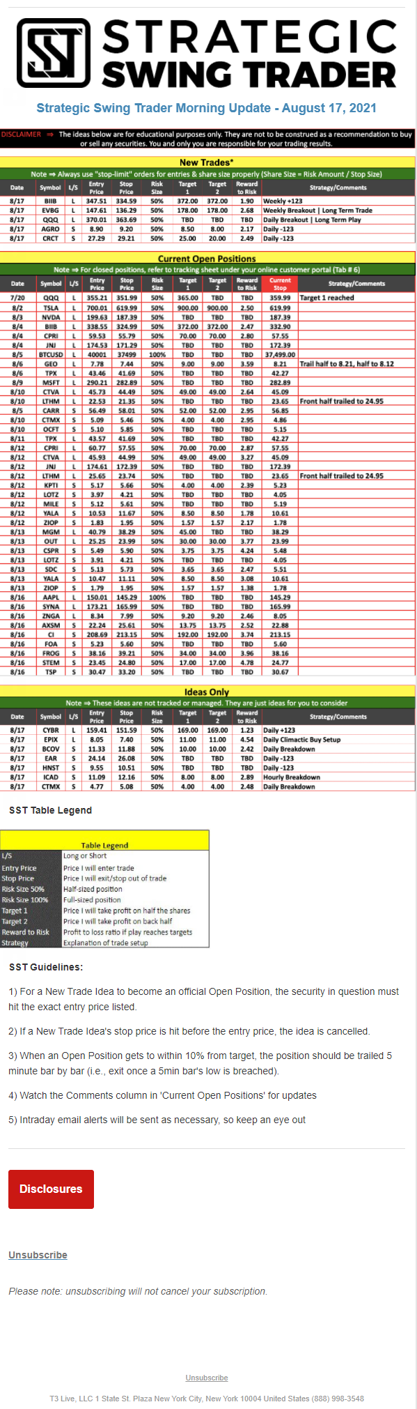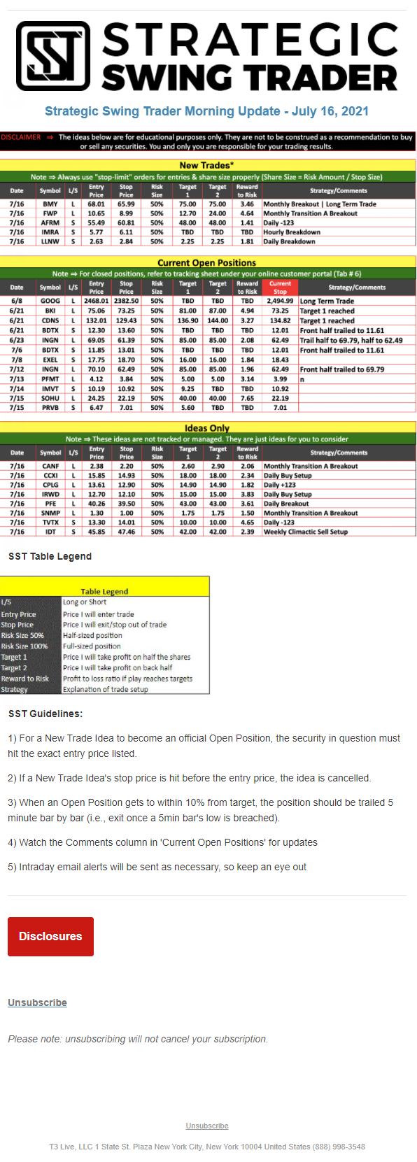 The programs that T3 Live distributes (including the “Virtual Trading Floor®,” articles, commentary, videos, blogs and social media postings) are for informational and educational purposes only. No one should consider the information disseminated by T3 Live to be personalized investment advice, a recommendation to buy, sell or hold any investment, an offer (or a solicitation of an offer) to buy or sell any investment, or the provision of any other kind of advice that would require T3 Live to register as a broker-dealer, investment adviser or similar entity. No one associated with T3 Live is authorized to make any representation to the contrary.