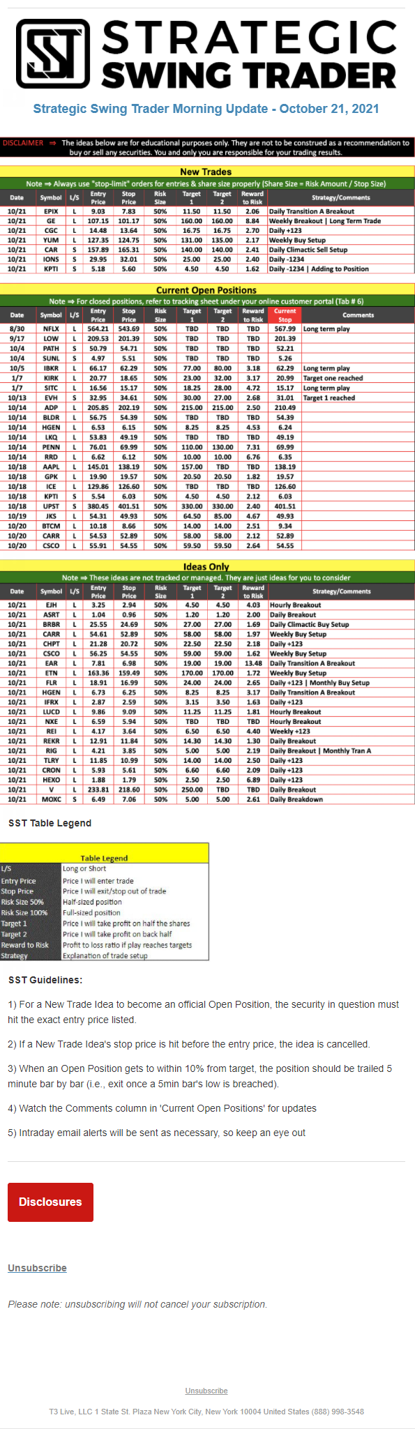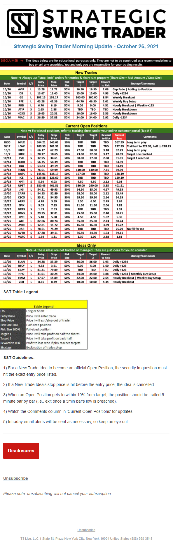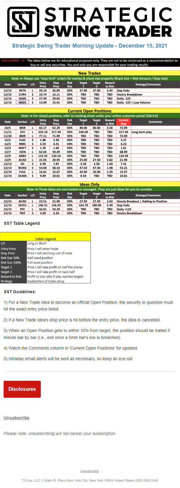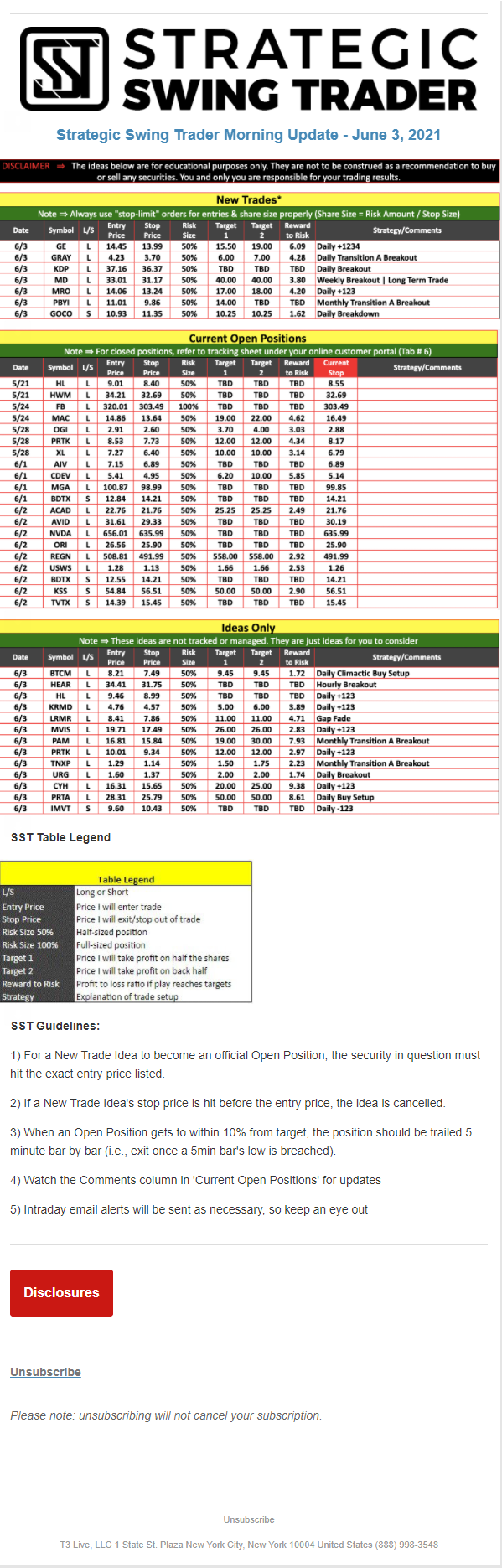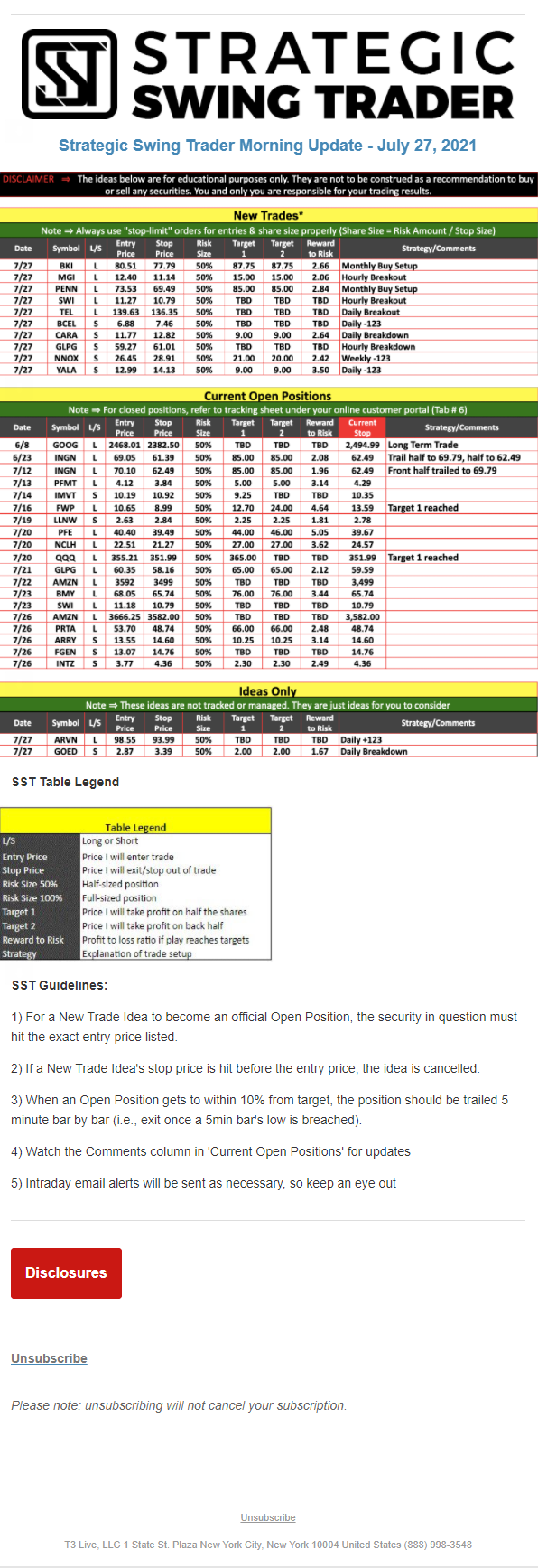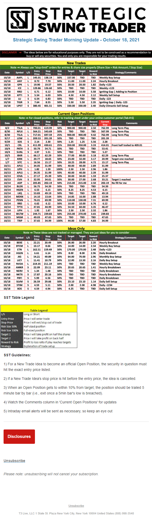 The programs that T3 Live distributes (including the “Virtual Trading Floor®,” articles, commentary, videos, blogs and social media postings) are for informational and educational purposes only. No one should consider the information disseminated by T3 Live to be personalized investment advice, a recommendation to buy, sell or hold any investment, an offer (or a solicitation of an offer) to buy or sell any investment, or the provision of any other kind of advice that would require T3 Live to register as a broker-dealer, investment adviser or similar entity. No one associated with T3 Live is authorized to make any representation to the contrary.