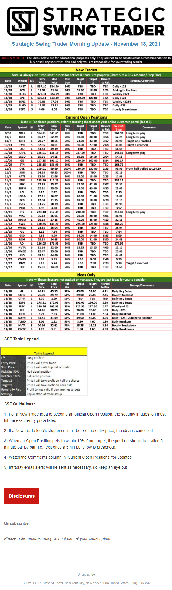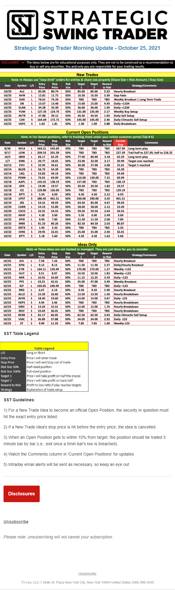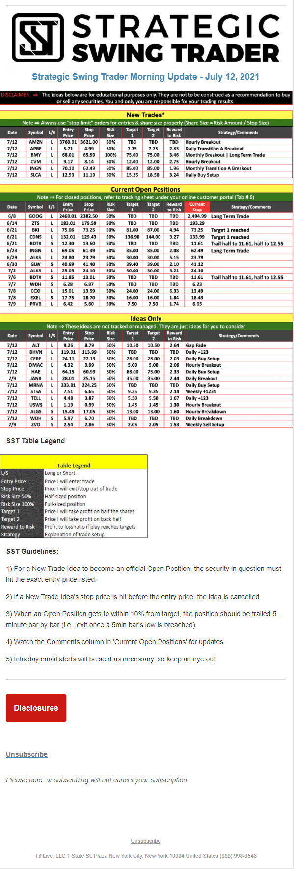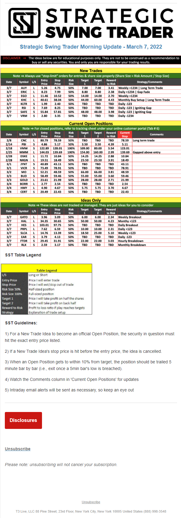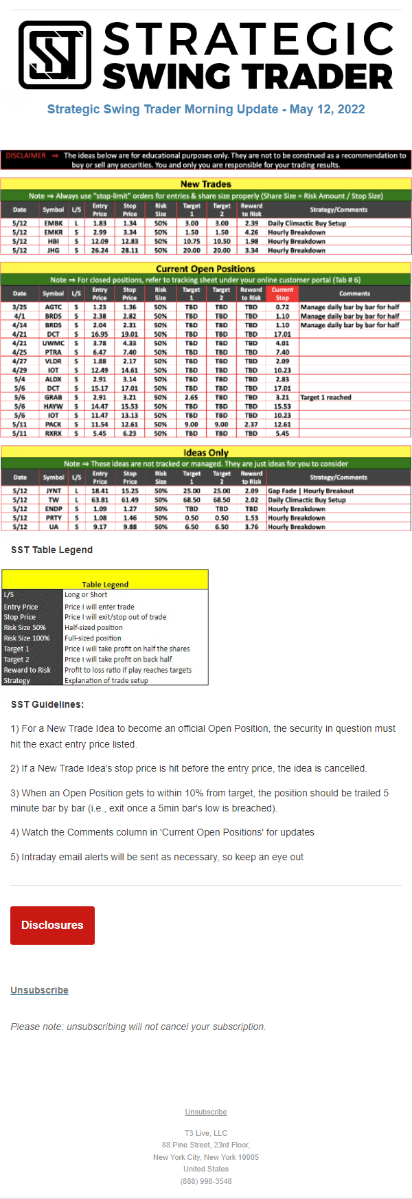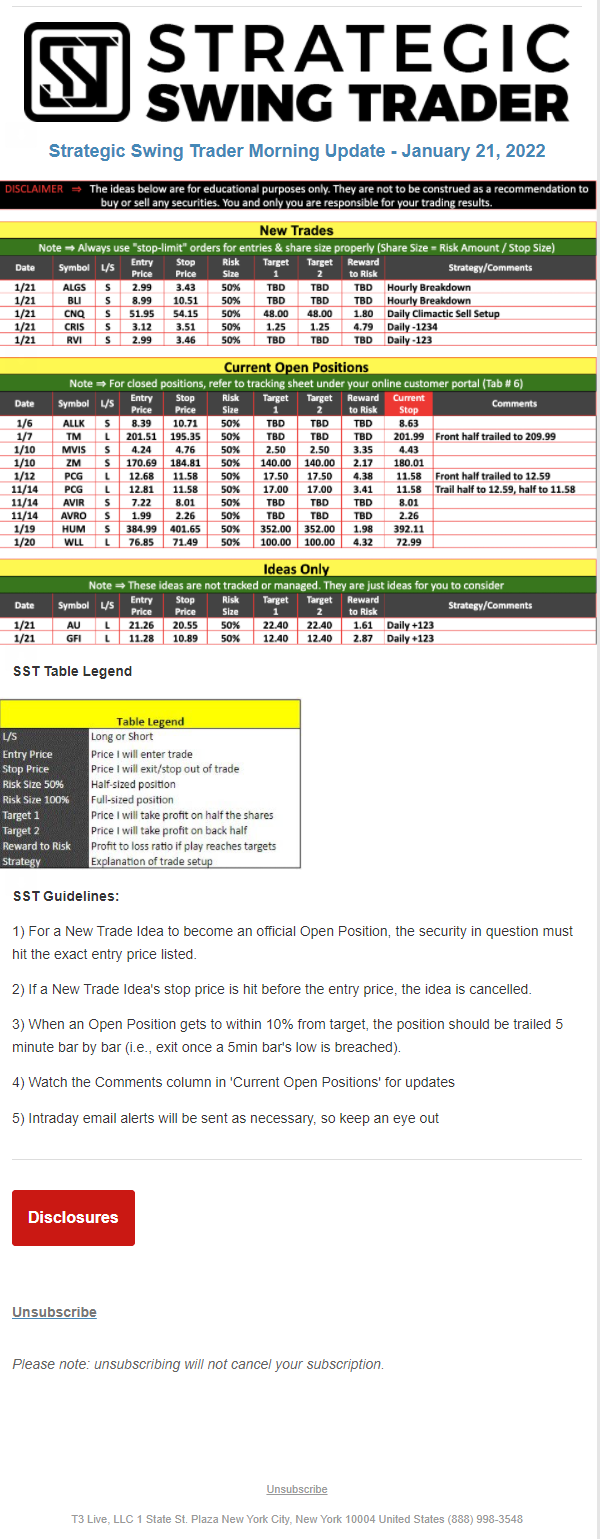 The programs that T3 Live distributes (including the “Virtual Trading Floor®,” articles, commentary, videos, blogs and social media postings) are for informational and educational purposes only. No one should consider the information disseminated by T3 Live to be personalized investment advice, a recommendation to buy, sell or hold any investment, an offer (or a solicitation of an offer) to buy or sell any investment, or the provision of any other kind of advice that would require T3 Live to register as a broker-dealer, investment adviser or similar entity. No one associated with T3 Live is authorized to make any representation to the contrary.