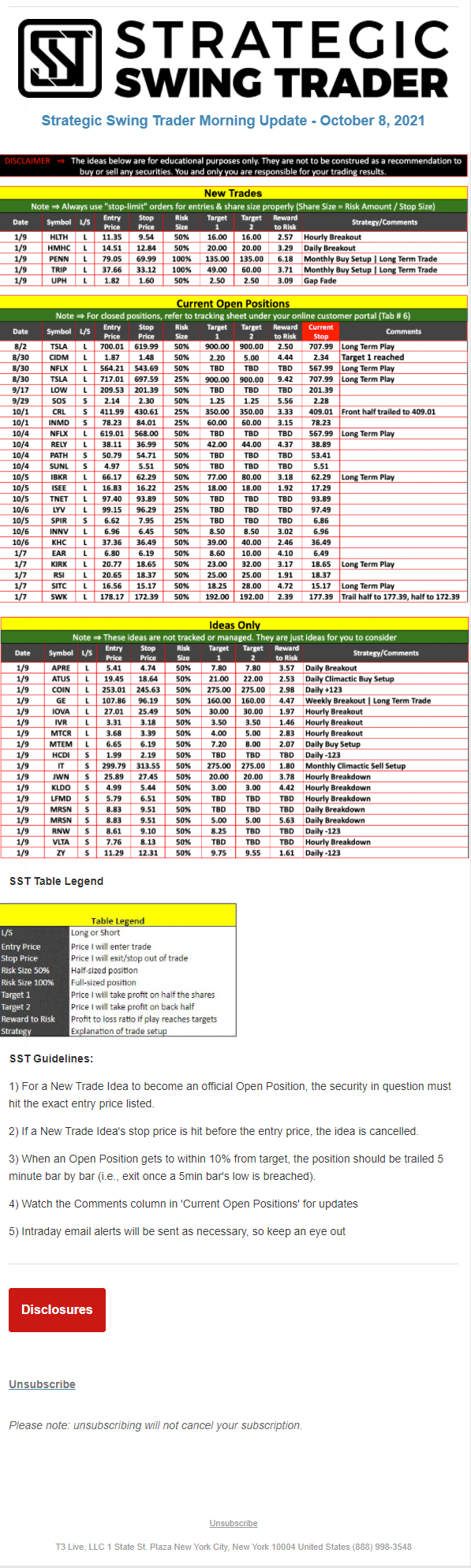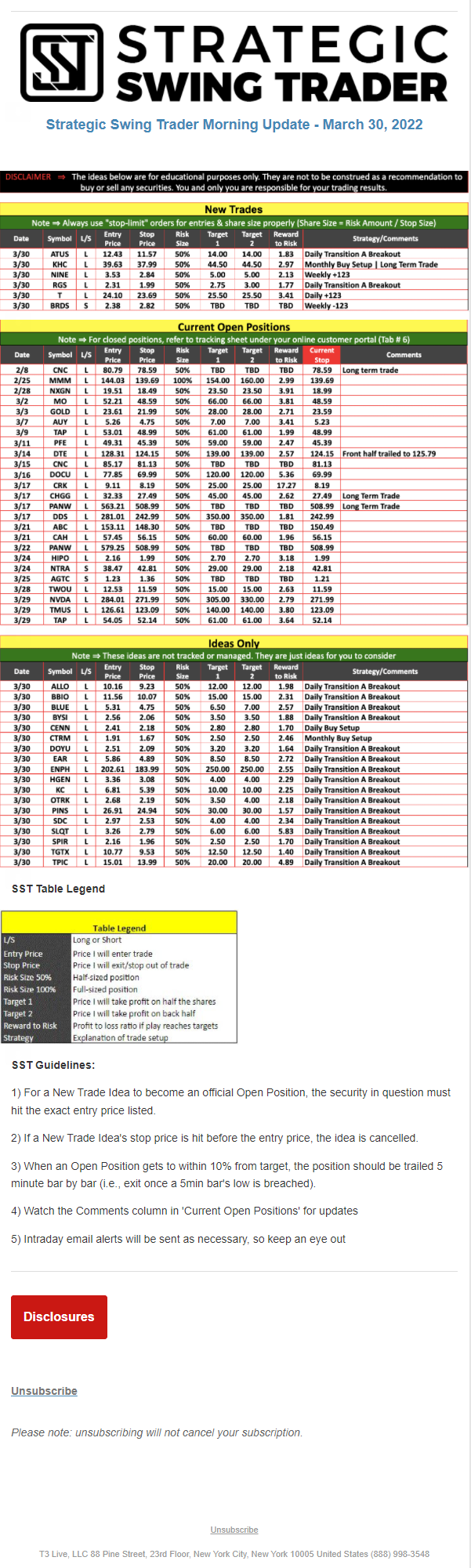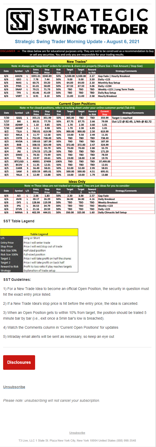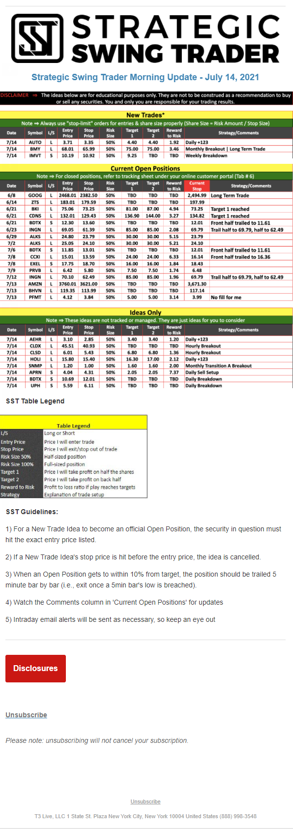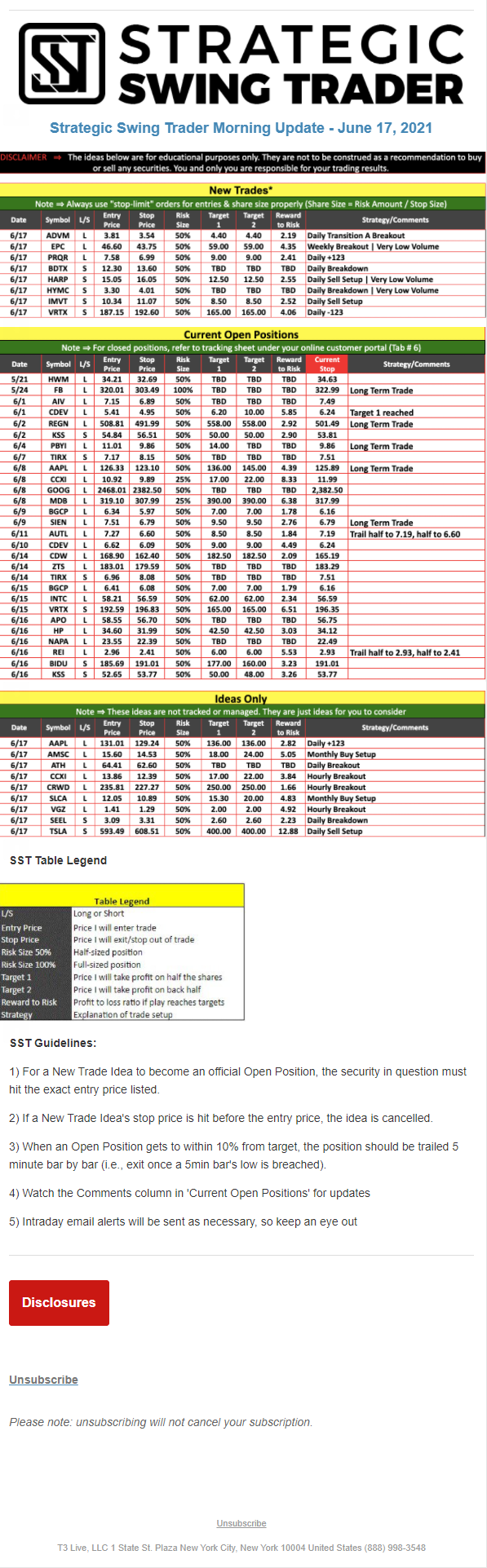 The programs that T3 Live distributes (including the “Virtual Trading Floor®,” articles, commentary, videos, blogs and social media postings) are for informational and educational purposes only. No one should consider the information disseminated by T3 Live to be personalized investment advice, a recommendation to buy, sell or hold any investment, an offer (or a solicitation of an offer) to buy or sell any investment, or the provision of any other kind of advice that would require T3 Live to register as a broker-dealer, investment adviser or similar entity. No one associated with T3 Live is authorized to make any representation to the contrary.