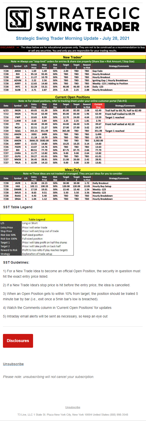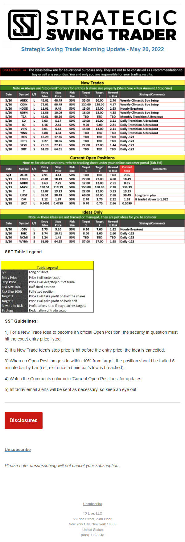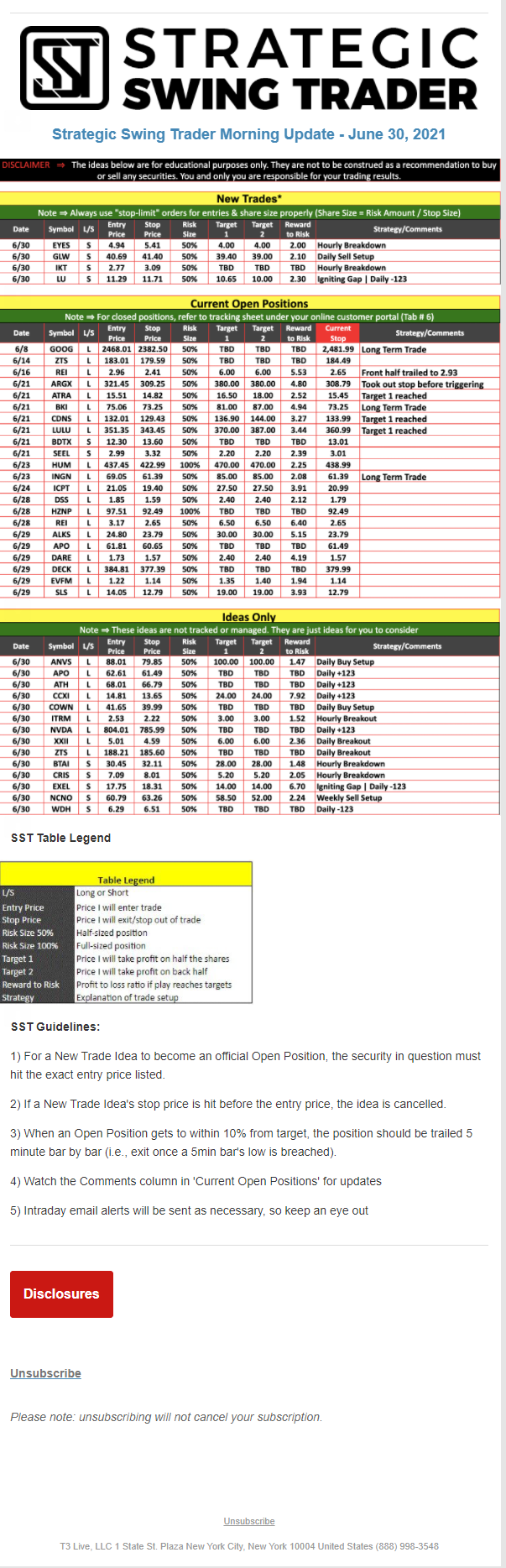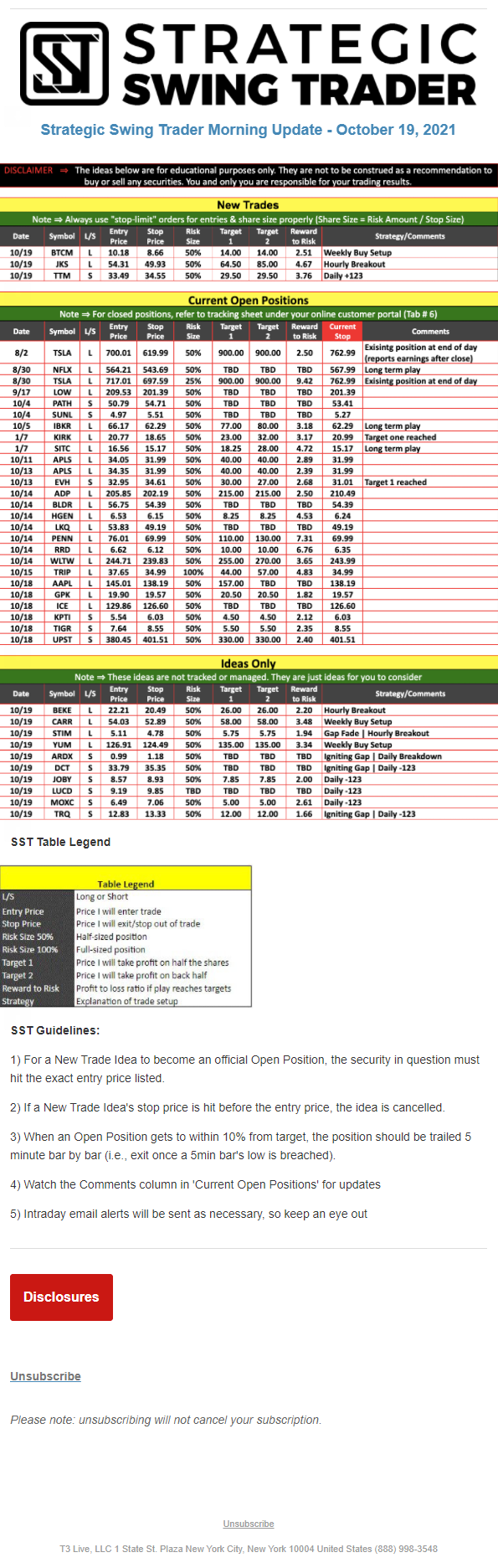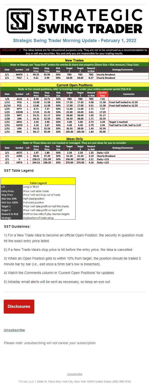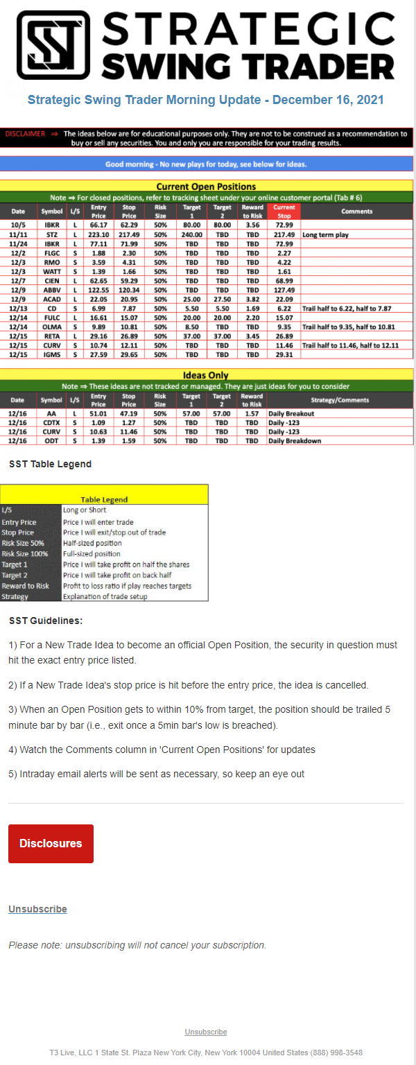 The programs that T3 Live distributes (including the “Virtual Trading Floor®,” articles, commentary, videos, blogs and social media postings) are for informational and educational purposes only. No one should consider the information disseminated by T3 Live to be personalized investment advice, a recommendation to buy, sell or hold any investment, an offer (or a solicitation of an offer) to buy or sell any investment, or the provision of any other kind of advice that would require T3 Live to register as a broker-dealer, investment adviser or similar entity. No one associated with T3 Live is authorized to make any representation to the contrary.