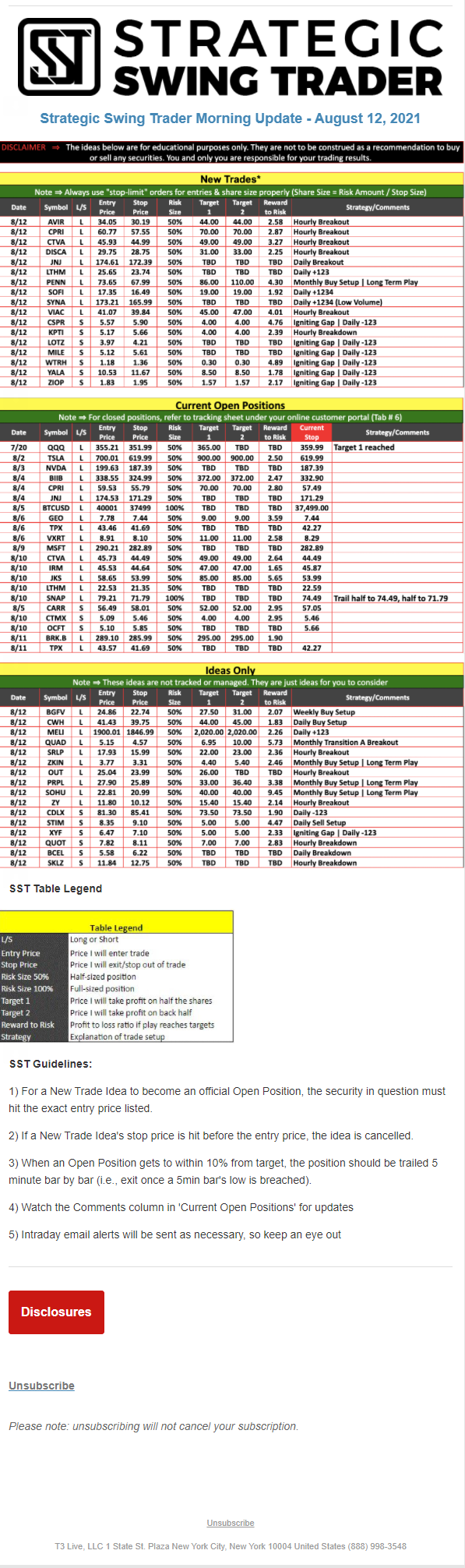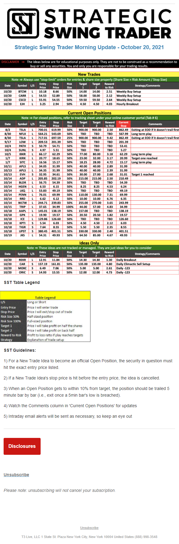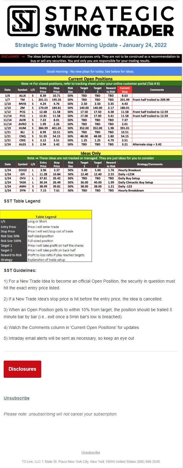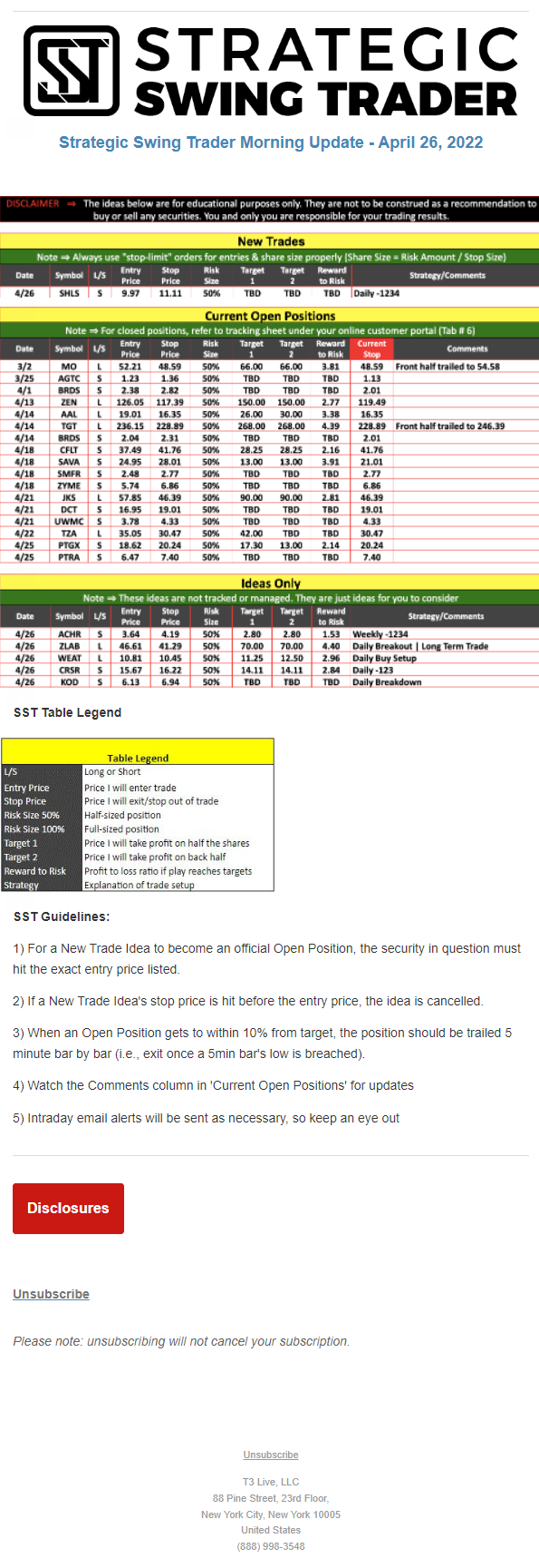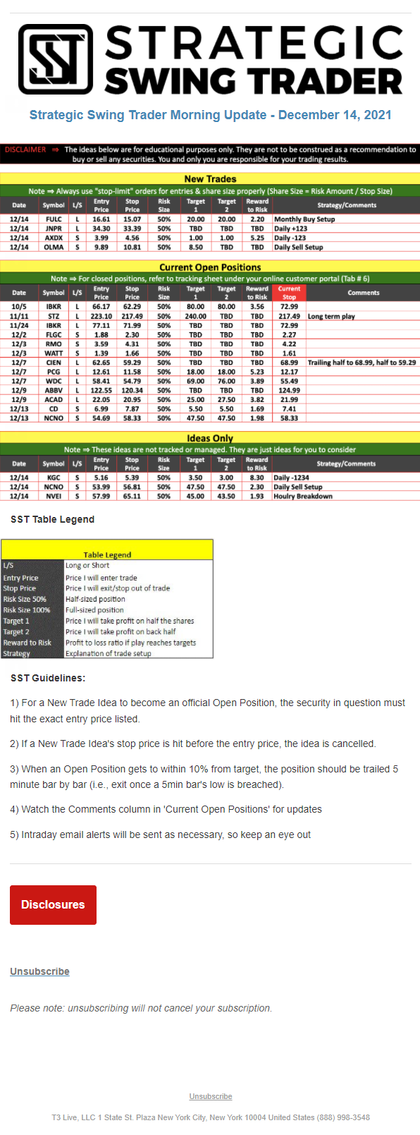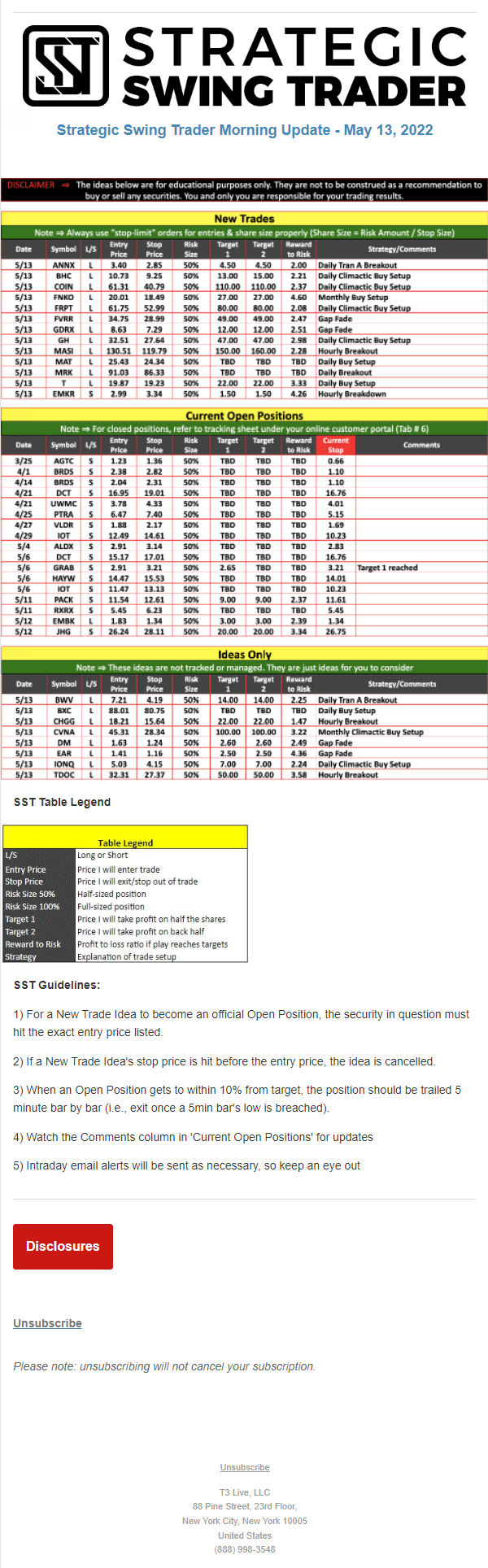 The programs that T3 Live distributes (including the “Virtual Trading Floor®,” articles, commentary, videos, blogs and social media postings) are for informational and educational purposes only. No one should consider the information disseminated by T3 Live to be personalized investment advice, a recommendation to buy, sell or hold any investment, an offer (or a solicitation of an offer) to buy or sell any investment, or the provision of any other kind of advice that would require T3 Live to register as a broker-dealer, investment adviser or similar entity. No one associated with T3 Live is authorized to make any representation to the contrary.