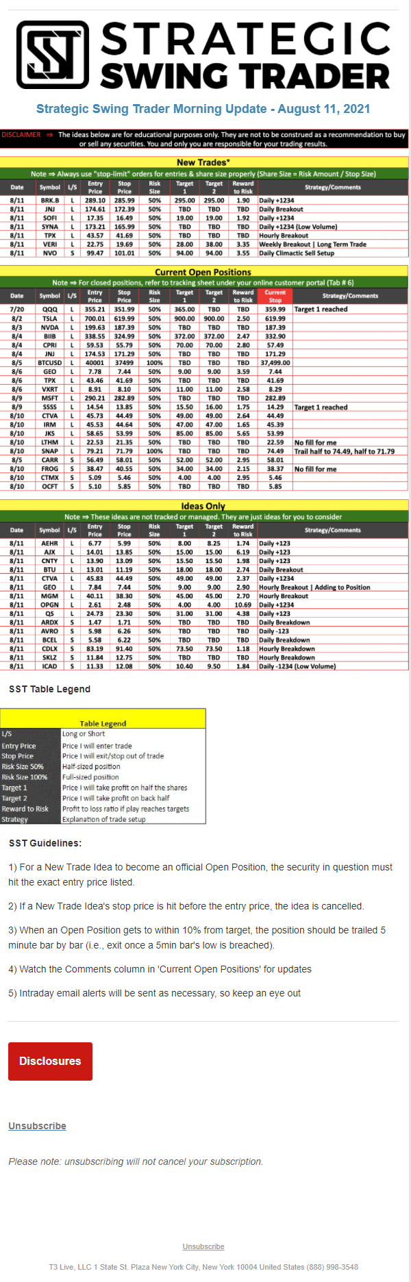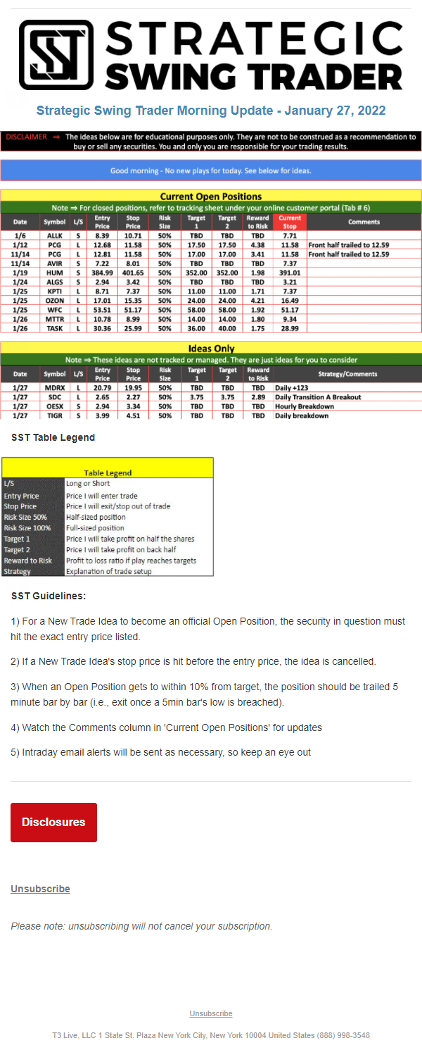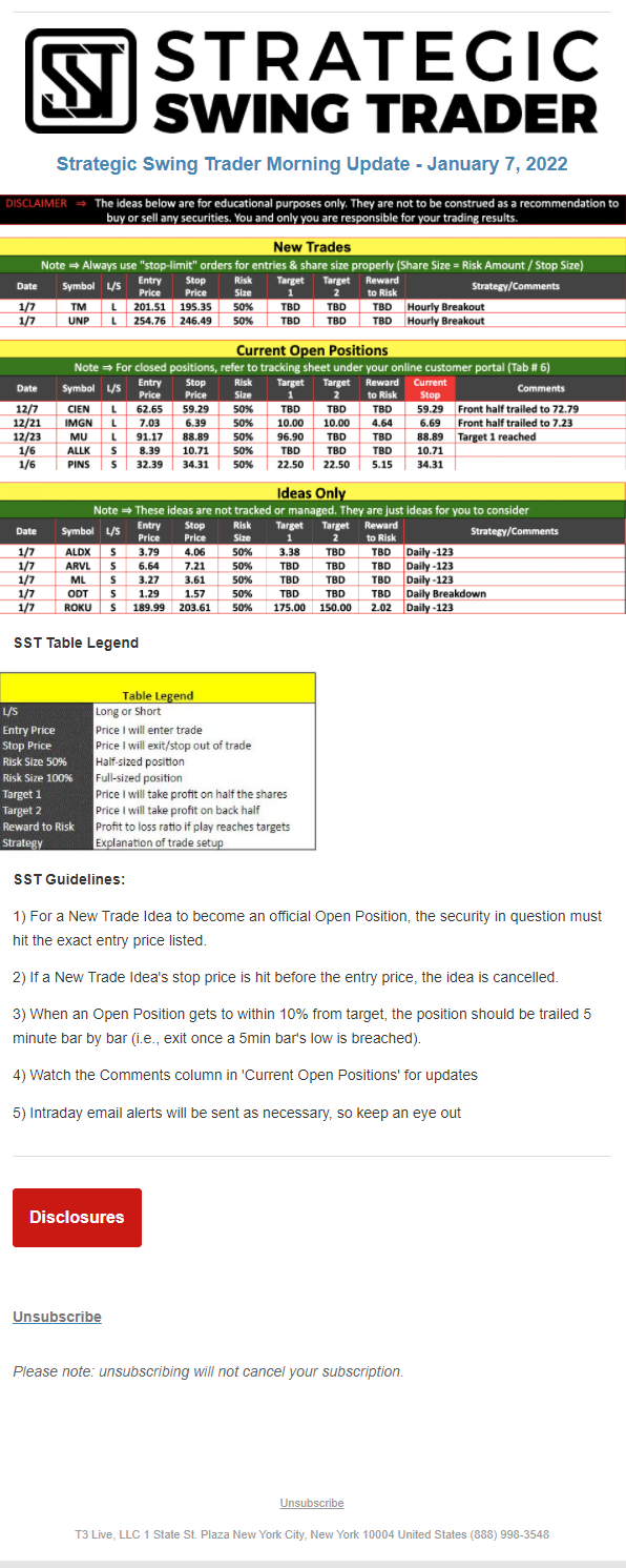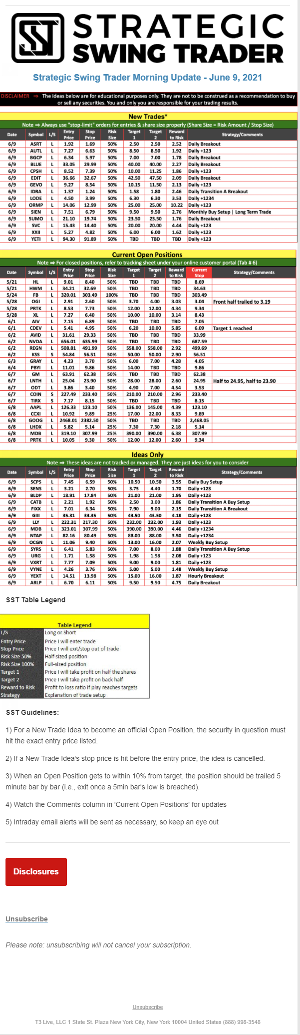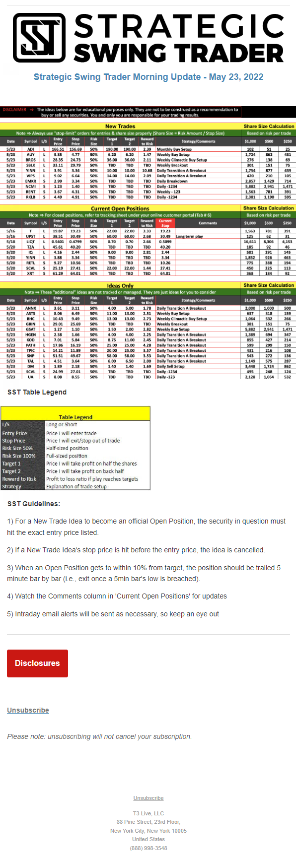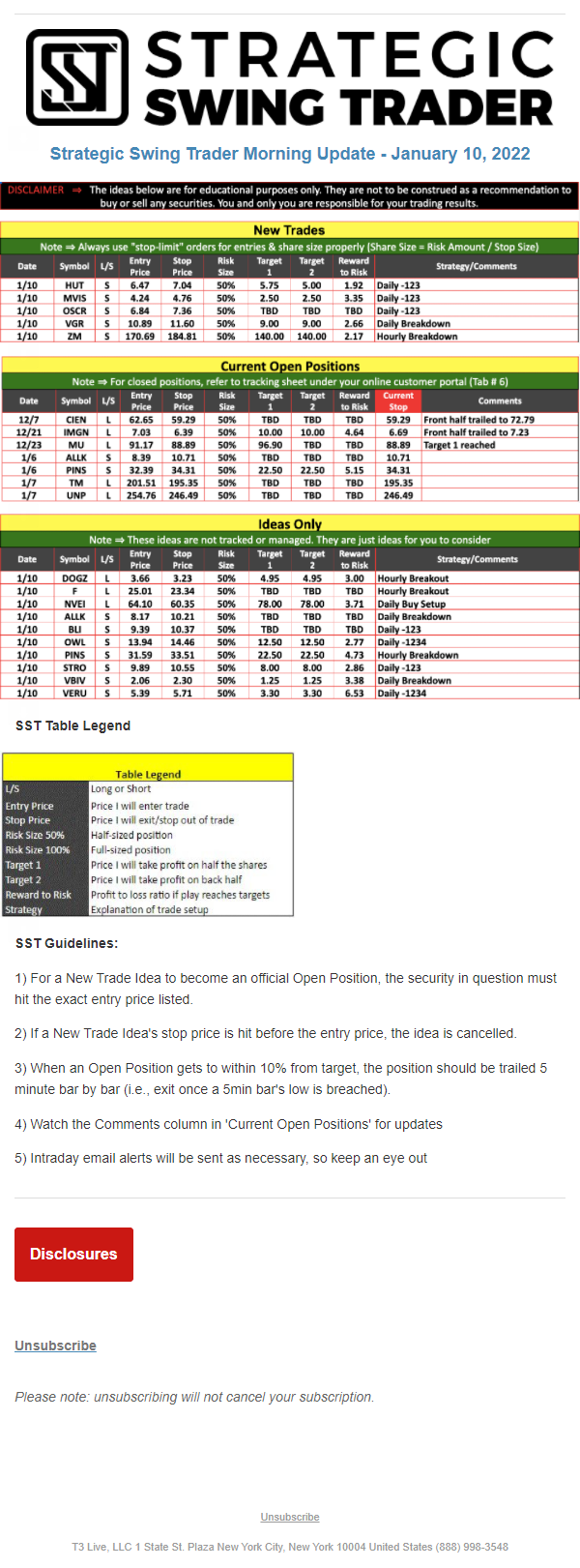The programs that T3 Live distributes (including the “Virtual Trading Floor®,” articles, commentary, videos, blogs and social media postings) are for informational and educational purposes only. No one should consider the information disseminated by T3 Live to be personalized investment advice, a recommendation to buy, sell or hold any investment, an offer (or a solicitation of an offer) to buy or sell any investment, or the provision of any other kind of advice that would require T3 Live to register as a broker-dealer, investment adviser or similar entity. No one associated with T3 Live is authorized to make any representation to the contrary.