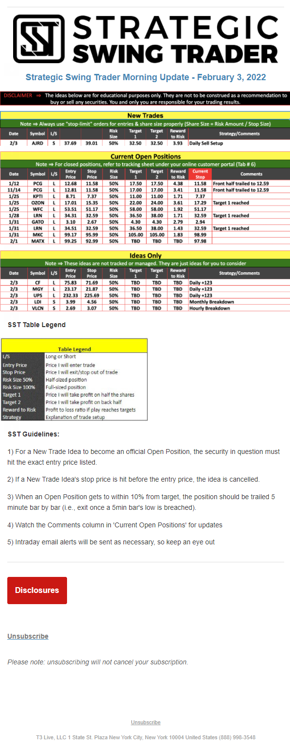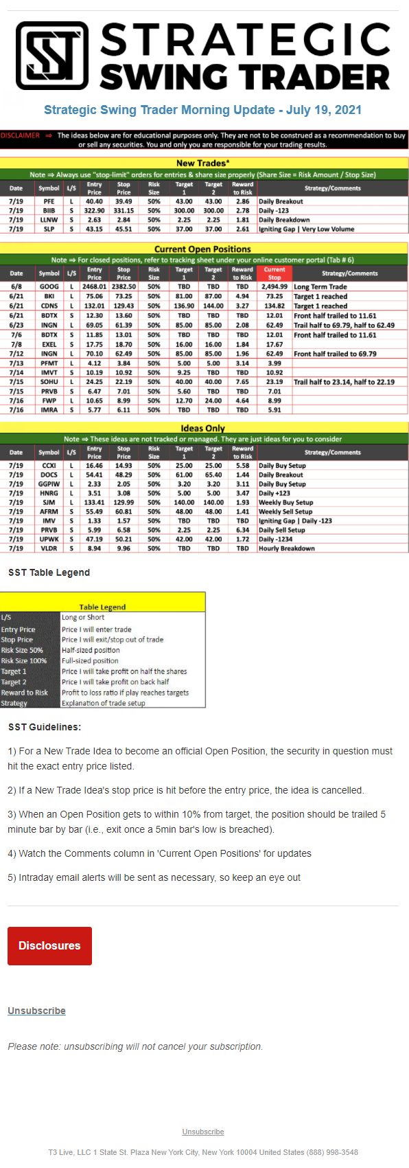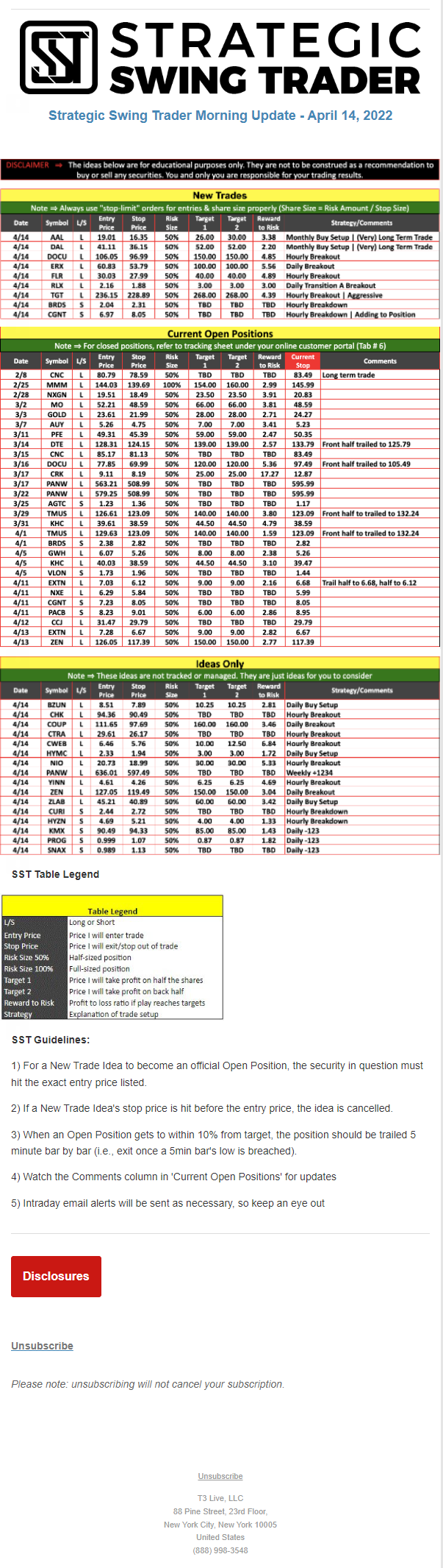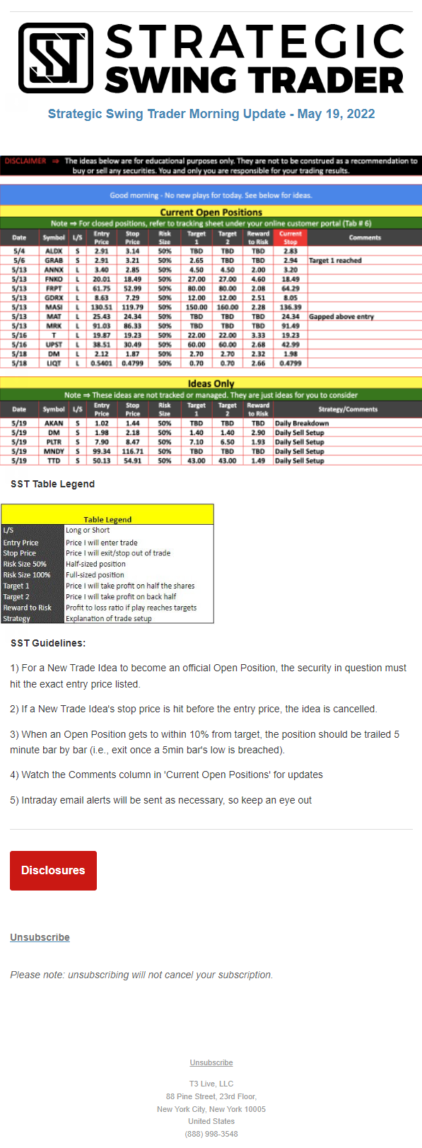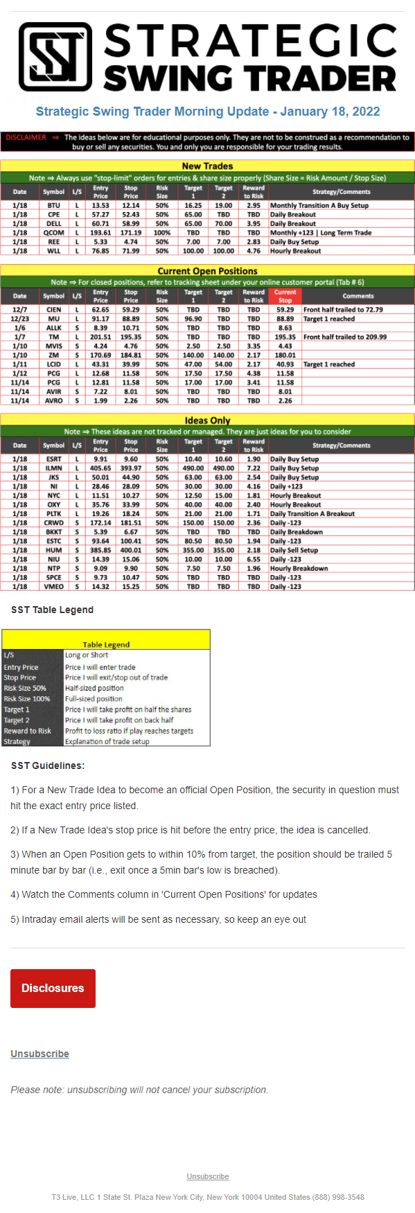 The programs that T3 Live distributes (including the “Virtual Trading Floor®,” articles, commentary, videos, blogs and social media postings) are for informational and educational purposes only. No one should consider the information disseminated by T3 Live to be personalized investment advice, a recommendation to buy, sell or hold any investment, an offer (or a solicitation of an offer) to buy or sell any investment, or the provision of any other kind of advice that would require T3 Live to register as a broker-dealer, investment adviser or similar entity. No one associated with T3 Live is authorized to make any representation to the contrary.