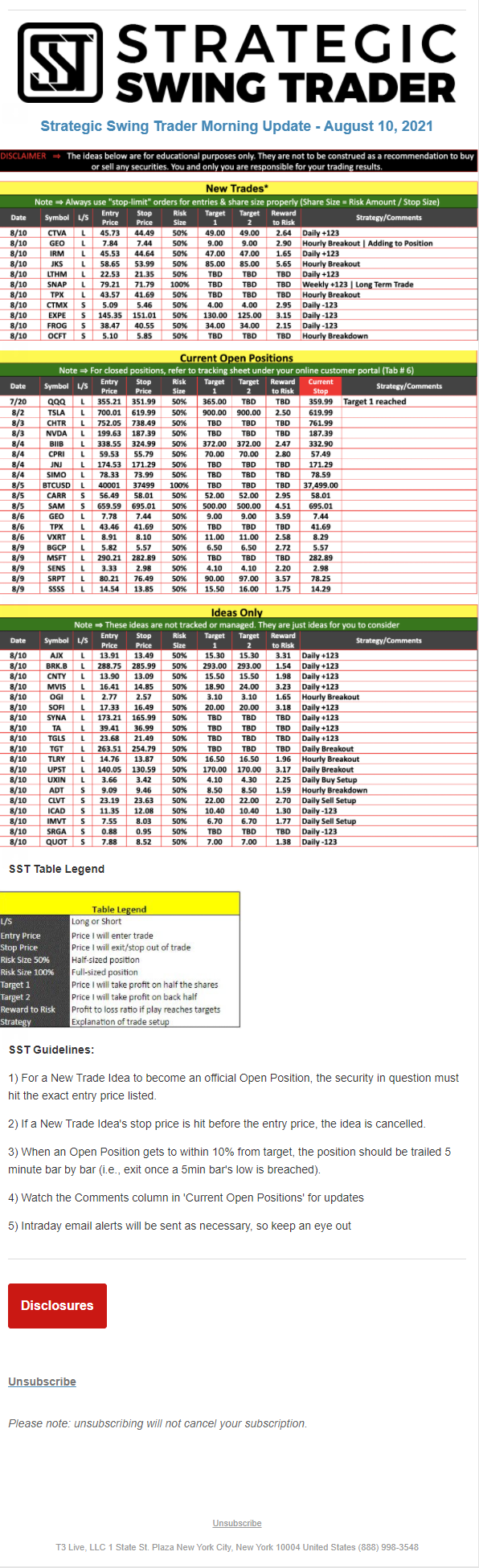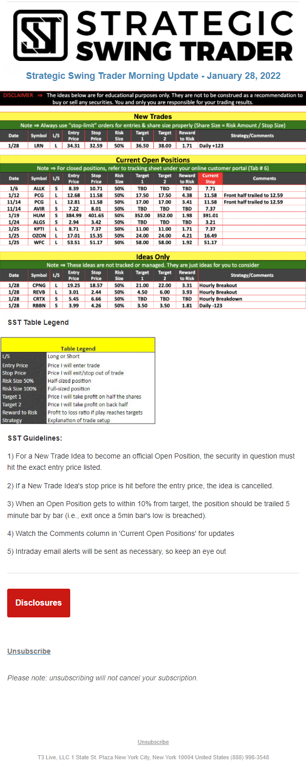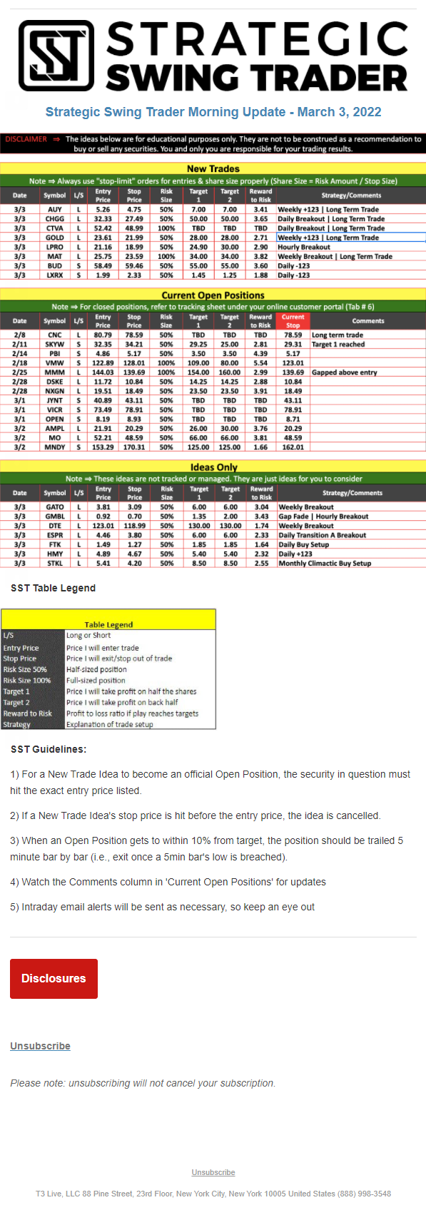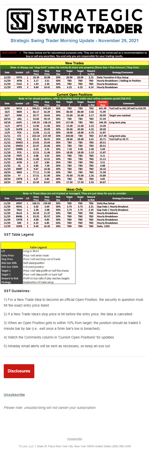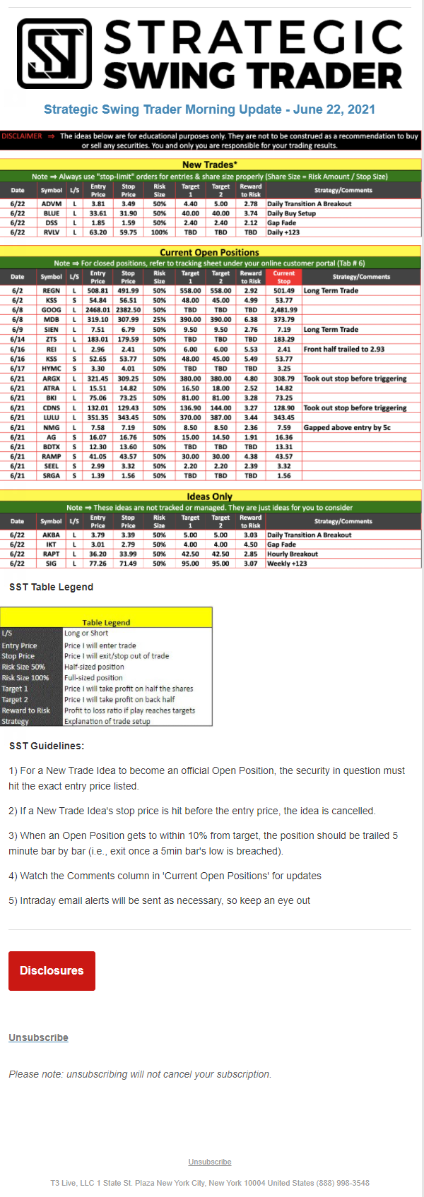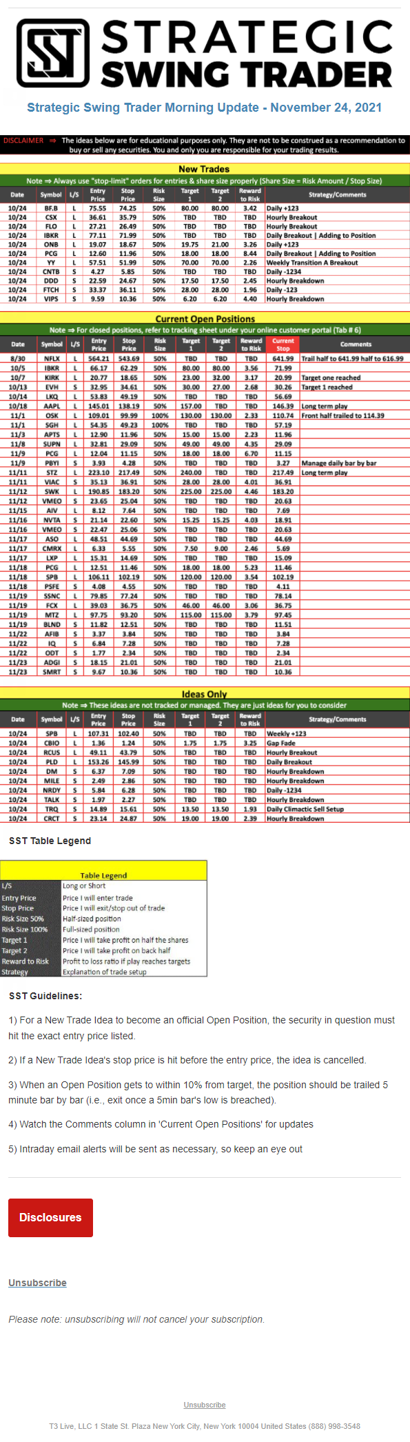 The programs that T3 Live distributes (including the “Virtual Trading Floor®,” articles, commentary, videos, blogs and social media postings) are for informational and educational purposes only. No one should consider the information disseminated by T3 Live to be personalized investment advice, a recommendation to buy, sell or hold any investment, an offer (or a solicitation of an offer) to buy or sell any investment, or the provision of any other kind of advice that would require T3 Live to register as a broker-dealer, investment adviser or similar entity. No one associated with T3 Live is authorized to make any representation to the contrary.