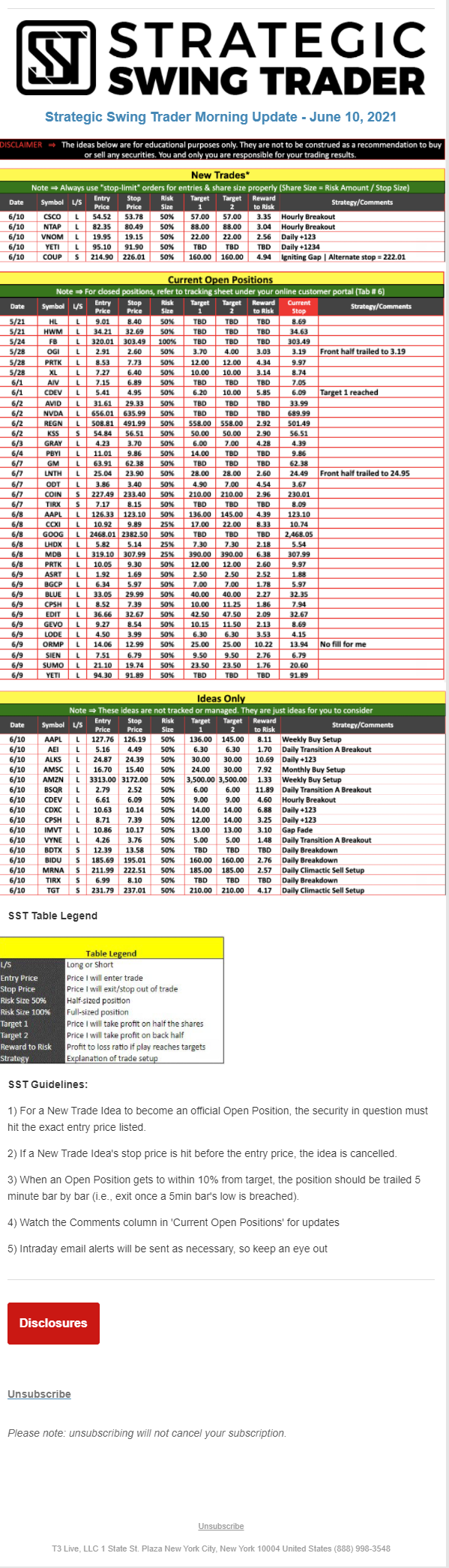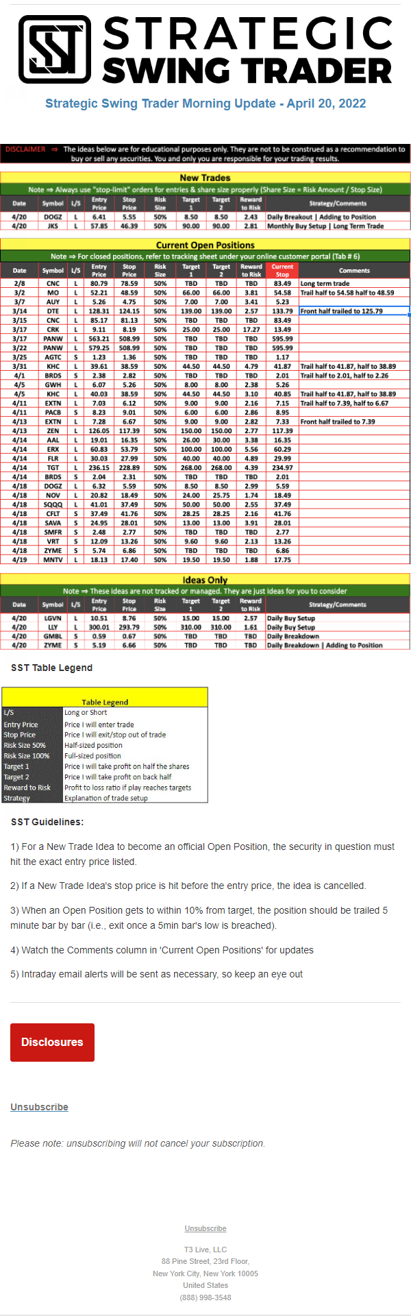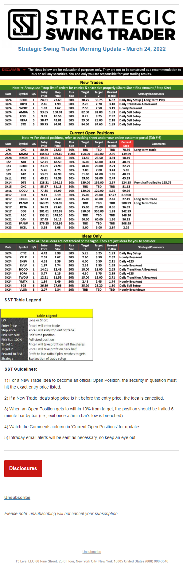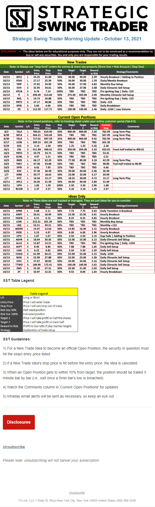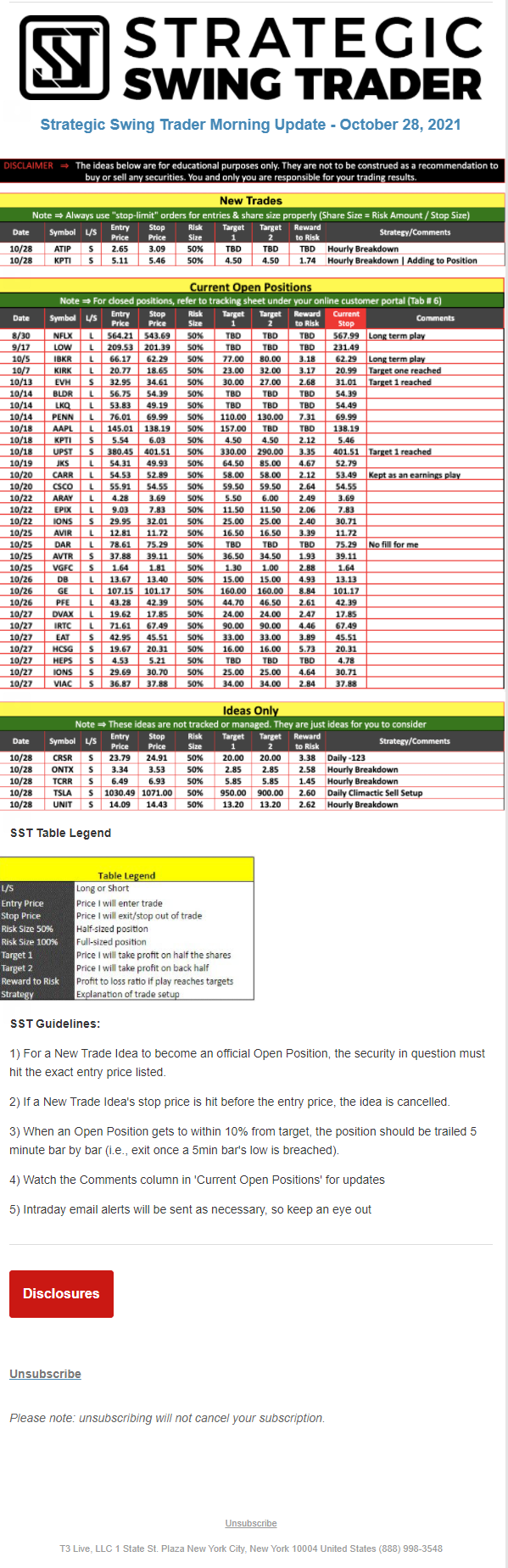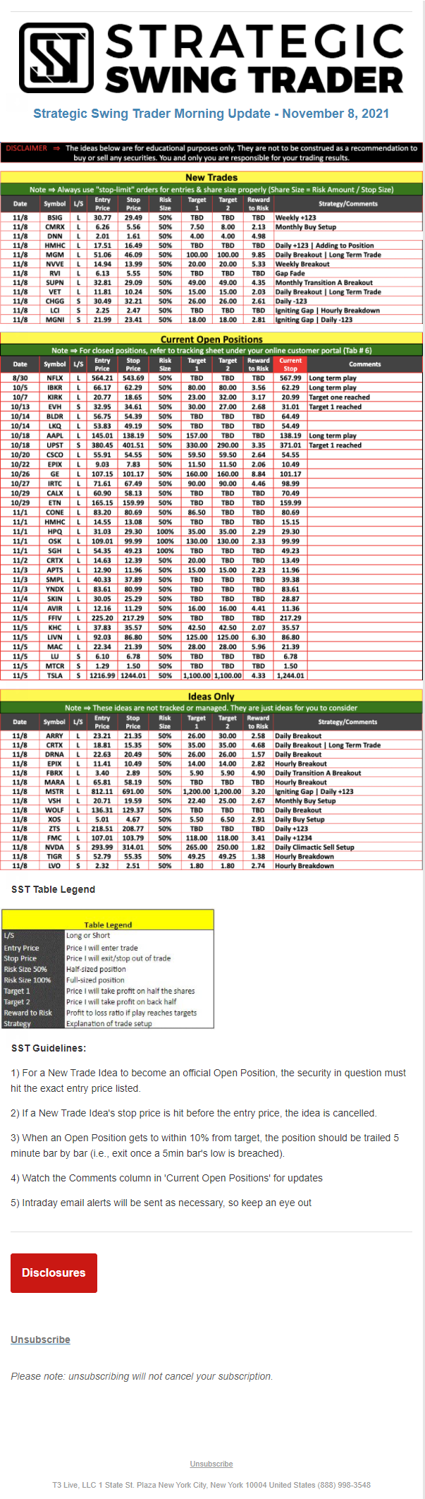 The programs that T3 Live distributes (including the “Virtual Trading Floor®,” articles, commentary, videos, blogs and social media postings) are for informational and educational purposes only. No one should consider the information disseminated by T3 Live to be personalized investment advice, a recommendation to buy, sell or hold any investment, an offer (or a solicitation of an offer) to buy or sell any investment, or the provision of any other kind of advice that would require T3 Live to register as a broker-dealer, investment adviser or similar entity. No one associated with T3 Live is authorized to make any representation to the contrary.