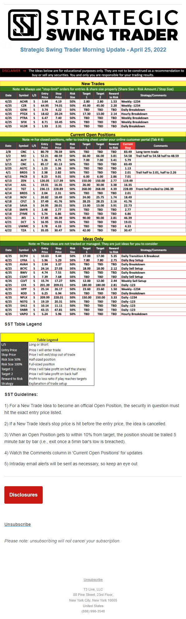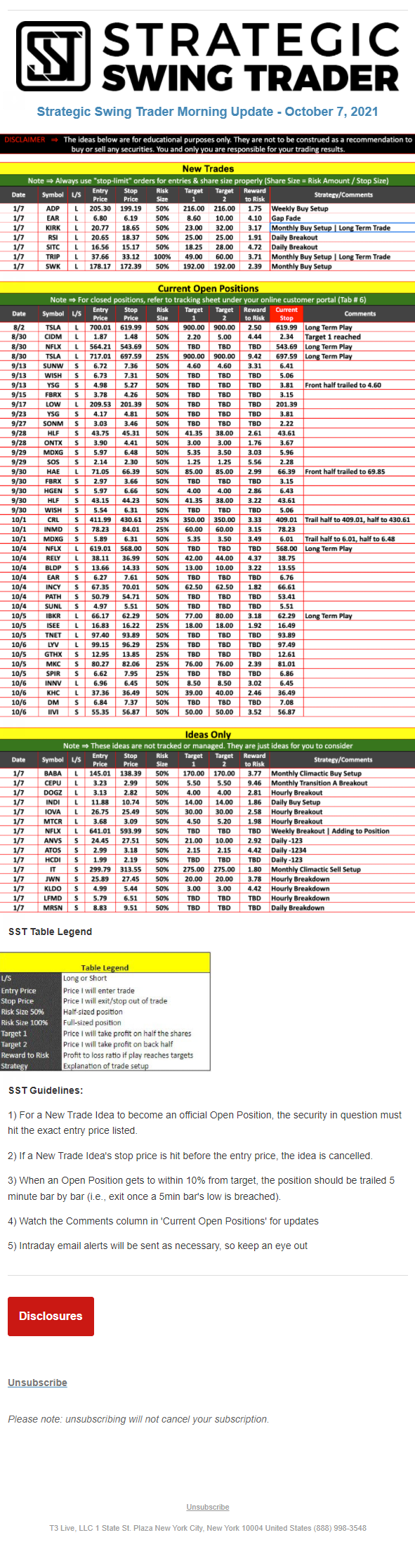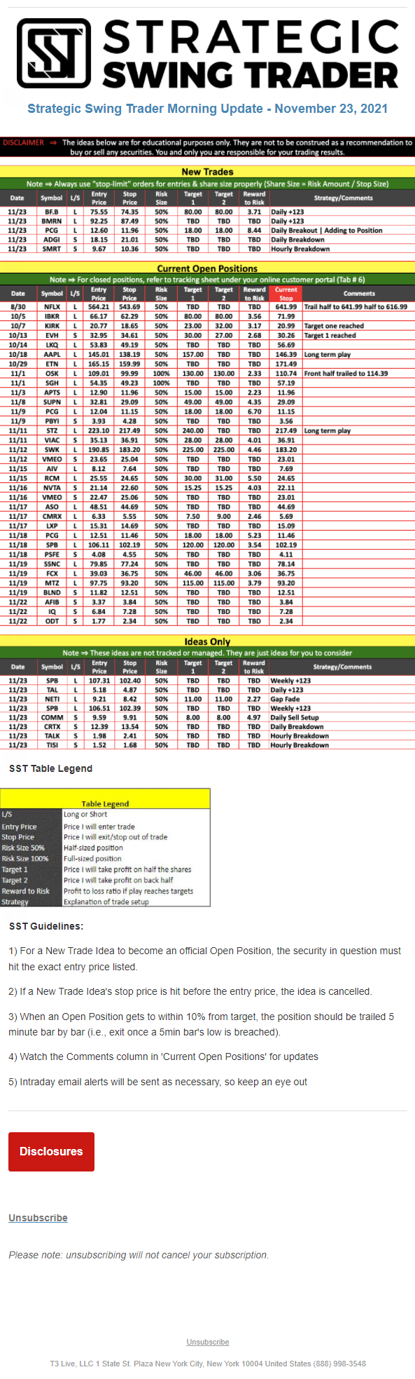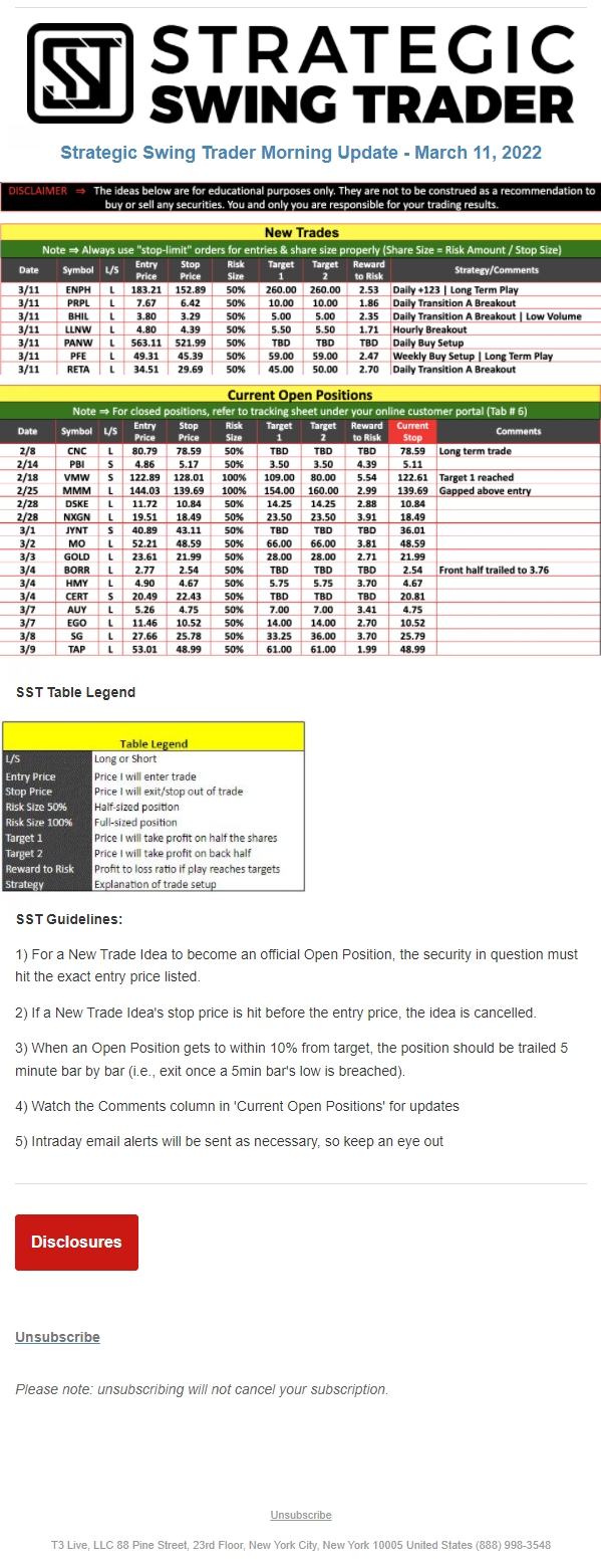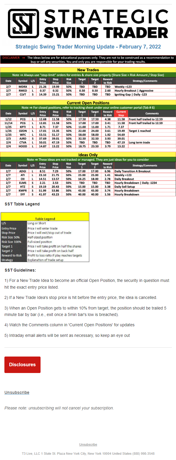 The programs that T3 Live distributes (including the “Virtual Trading Floor®,” articles, commentary, videos, blogs and social media postings) are for informational and educational purposes only. No one should consider the information disseminated by T3 Live to be personalized investment advice, a recommendation to buy, sell or hold any investment, an offer (or a solicitation of an offer) to buy or sell any investment, or the provision of any other kind of advice that would require T3 Live to register as a broker-dealer, investment adviser or similar entity. No one associated with T3 Live is authorized to make any representation to the contrary.