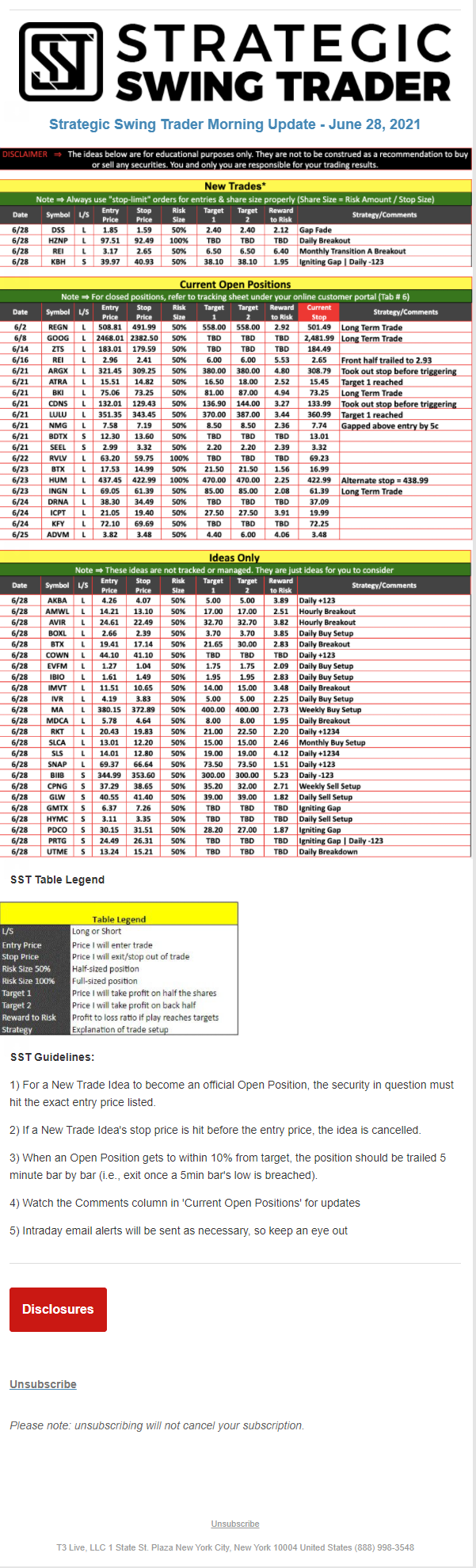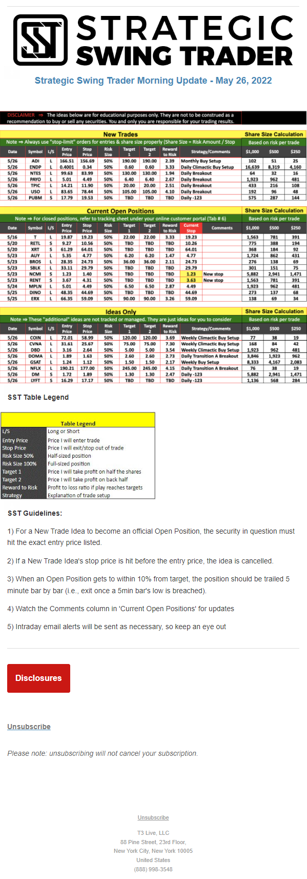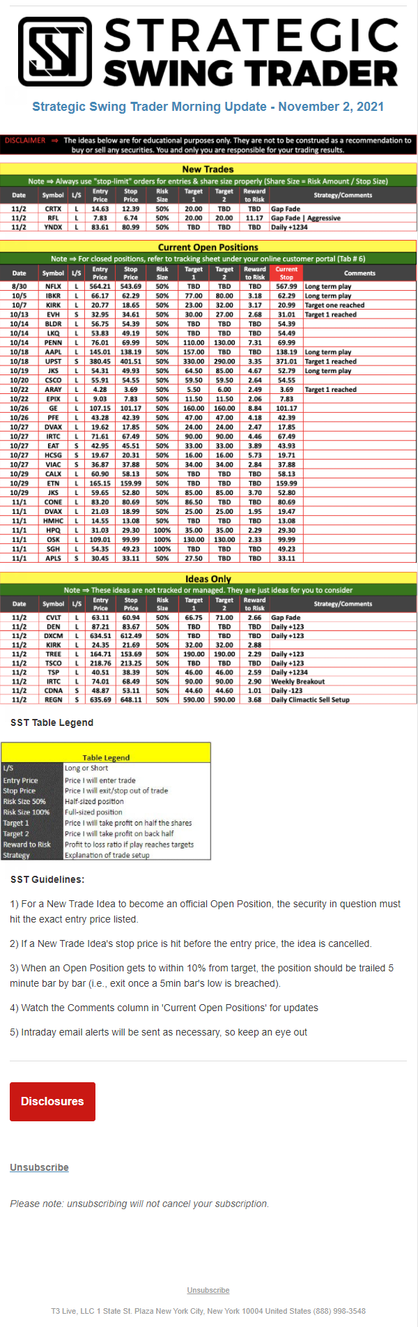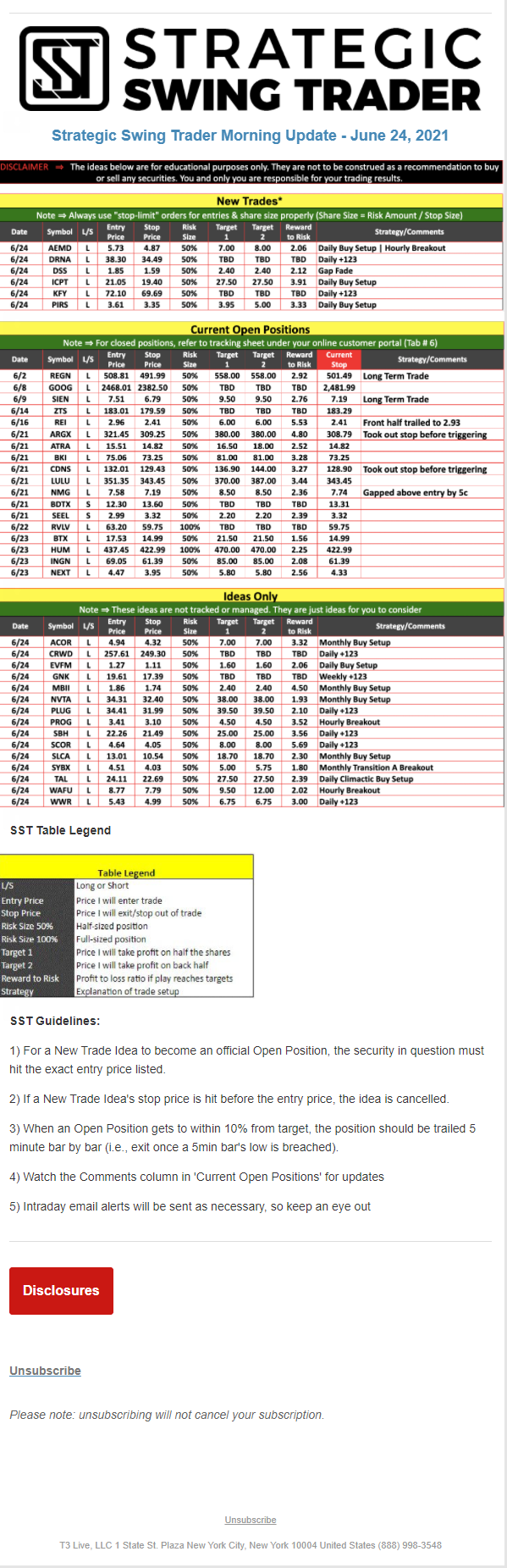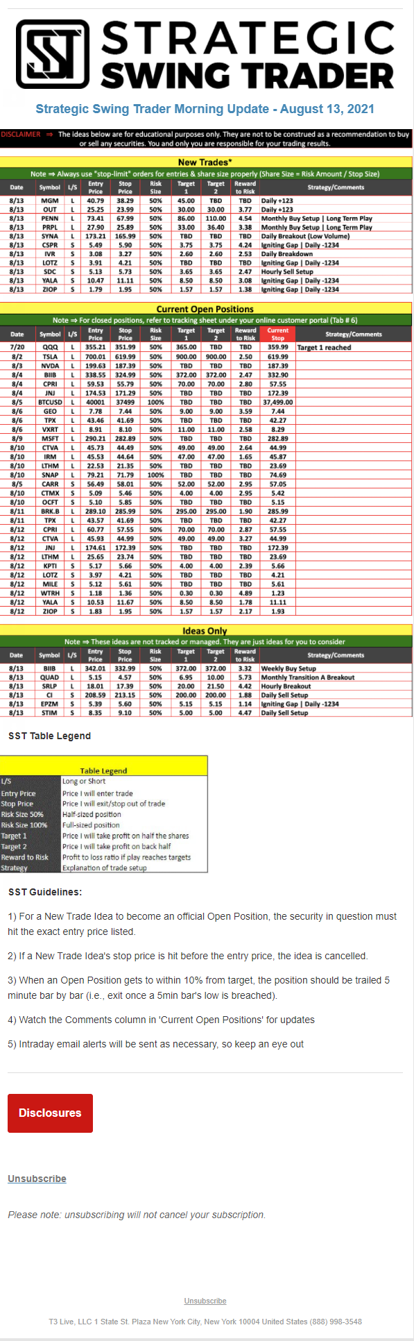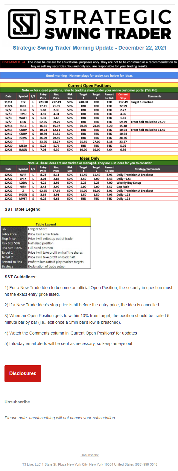 The programs that T3 Live distributes (including the “Virtual Trading Floor®,” articles, commentary, videos, blogs and social media postings) are for informational and educational purposes only. No one should consider the information disseminated by T3 Live to be personalized investment advice, a recommendation to buy, sell or hold any investment, an offer (or a solicitation of an offer) to buy or sell any investment, or the provision of any other kind of advice that would require T3 Live to register as a broker-dealer, investment adviser or similar entity. No one associated with T3 Live is authorized to make any representation to the contrary.