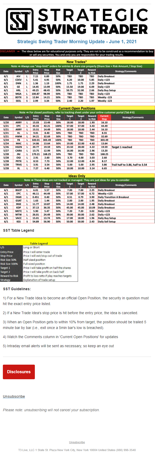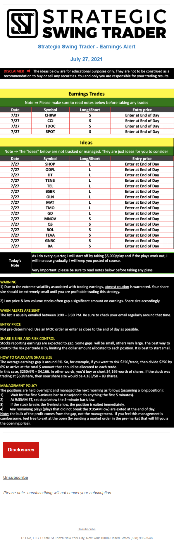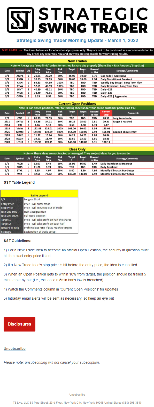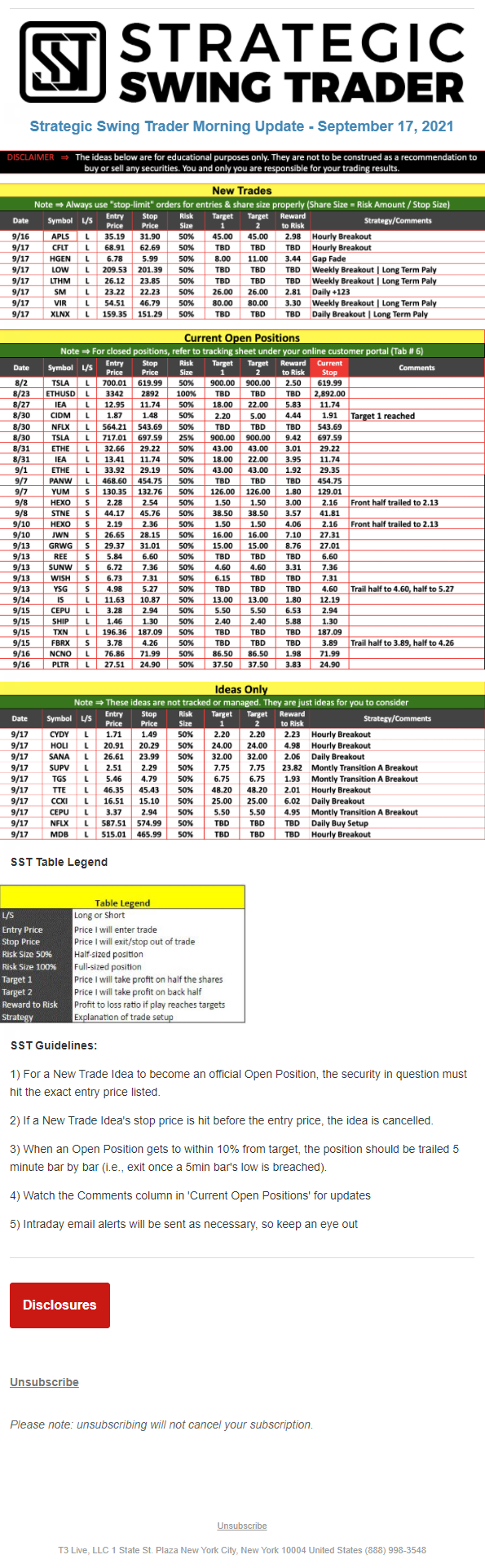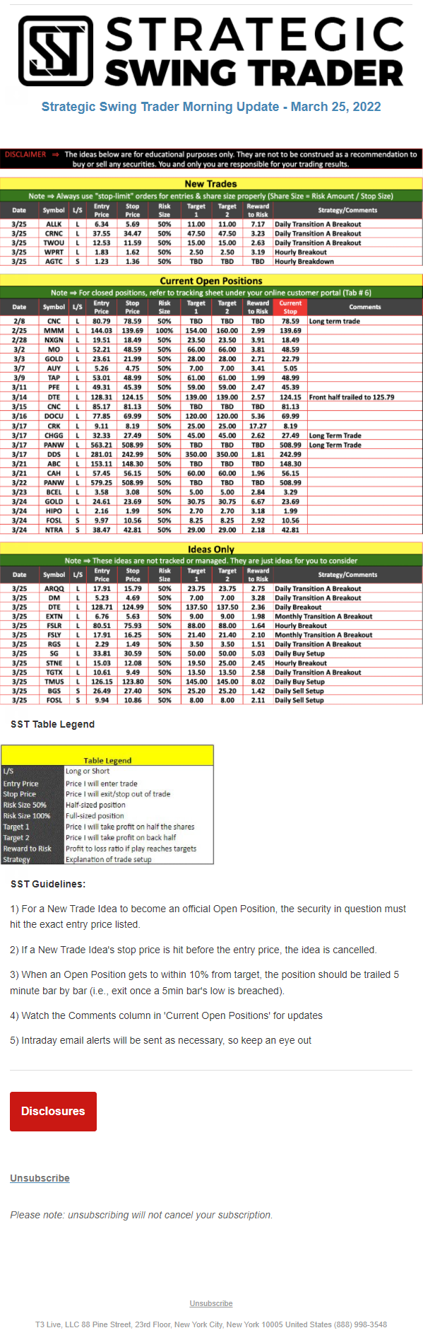The programs that T3 Live distributes (including the “Virtual Trading Floor®,” articles, commentary, videos, blogs and social media postings) are for informational and educational purposes only. No one should consider the information disseminated by T3 Live to be personalized investment advice, a recommendation to buy, sell or hold any investment, an offer (or a solicitation of an offer) to buy or sell any investment, or the provision of any other kind of advice that would require T3 Live to register as a broker-dealer, investment adviser or similar entity. No one associated with T3 Live is authorized to make any representation to the contrary.