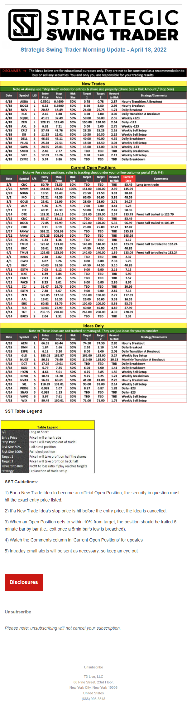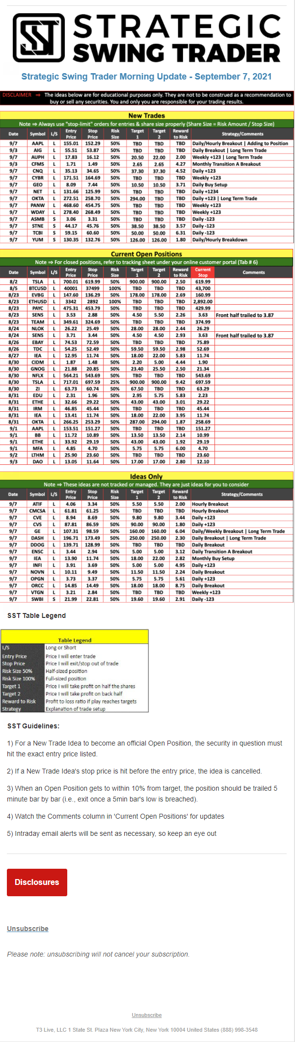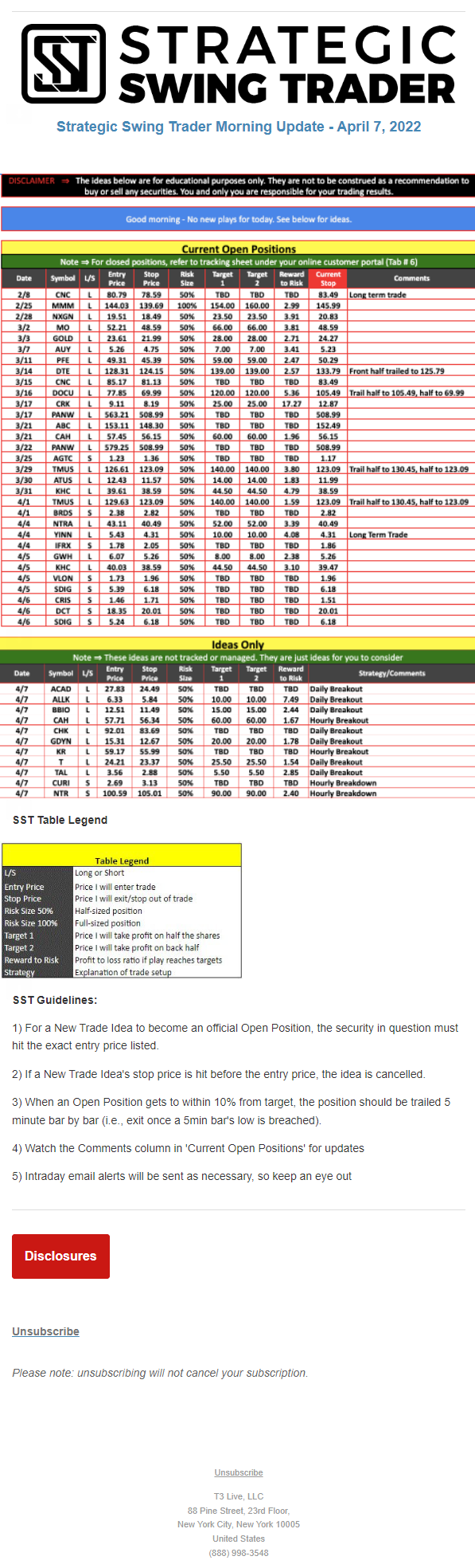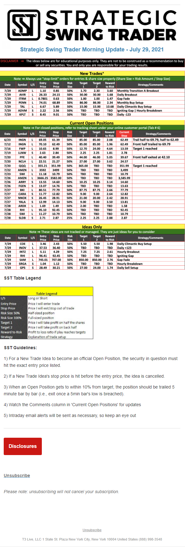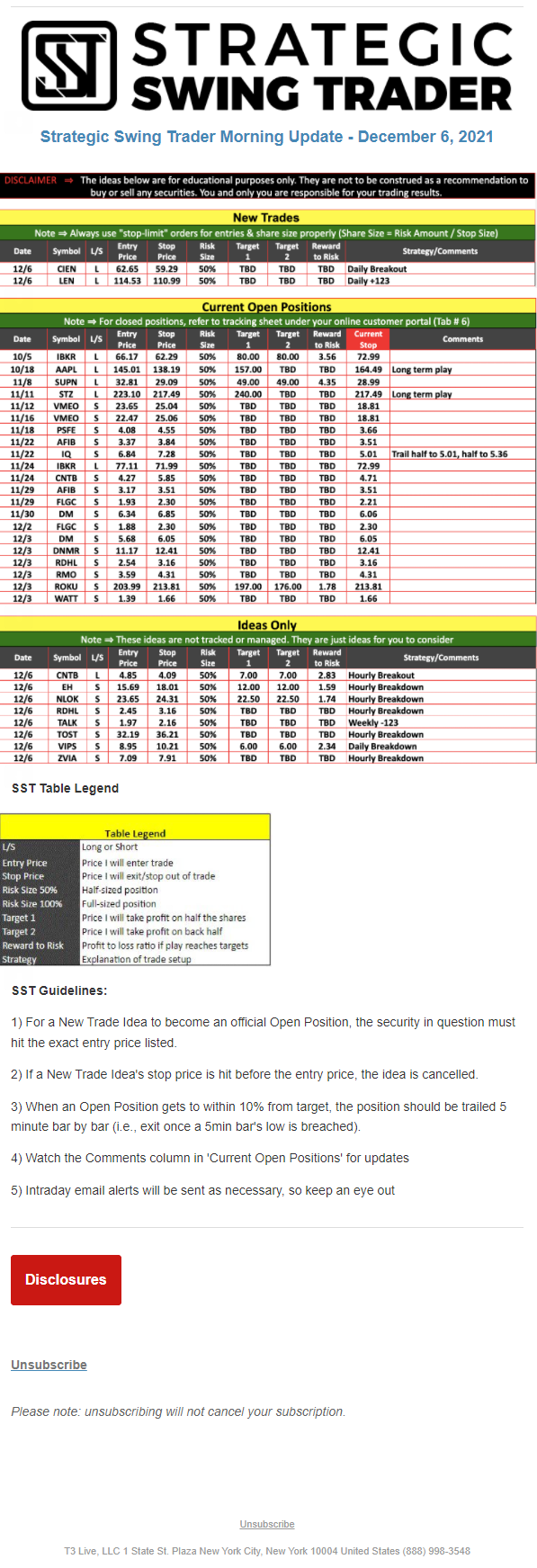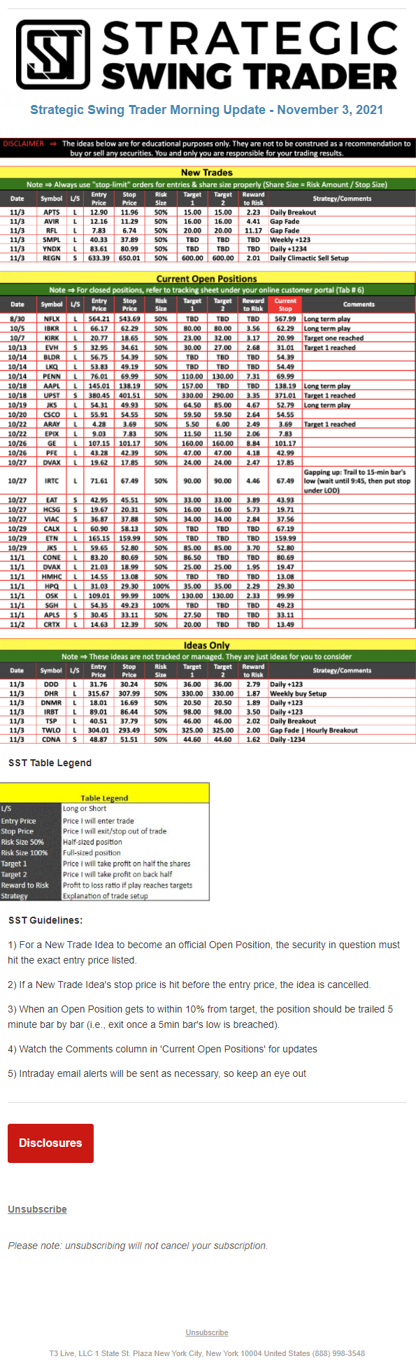 The programs that T3 Live distributes (including the “Virtual Trading Floor®,” articles, commentary, videos, blogs and social media postings) are for informational and educational purposes only. No one should consider the information disseminated by T3 Live to be personalized investment advice, a recommendation to buy, sell or hold any investment, an offer (or a solicitation of an offer) to buy or sell any investment, or the provision of any other kind of advice that would require T3 Live to register as a broker-dealer, investment adviser or similar entity. No one associated with T3 Live is authorized to make any representation to the contrary.