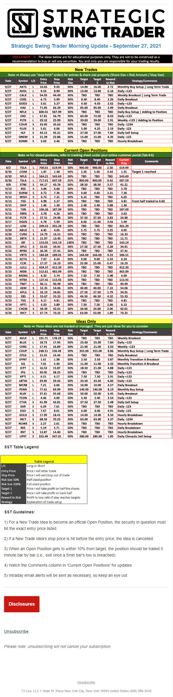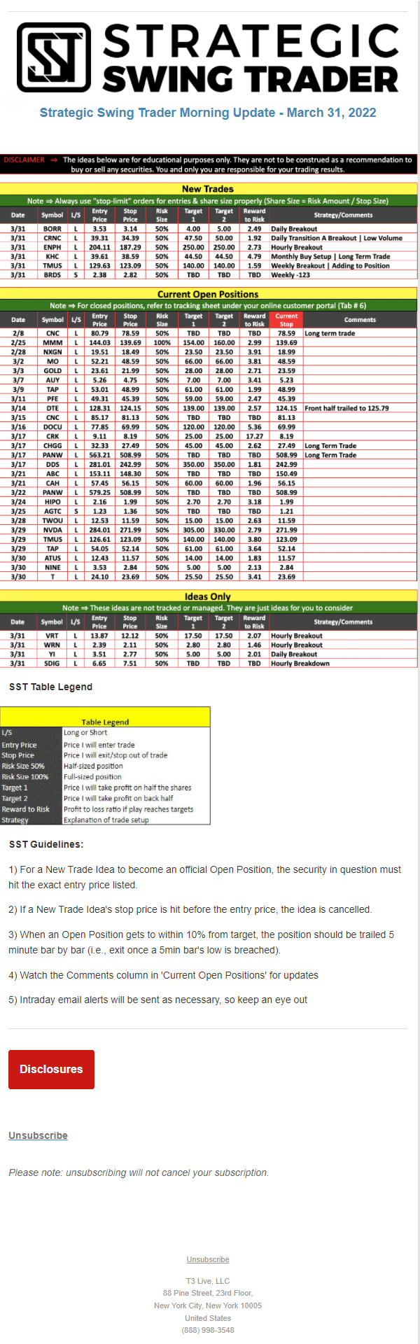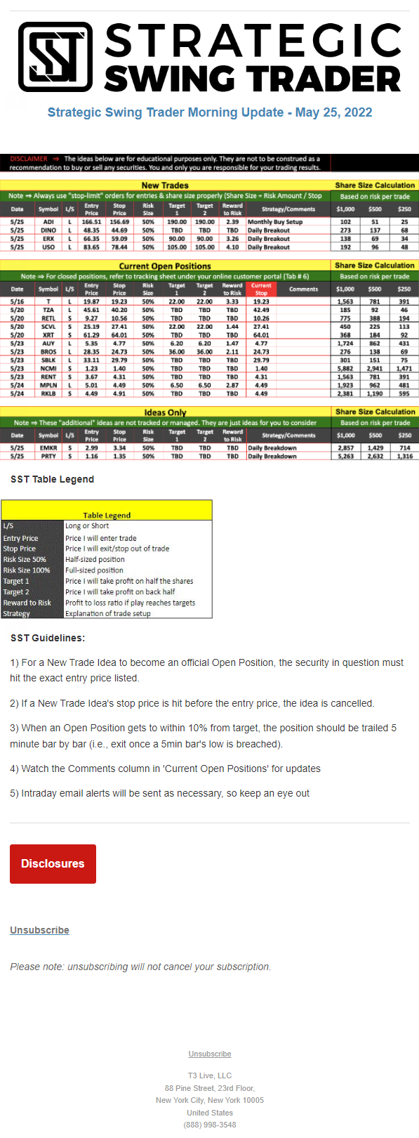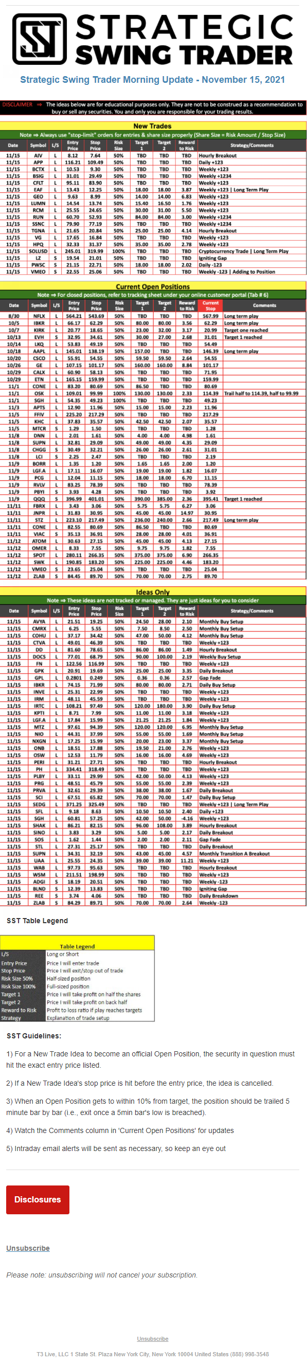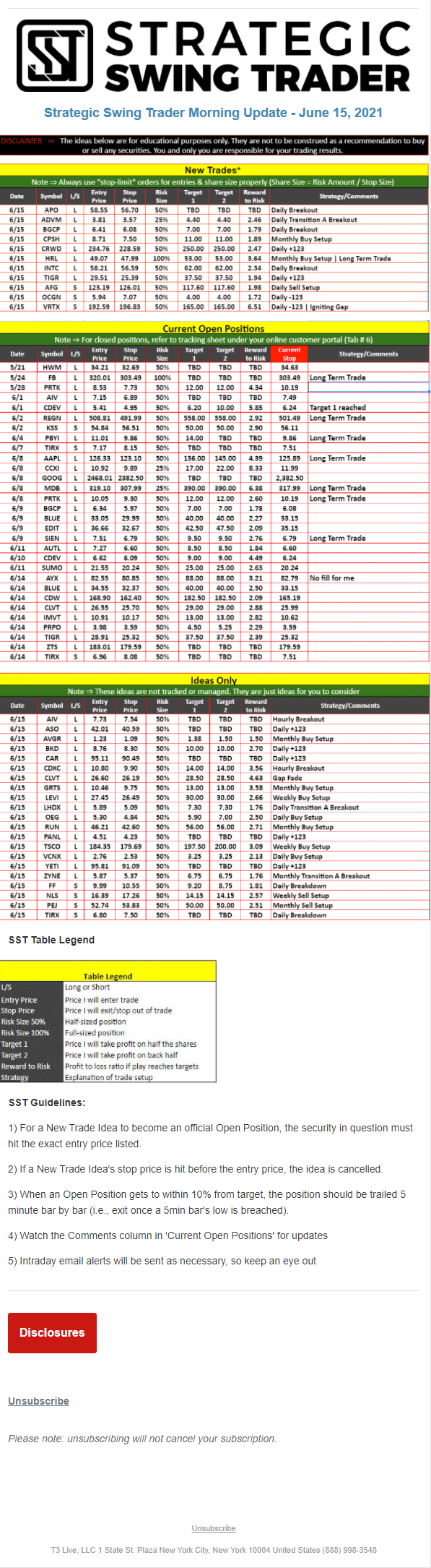 The programs that T3 Live distributes (including the “Virtual Trading Floor®,” articles, commentary, videos, blogs and social media postings) are for informational and educational purposes only. No one should consider the information disseminated by T3 Live to be personalized investment advice, a recommendation to buy, sell or hold any investment, an offer (or a solicitation of an offer) to buy or sell any investment, or the provision of any other kind of advice that would require T3 Live to register as a broker-dealer, investment adviser or similar entity. No one associated with T3 Live is authorized to make any representation to the contrary.