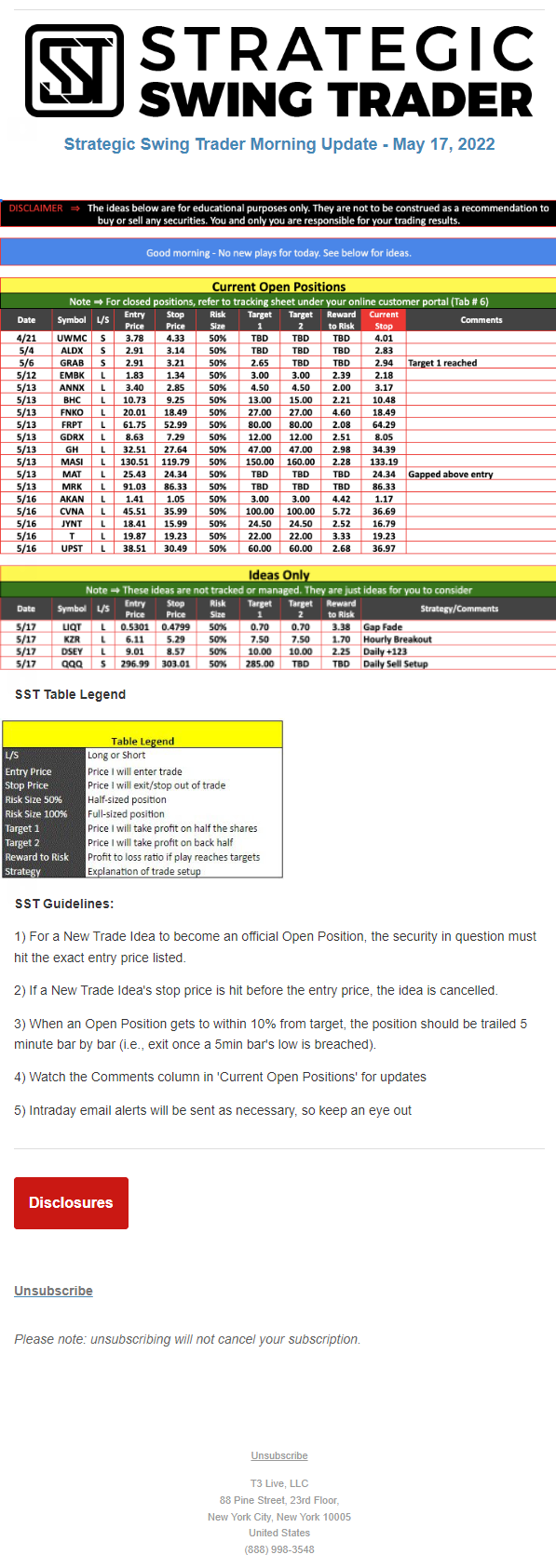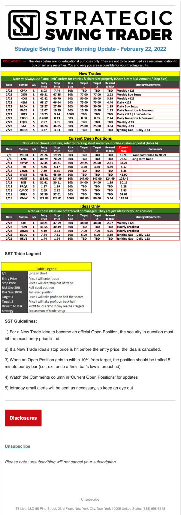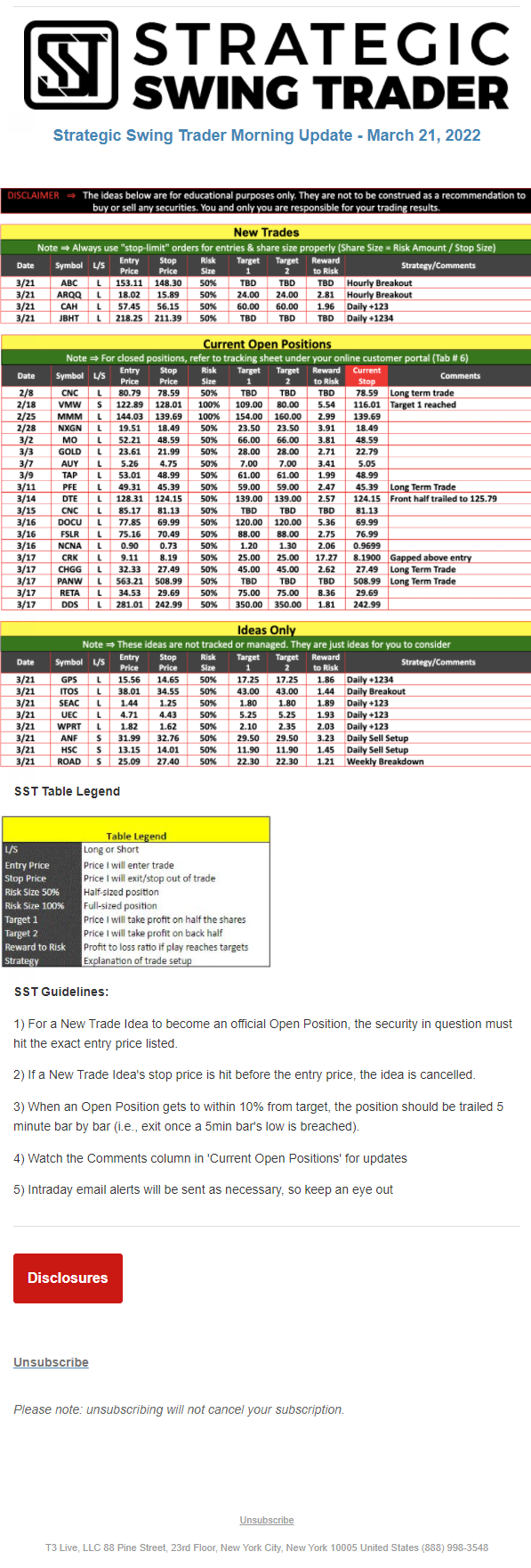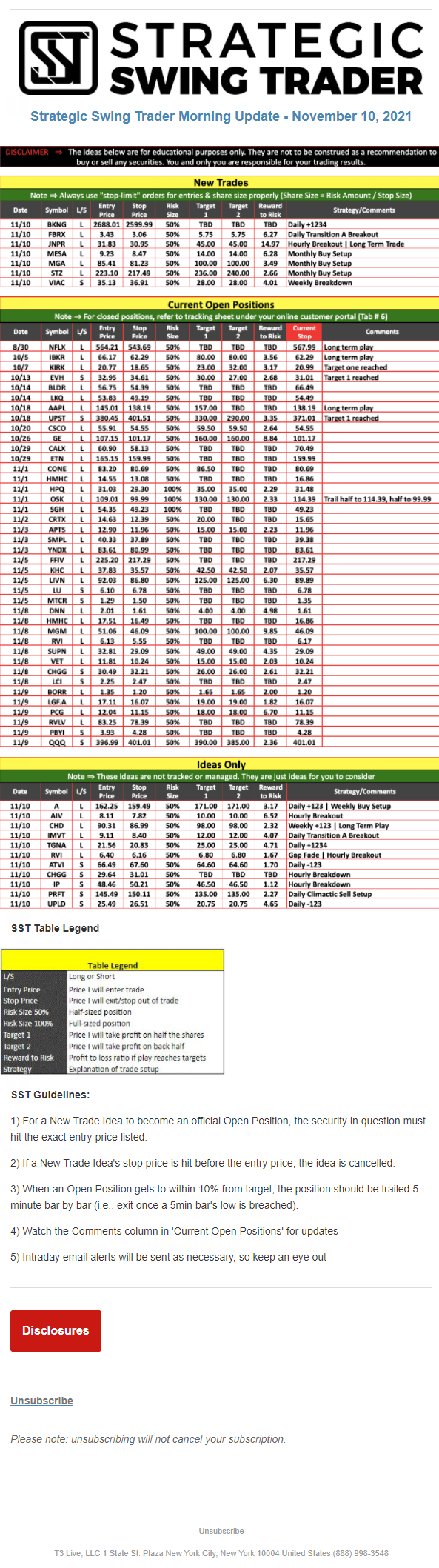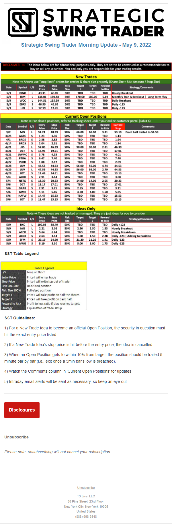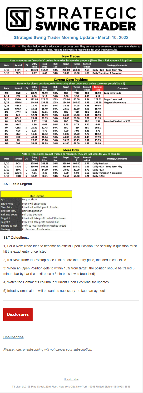The programs that T3 Live distributes (including the “Virtual Trading Floor®,” articles, commentary, videos, blogs and social media postings) are for informational and educational purposes only. No one should consider the information disseminated by T3 Live to be personalized investment advice, a recommendation to buy, sell or hold any investment, an offer (or a solicitation of an offer) to buy or sell any investment, or the provision of any other kind of advice that would require T3 Live to register as a broker-dealer, investment adviser or similar entity. No one associated with T3 Live is authorized to make any representation to the contrary.