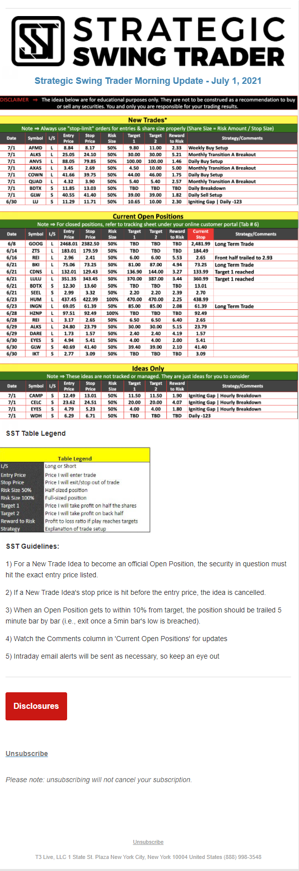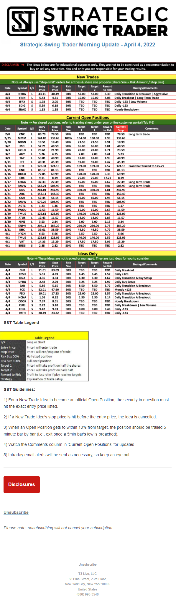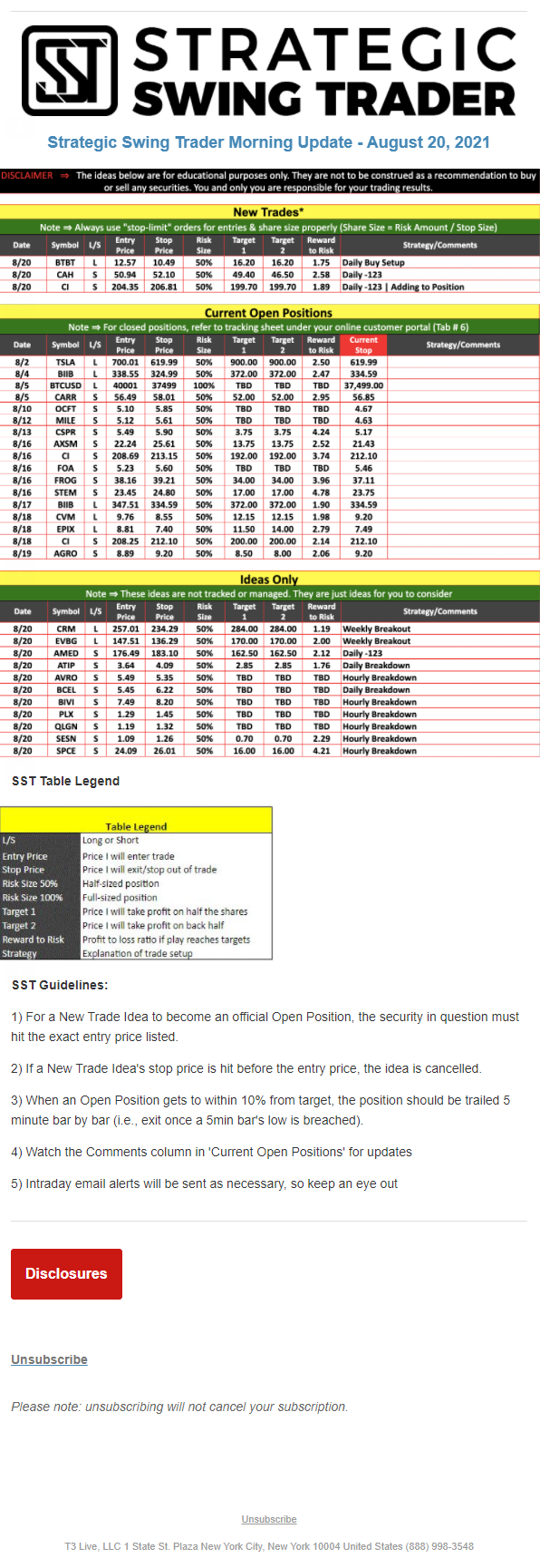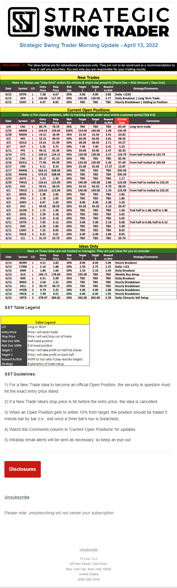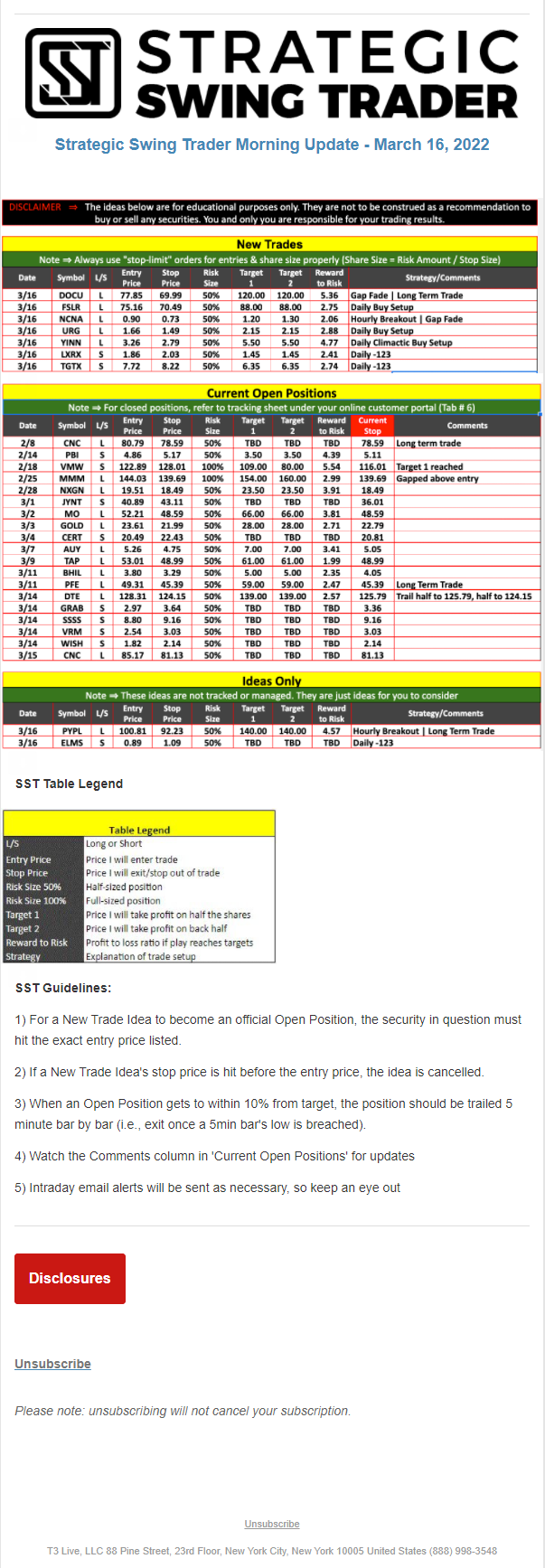 The programs that T3 Live distributes (including the “Virtual Trading Floor®,” articles, commentary, videos, blogs and social media postings) are for informational and educational purposes only. No one should consider the information disseminated by T3 Live to be personalized investment advice, a recommendation to buy, sell or hold any investment, an offer (or a solicitation of an offer) to buy or sell any investment, or the provision of any other kind of advice that would require T3 Live to register as a broker-dealer, investment adviser or similar entity. No one associated with T3 Live is authorized to make any representation to the contrary.