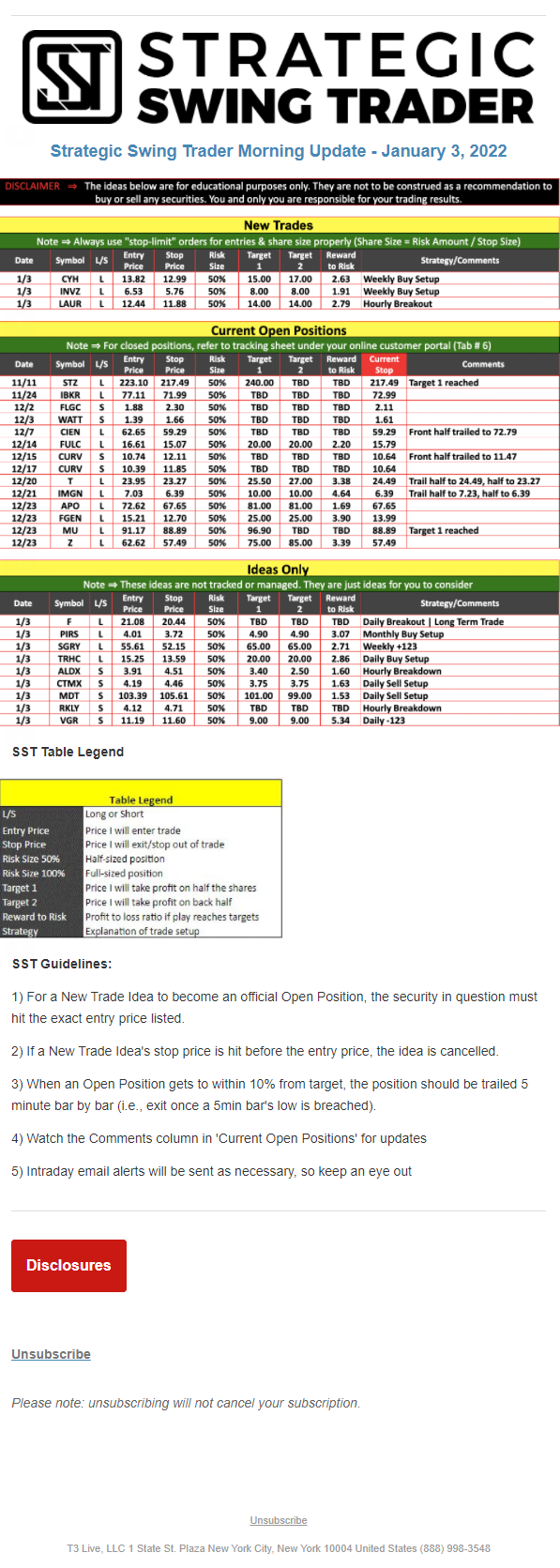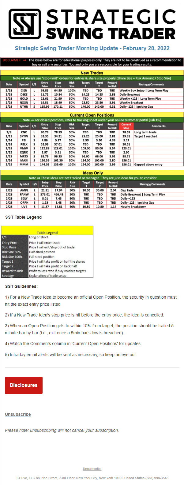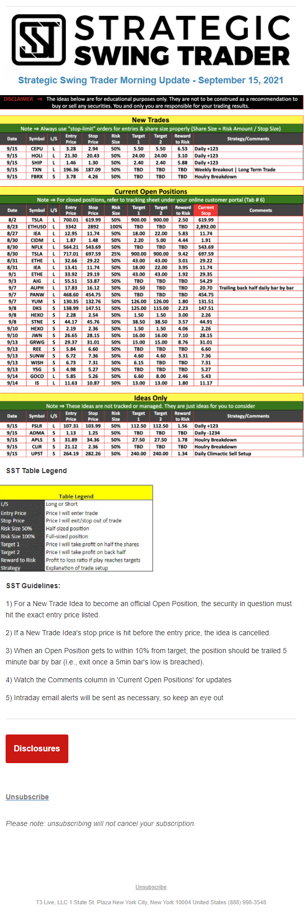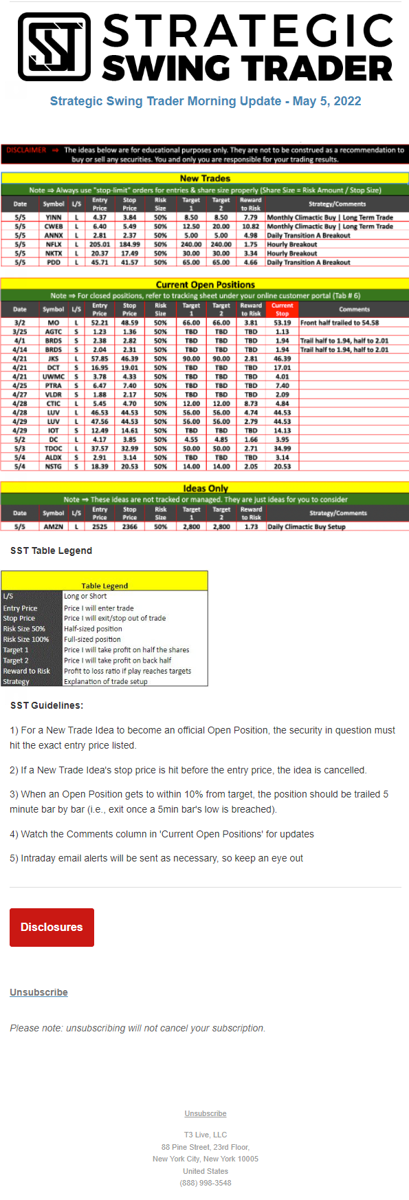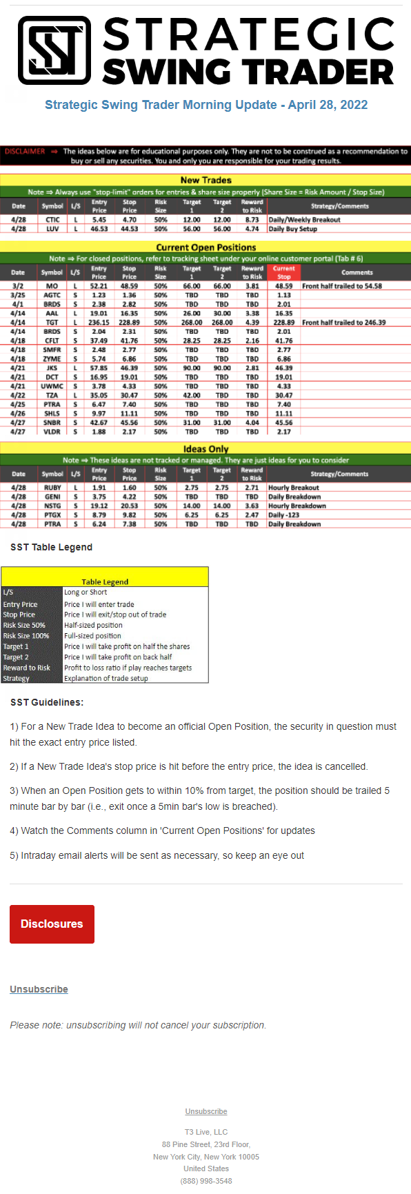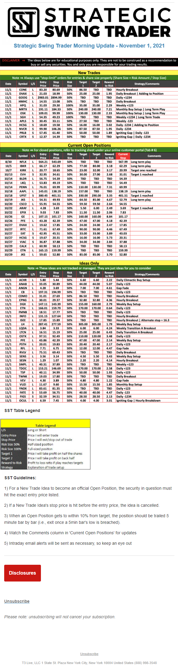 The programs that T3 Live distributes (including the “Virtual Trading Floor®,” articles, commentary, videos, blogs and social media postings) are for informational and educational purposes only. No one should consider the information disseminated by T3 Live to be personalized investment advice, a recommendation to buy, sell or hold any investment, an offer (or a solicitation of an offer) to buy or sell any investment, or the provision of any other kind of advice that would require T3 Live to register as a broker-dealer, investment adviser or similar entity. No one associated with T3 Live is authorized to make any representation to the contrary.