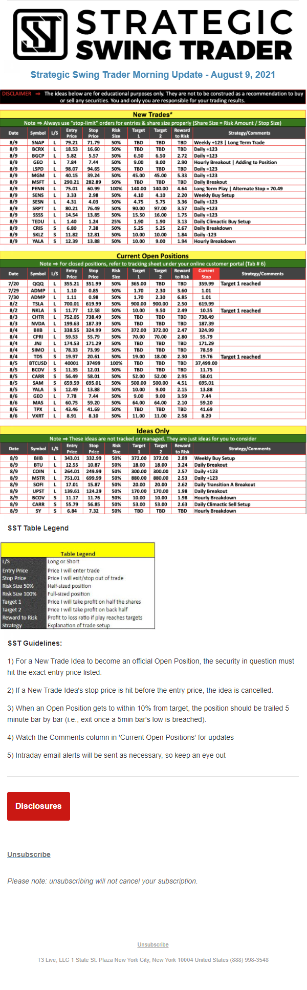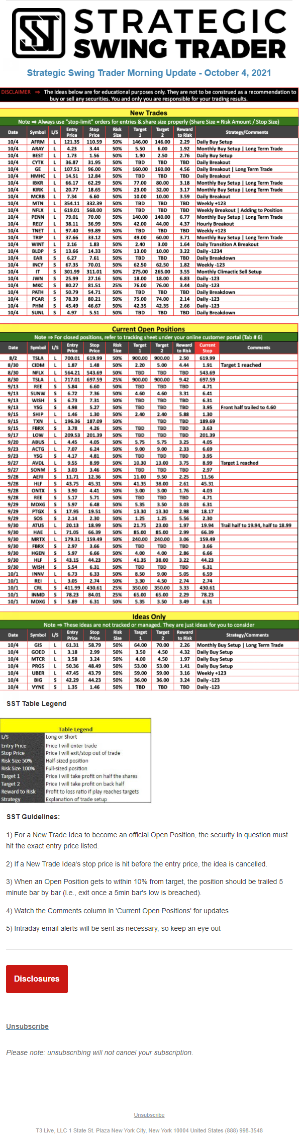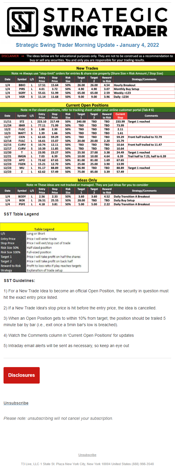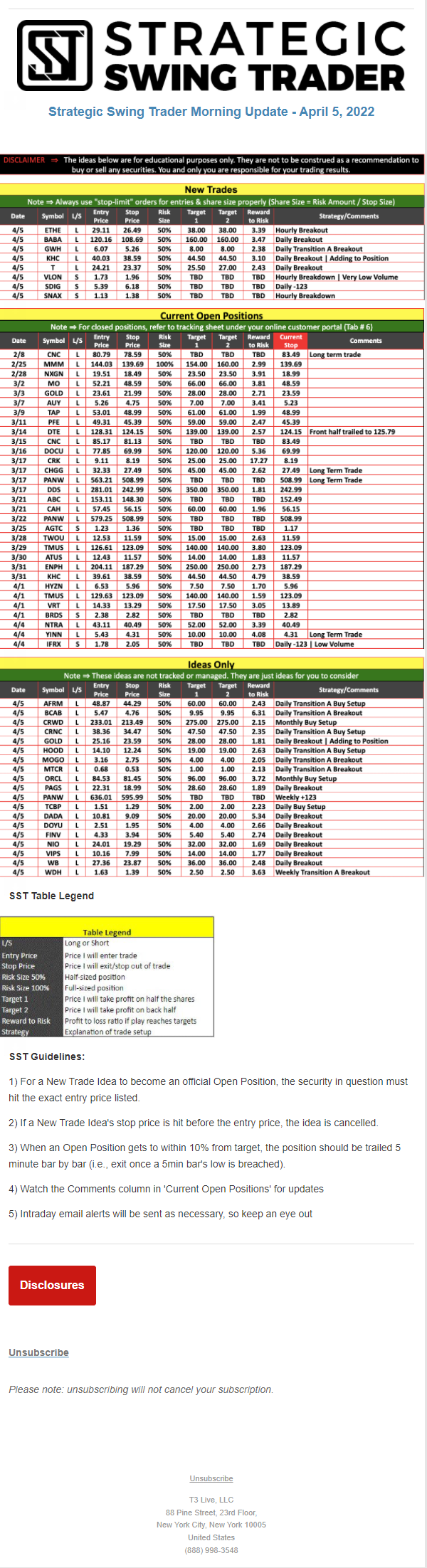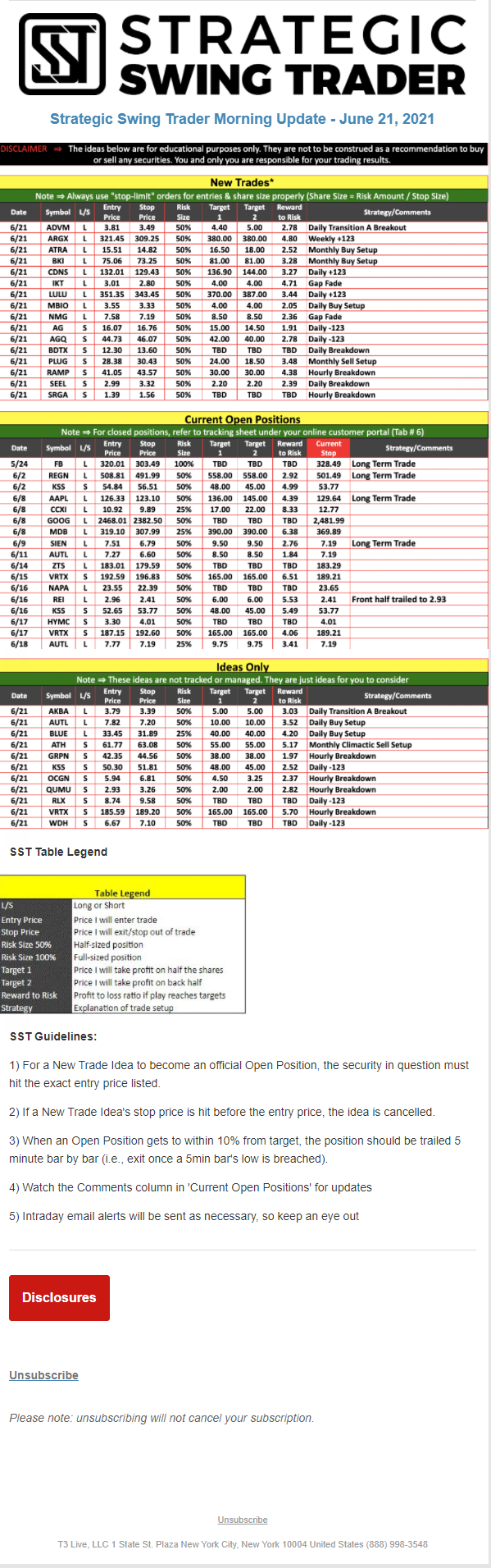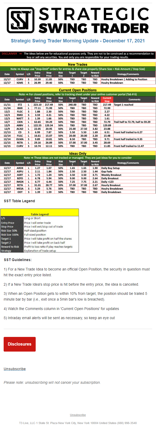 The programs that T3 Live distributes (including the “Virtual Trading Floor®,” articles, commentary, videos, blogs and social media postings) are for informational and educational purposes only. No one should consider the information disseminated by T3 Live to be personalized investment advice, a recommendation to buy, sell or hold any investment, an offer (or a solicitation of an offer) to buy or sell any investment, or the provision of any other kind of advice that would require T3 Live to register as a broker-dealer, investment adviser or similar entity. No one associated with T3 Live is authorized to make any representation to the contrary.