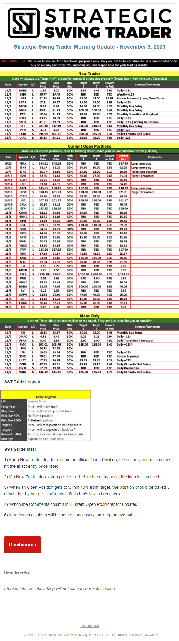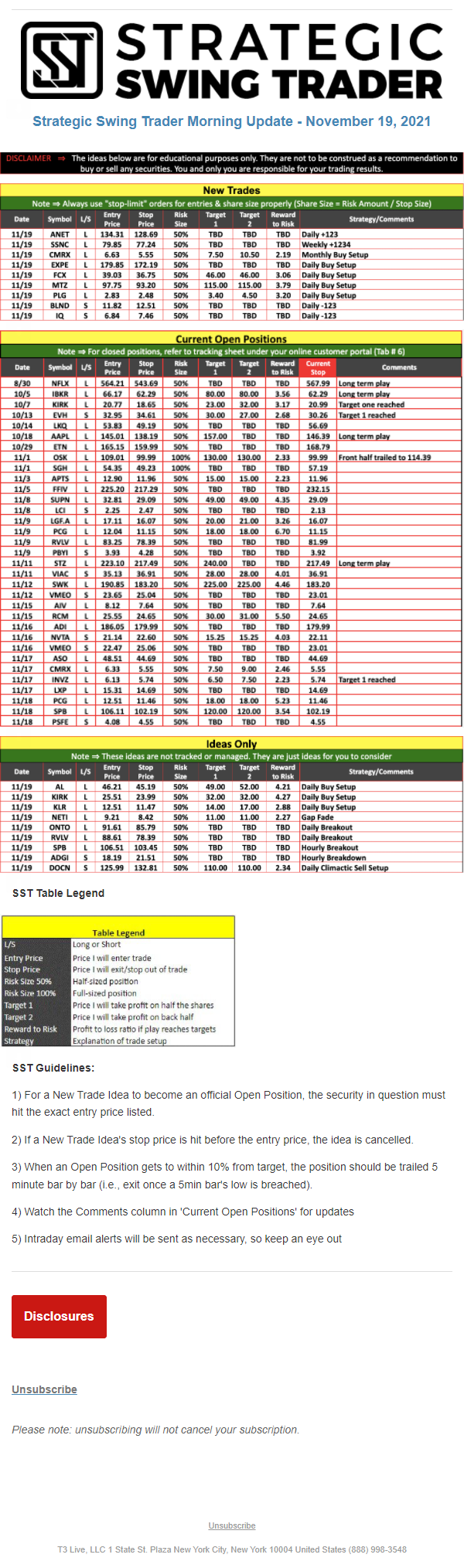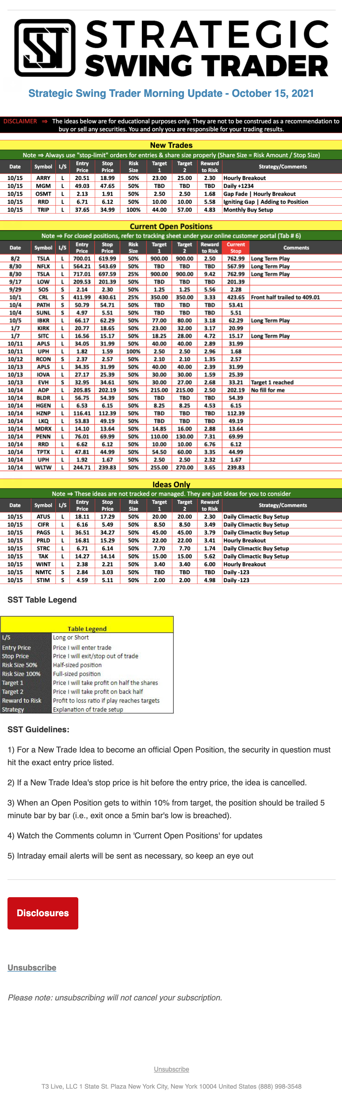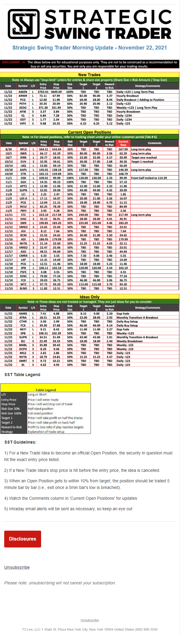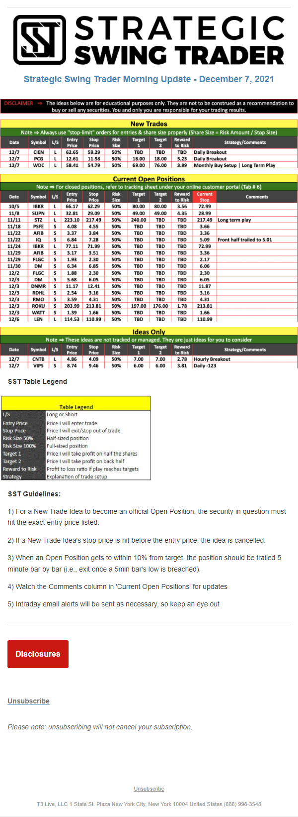 The programs that T3 Live distributes (including the “Virtual Trading Floor®,” articles, commentary, videos, blogs and social media postings) are for informational and educational purposes only. No one should consider the information disseminated by T3 Live to be personalized investment advice, a recommendation to buy, sell or hold any investment, an offer (or a solicitation of an offer) to buy or sell any investment, or the provision of any other kind of advice that would require T3 Live to register as a broker-dealer, investment adviser or similar entity. No one associated with T3 Live is authorized to make any representation to the contrary.