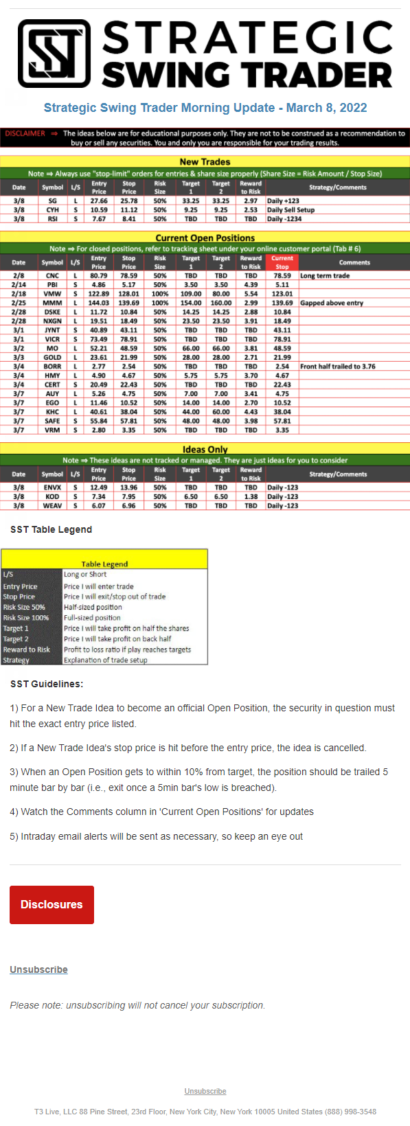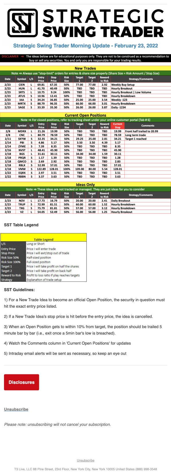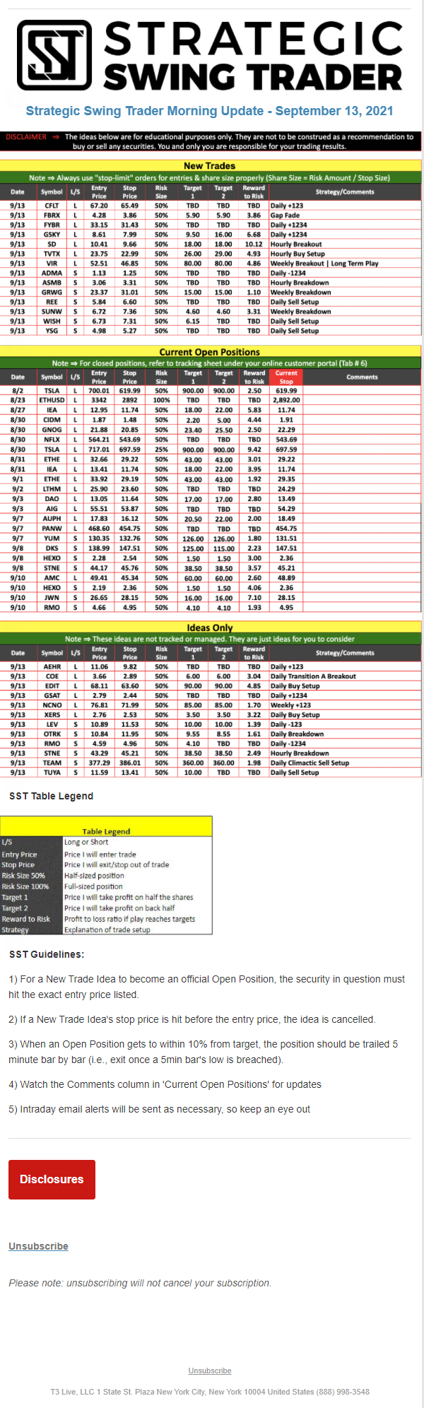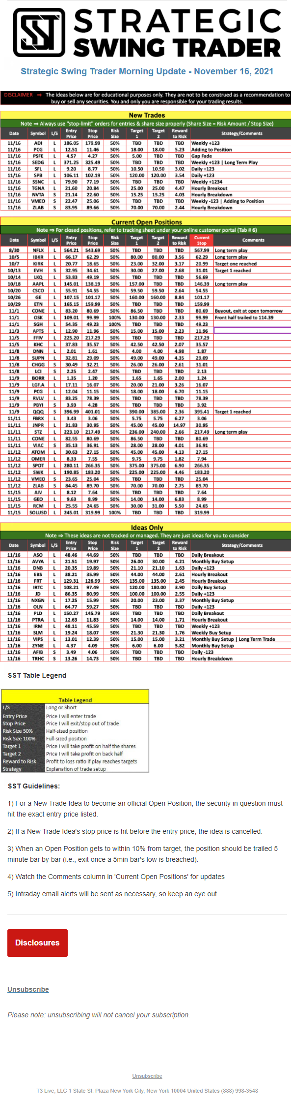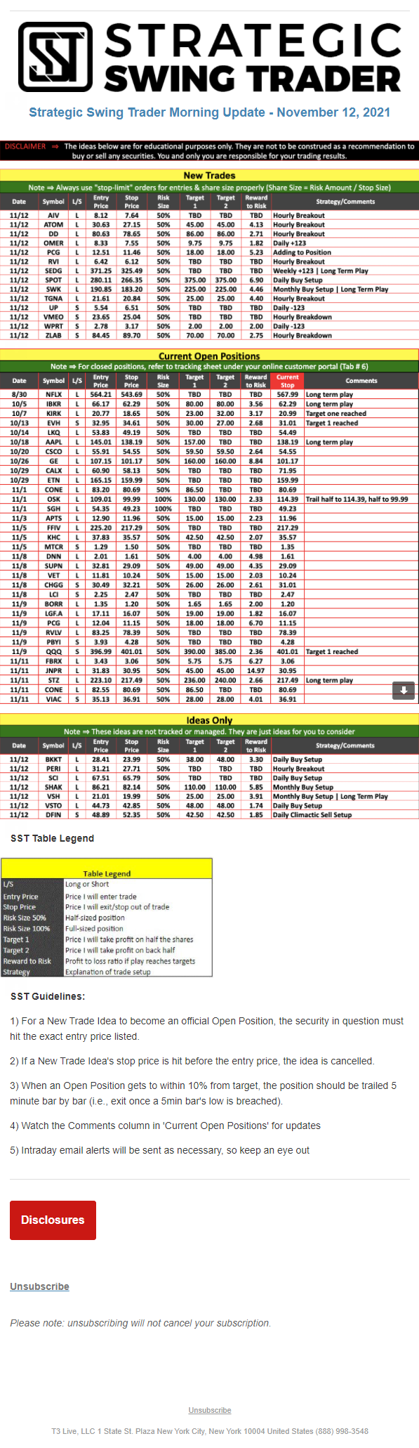 The programs that T3 Live distributes (including the “Virtual Trading Floor®,” articles, commentary, videos, blogs and social media postings) are for informational and educational purposes only. No one should consider the information disseminated by T3 Live to be personalized investment advice, a recommendation to buy, sell or hold any investment, an offer (or a solicitation of an offer) to buy or sell any investment, or the provision of any other kind of advice that would require T3 Live to register as a broker-dealer, investment adviser or similar entity. No one associated with T3 Live is authorized to make any representation to the contrary.