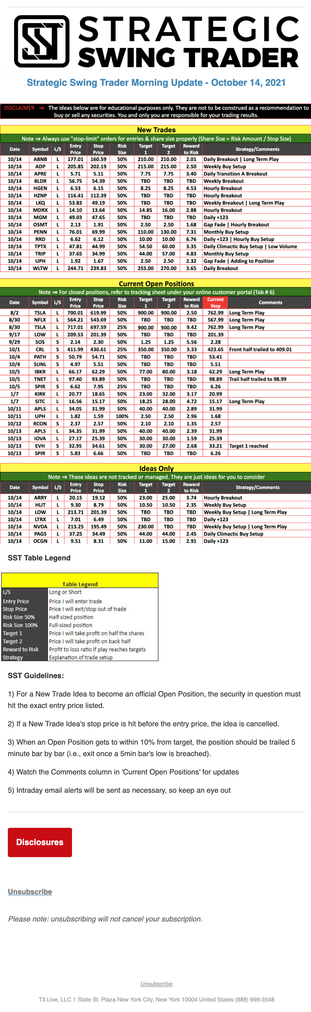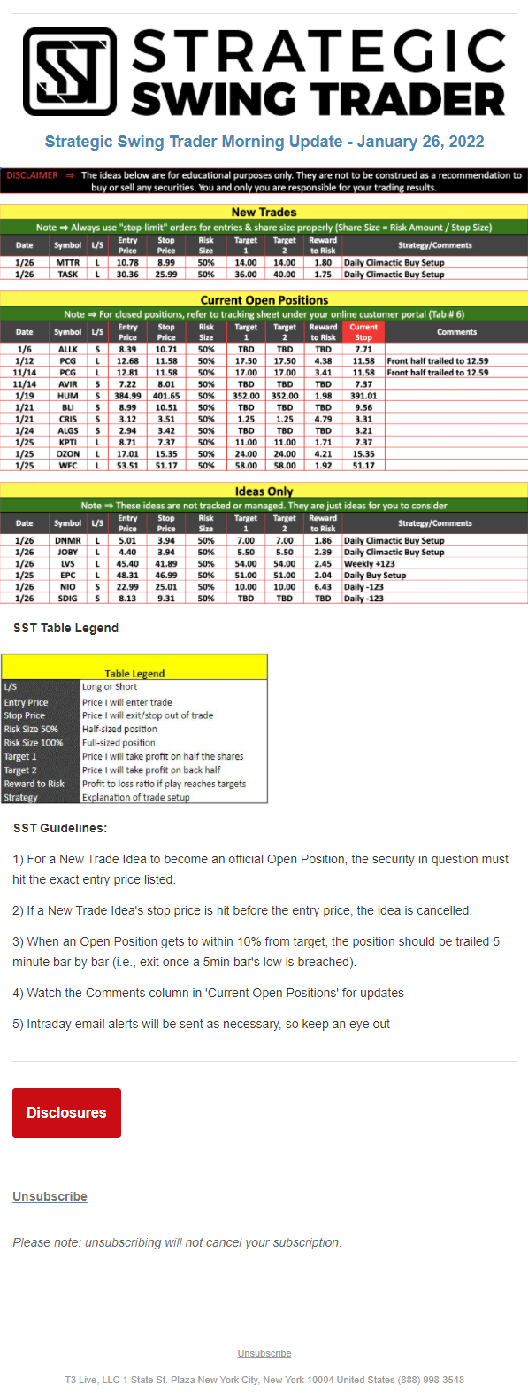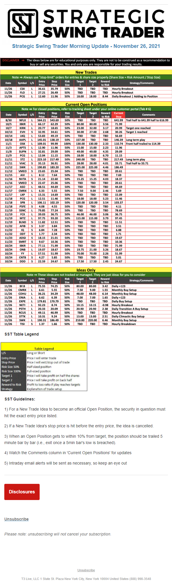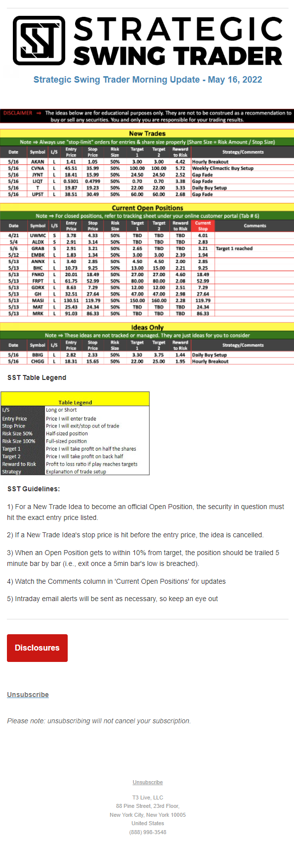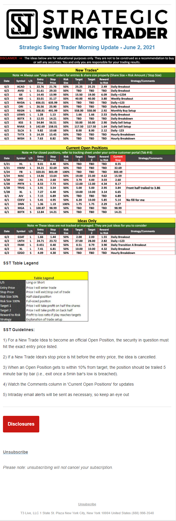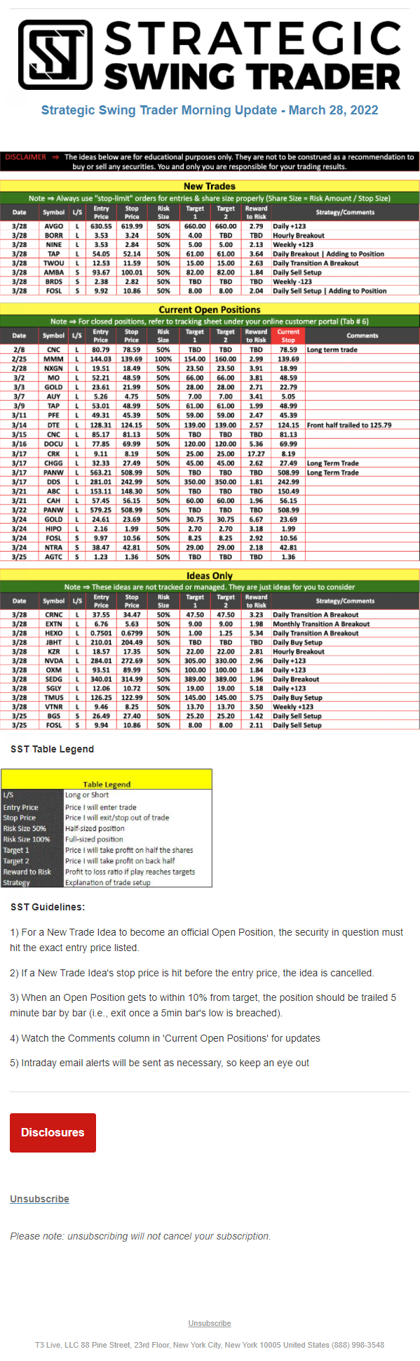 The programs that T3 Live distributes (including the “Virtual Trading Floor®,” articles, commentary, videos, blogs and social media postings) are for informational and educational purposes only. No one should consider the information disseminated by T3 Live to be personalized investment advice, a recommendation to buy, sell or hold any investment, an offer (or a solicitation of an offer) to buy or sell any investment, or the provision of any other kind of advice that would require T3 Live to register as a broker-dealer, investment adviser or similar entity. No one associated with T3 Live is authorized to make any representation to the contrary.