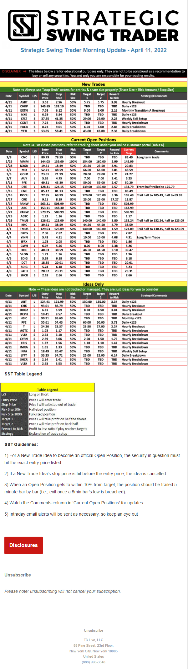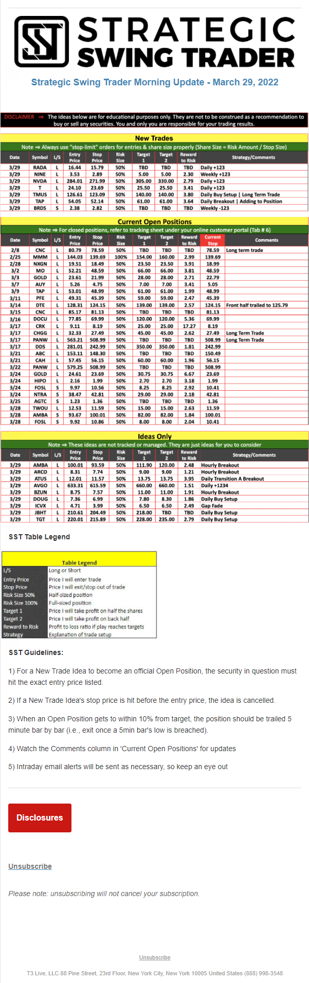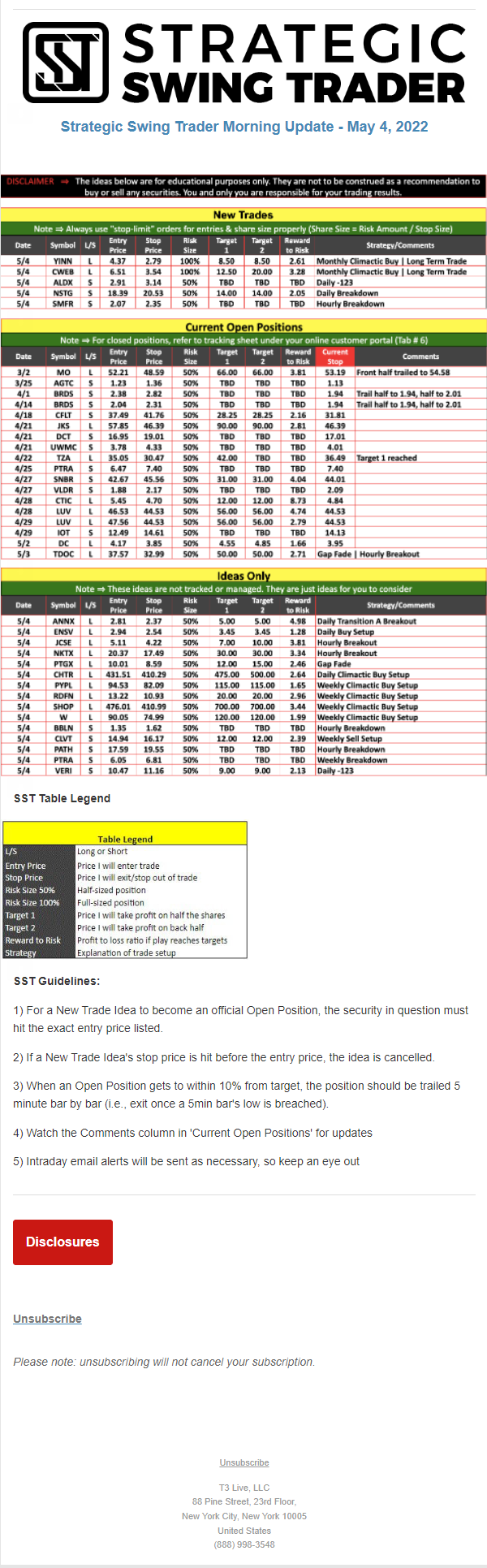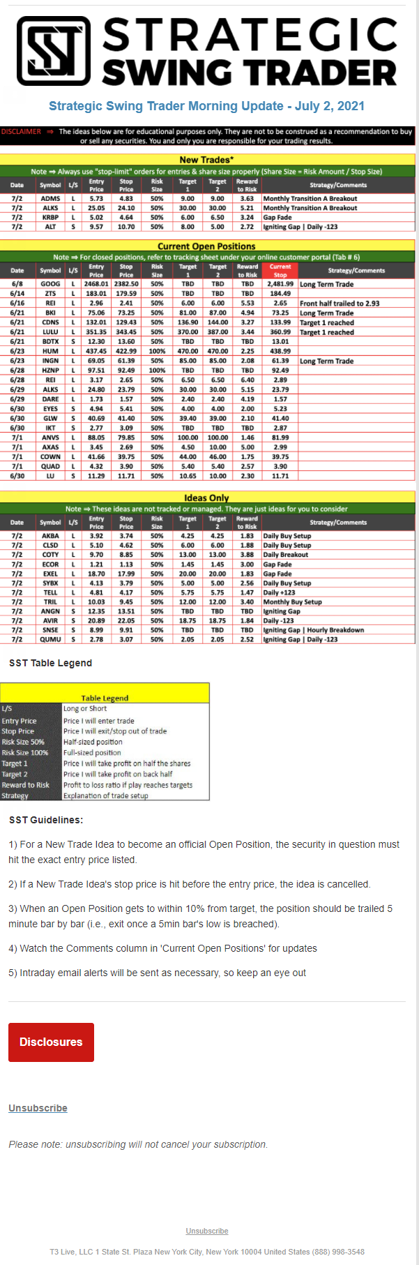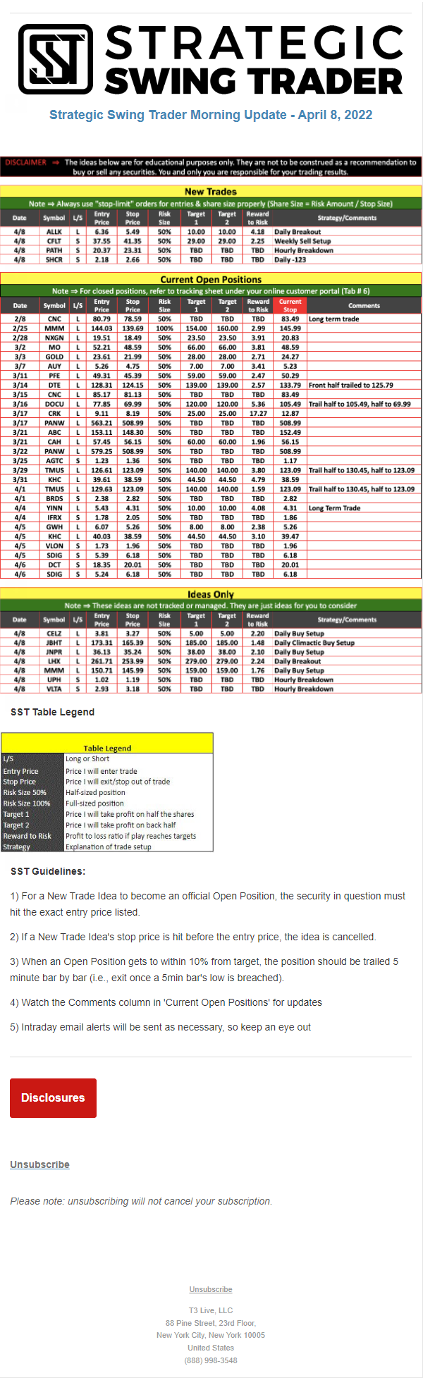 The programs that T3 Live distributes (including the “Virtual Trading Floor®,” articles, commentary, videos, blogs and social media postings) are for informational and educational purposes only. No one should consider the information disseminated by T3 Live to be personalized investment advice, a recommendation to buy, sell or hold any investment, an offer (or a solicitation of an offer) to buy or sell any investment, or the provision of any other kind of advice that would require T3 Live to register as a broker-dealer, investment adviser or similar entity. No one associated with T3 Live is authorized to make any representation to the contrary.