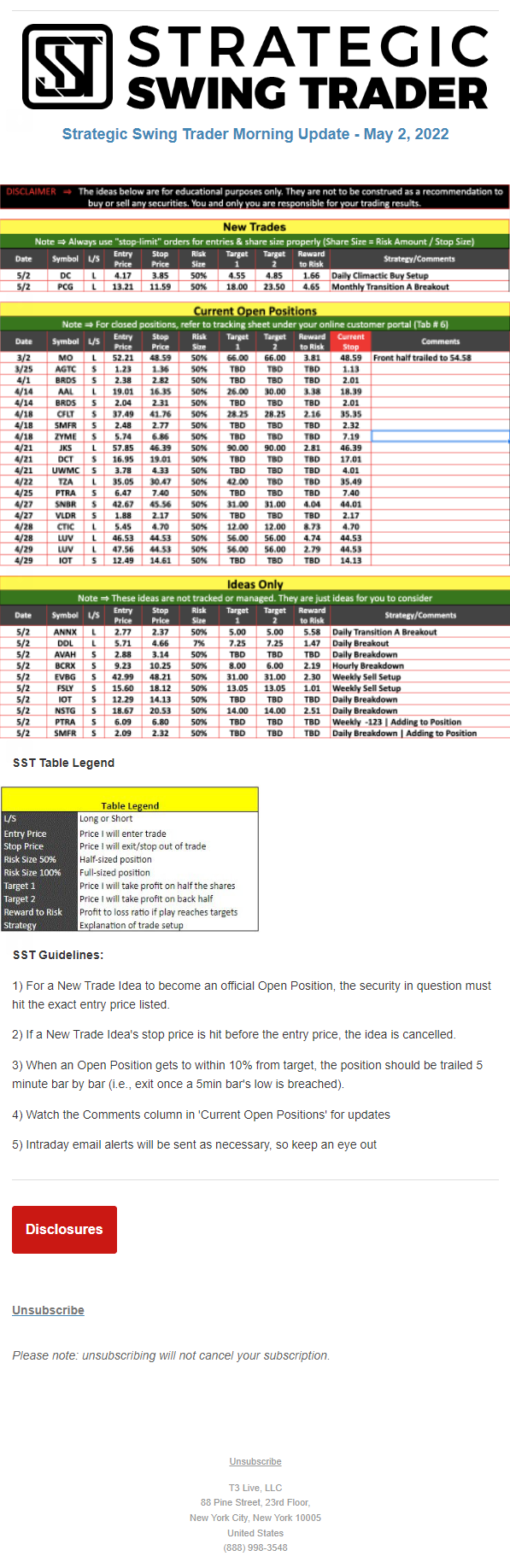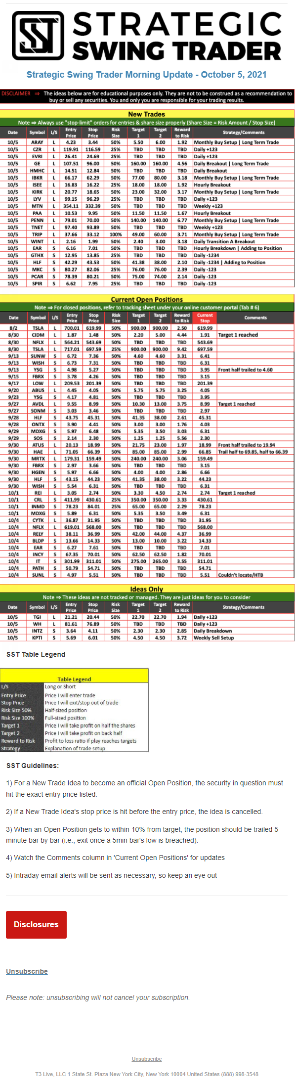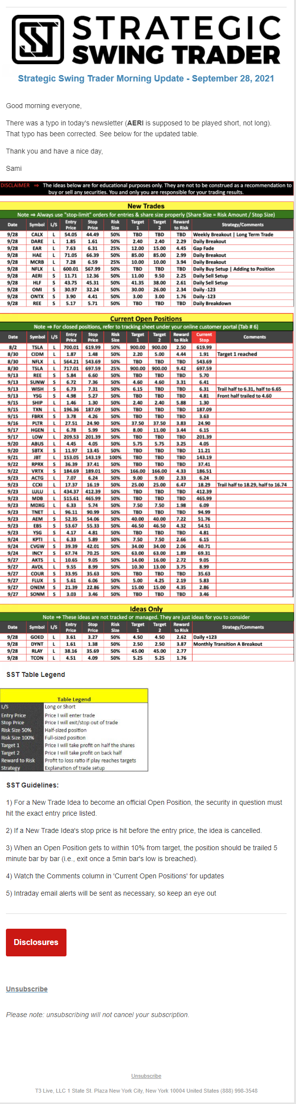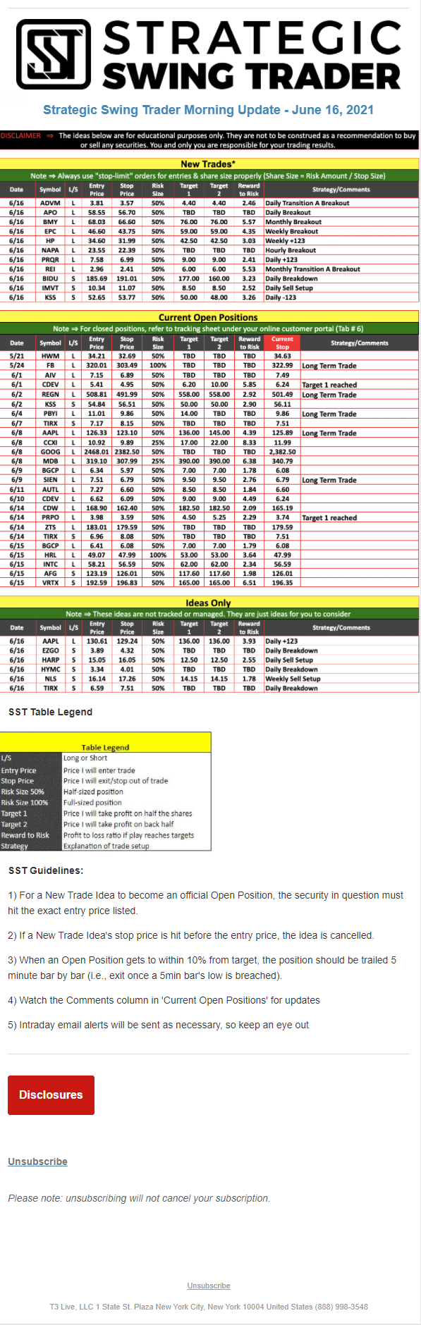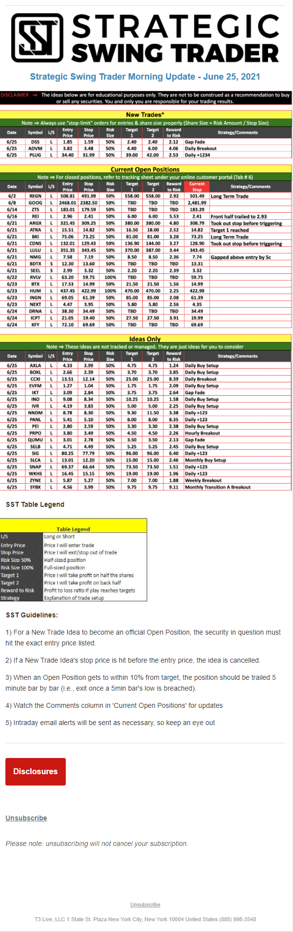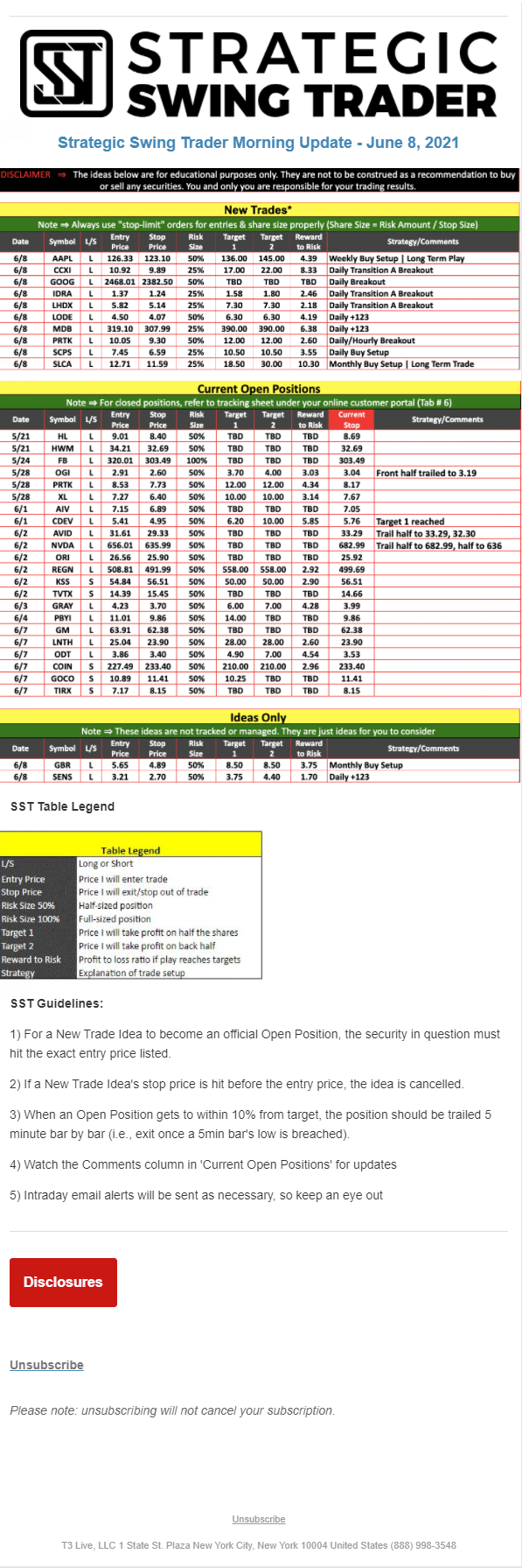 The programs that T3 Live distributes (including the “Virtual Trading Floor®,” articles, commentary, videos, blogs and social media postings) are for informational and educational purposes only. No one should consider the information disseminated by T3 Live to be personalized investment advice, a recommendation to buy, sell or hold any investment, an offer (or a solicitation of an offer) to buy or sell any investment, or the provision of any other kind of advice that would require T3 Live to register as a broker-dealer, investment adviser or similar entity. No one associated with T3 Live is authorized to make any representation to the contrary.