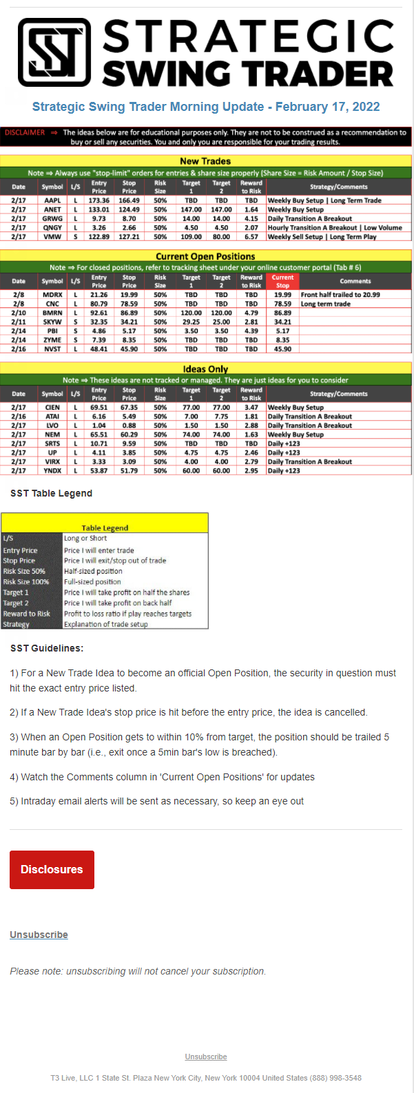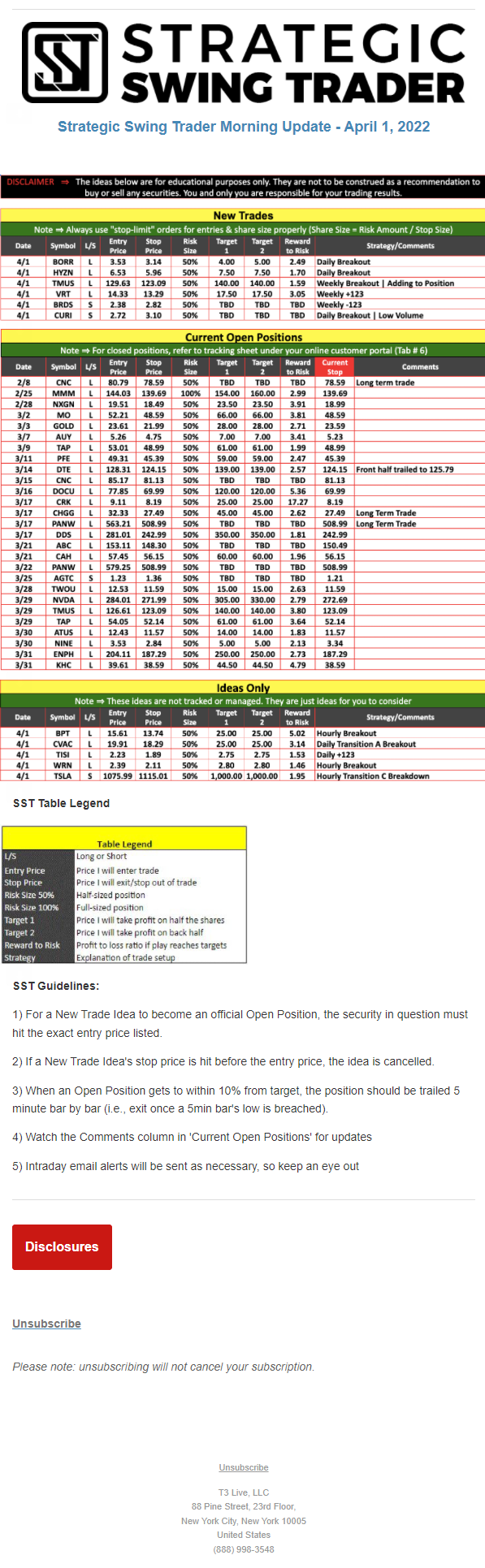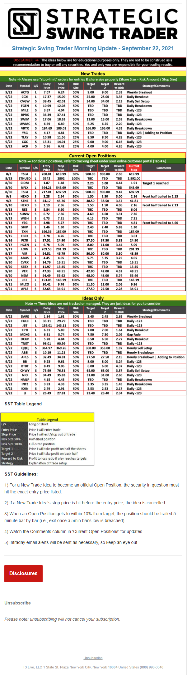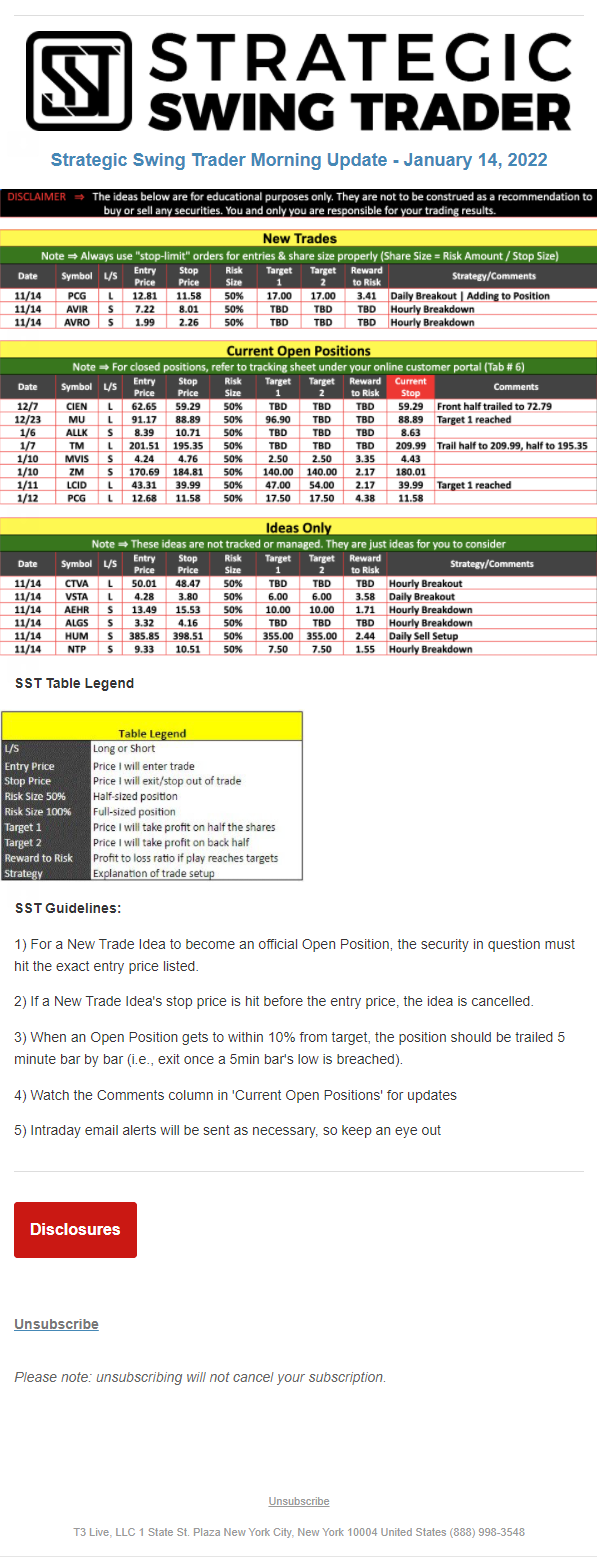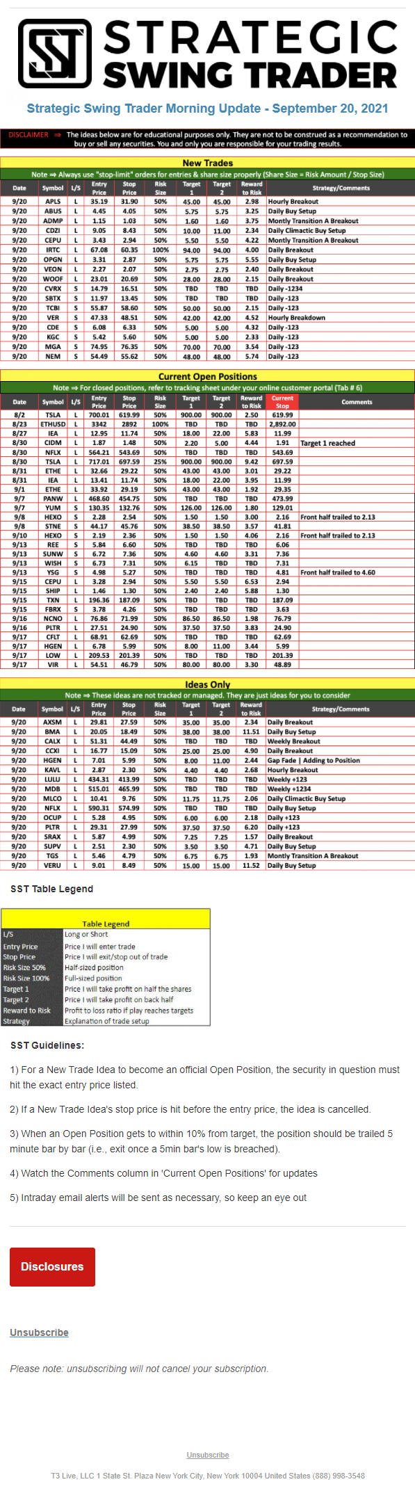The programs that T3 Live distributes (including the “Virtual Trading Floor®,” articles, commentary, videos, blogs and social media postings) are for informational and educational purposes only. No one should consider the information disseminated by T3 Live to be personalized investment advice, a recommendation to buy, sell or hold any investment, an offer (or a solicitation of an offer) to buy or sell any investment, or the provision of any other kind of advice that would require T3 Live to register as a broker-dealer, investment adviser or similar entity. No one associated with T3 Live is authorized to make any representation to the contrary.
