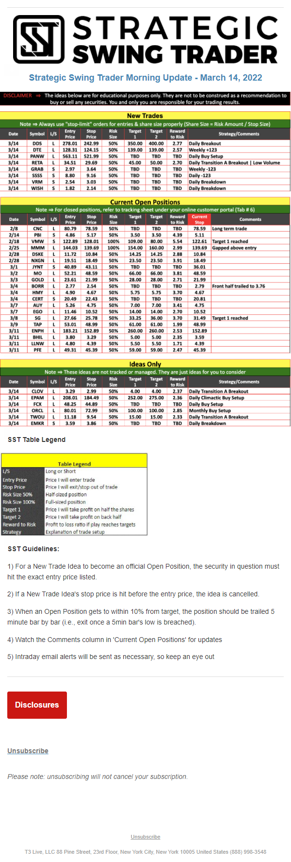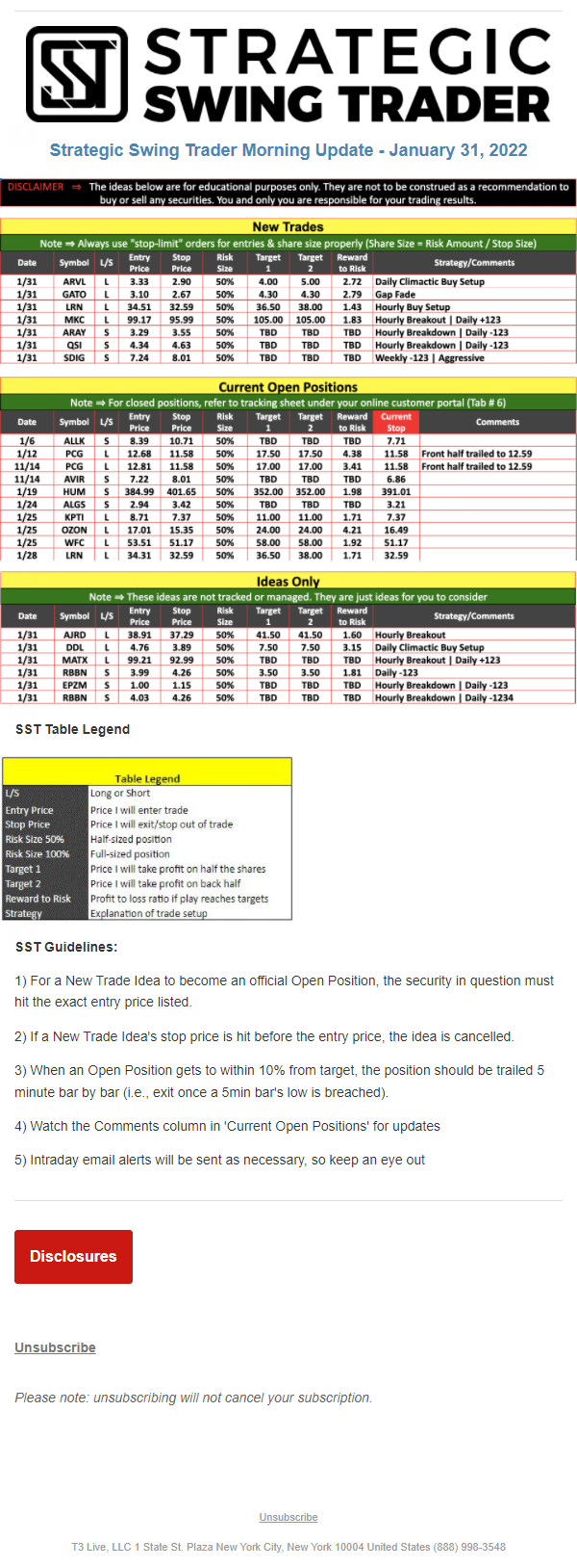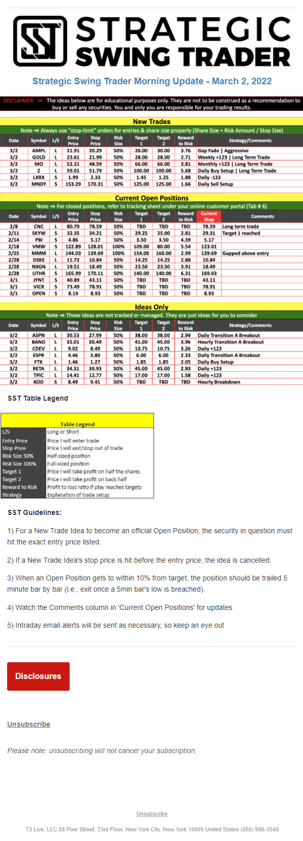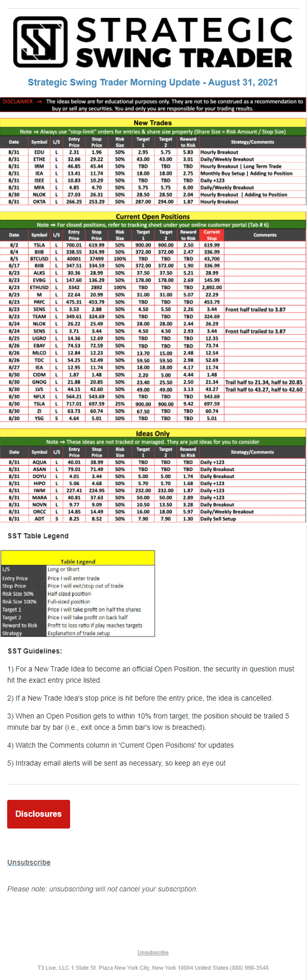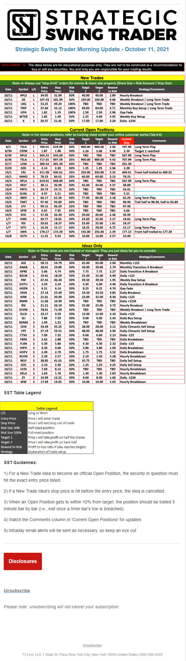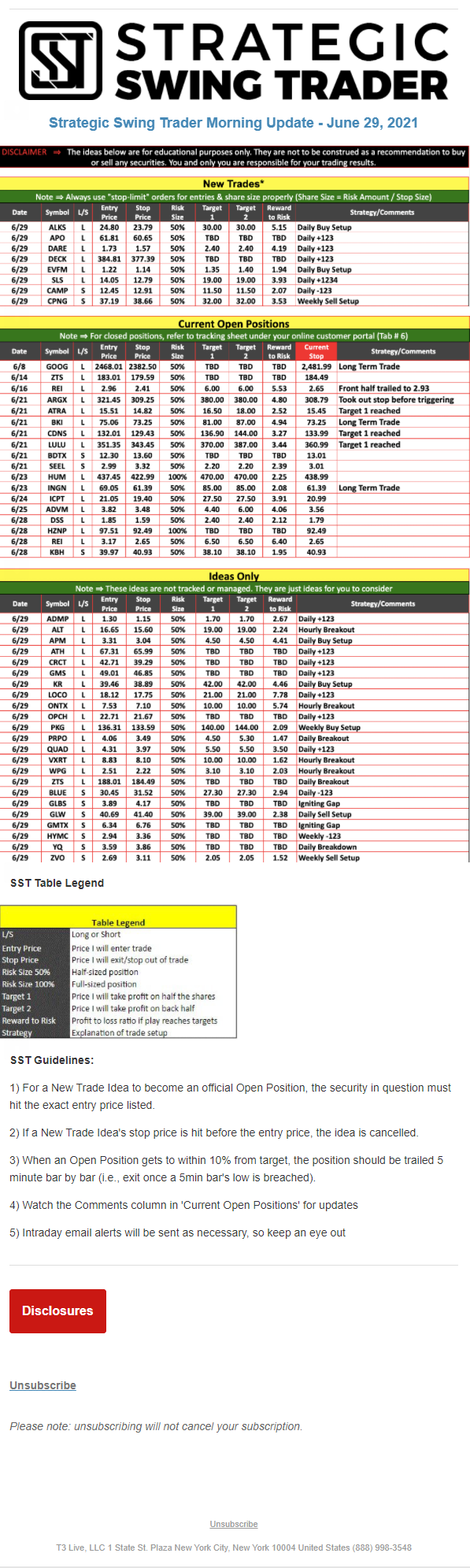 The programs that T3 Live distributes (including the “Virtual Trading Floor®,” articles, commentary, videos, blogs and social media postings) are for informational and educational purposes only. No one should consider the information disseminated by T3 Live to be personalized investment advice, a recommendation to buy, sell or hold any investment, an offer (or a solicitation of an offer) to buy or sell any investment, or the provision of any other kind of advice that would require T3 Live to register as a broker-dealer, investment adviser or similar entity. No one associated with T3 Live is authorized to make any representation to the contrary.