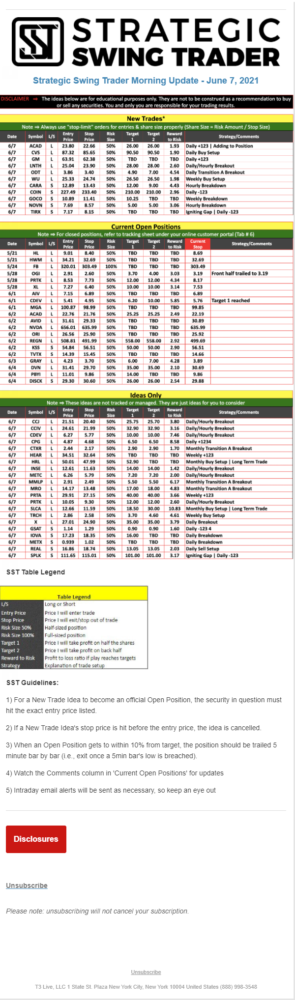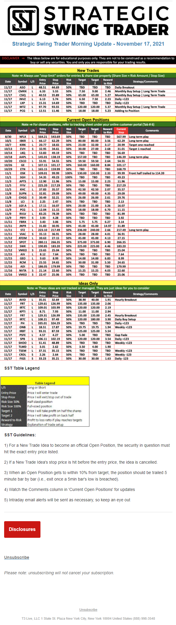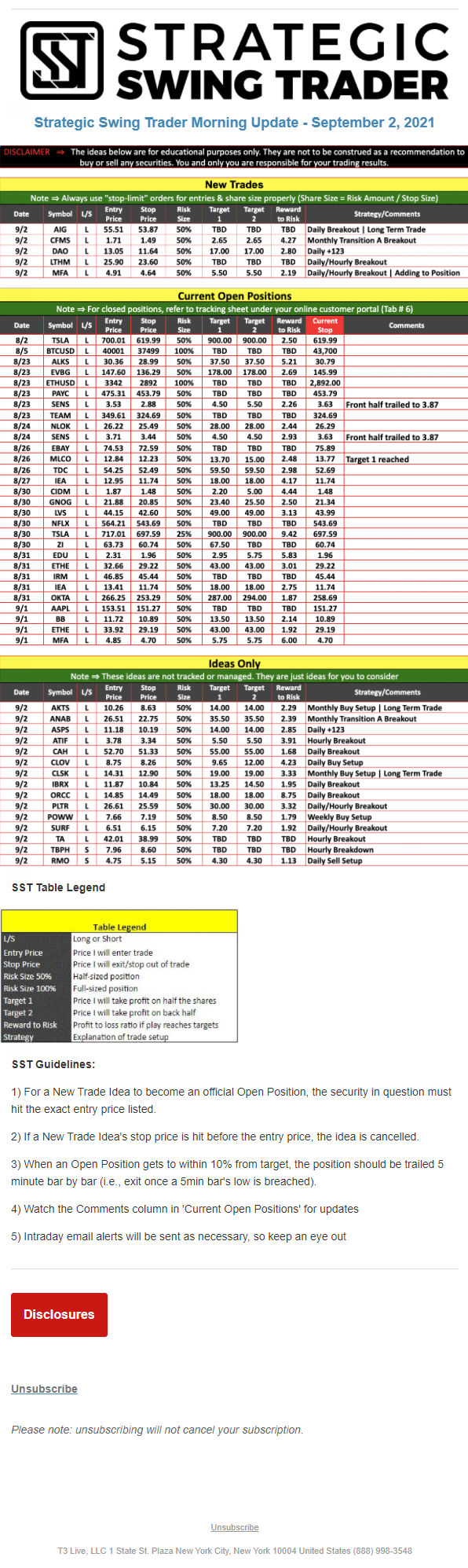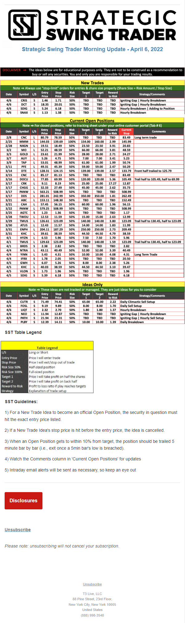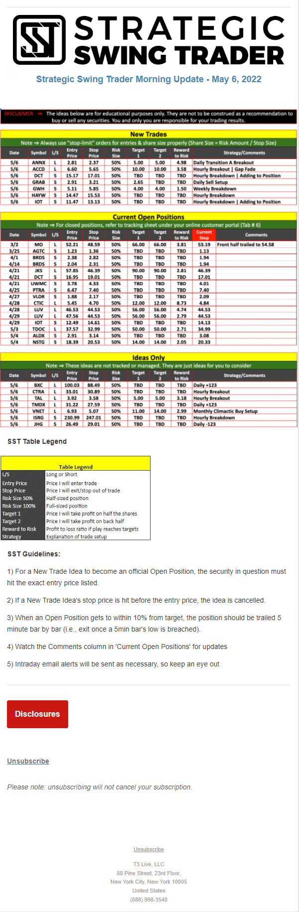 The programs that T3 Live distributes (including the “Virtual Trading Floor®,” articles, commentary, videos, blogs and social media postings) are for informational and educational purposes only. No one should consider the information disseminated by T3 Live to be personalized investment advice, a recommendation to buy, sell or hold any investment, an offer (or a solicitation of an offer) to buy or sell any investment, or the provision of any other kind of advice that would require T3 Live to register as a broker-dealer, investment adviser or similar entity. No one associated with T3 Live is authorized to make any representation to the contrary.