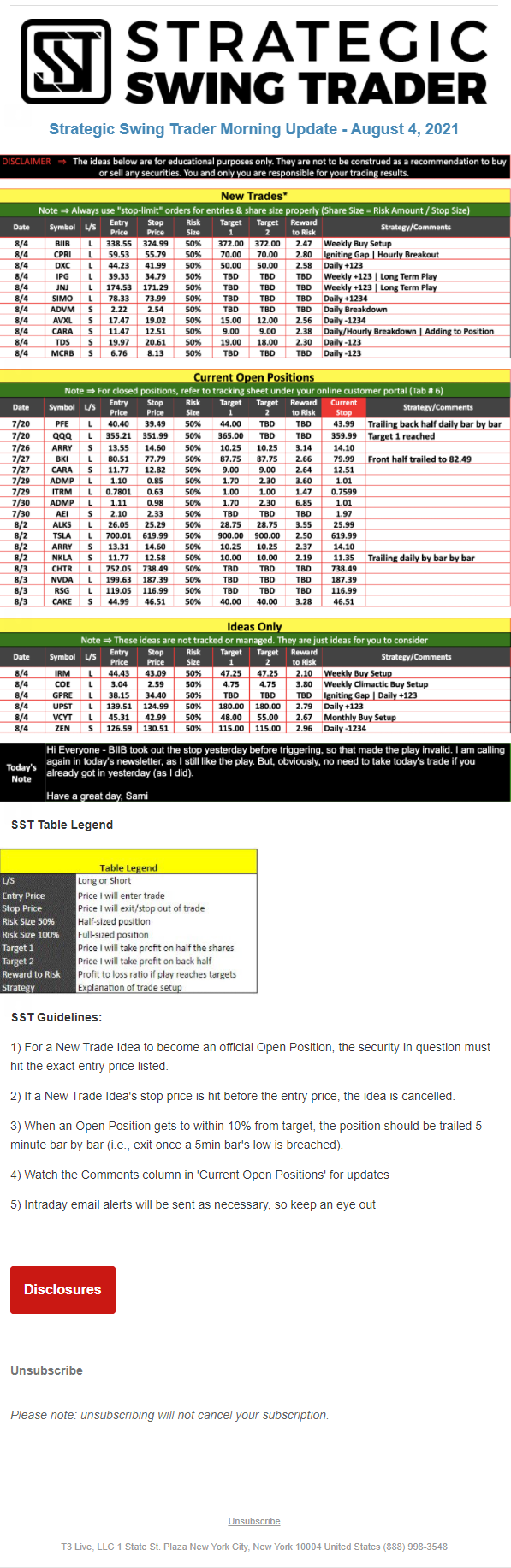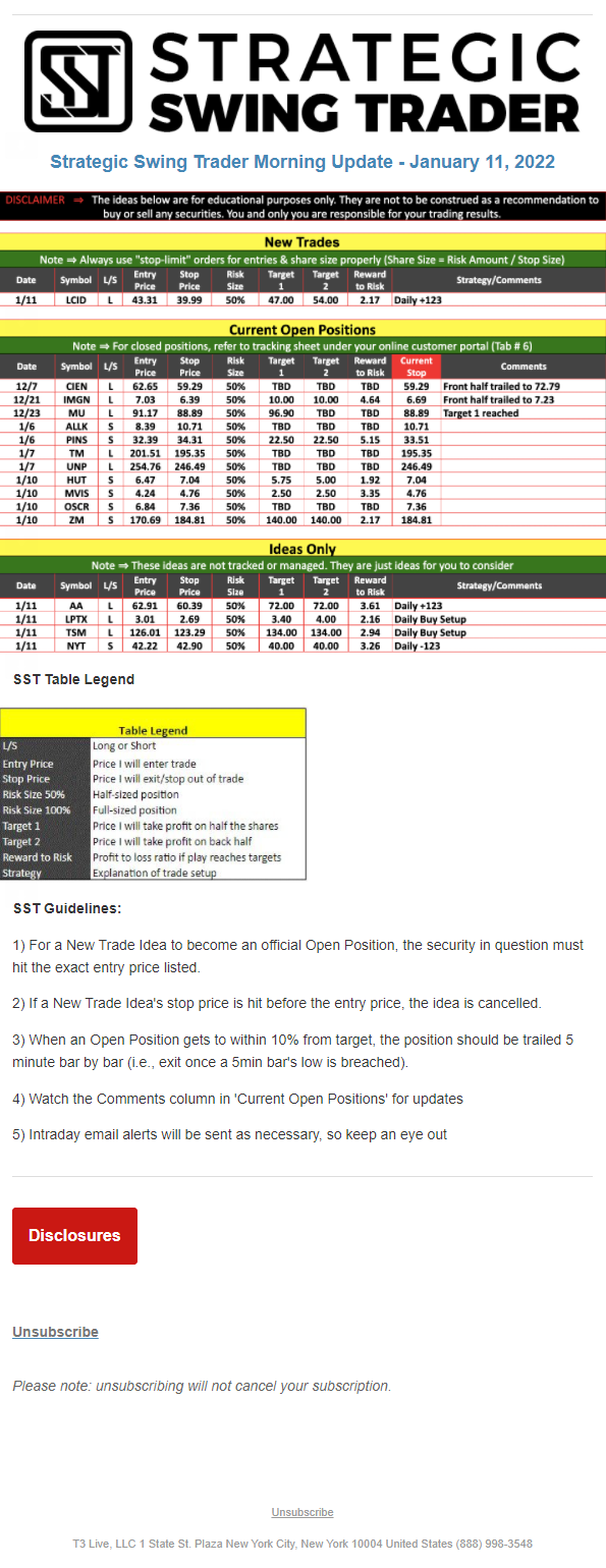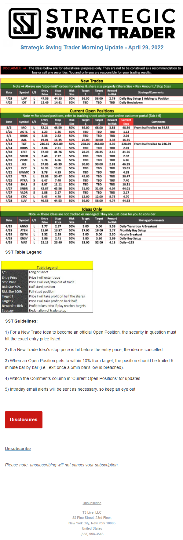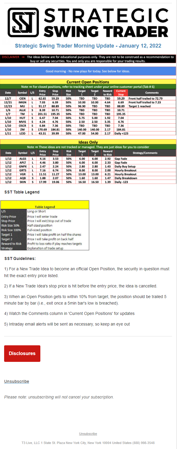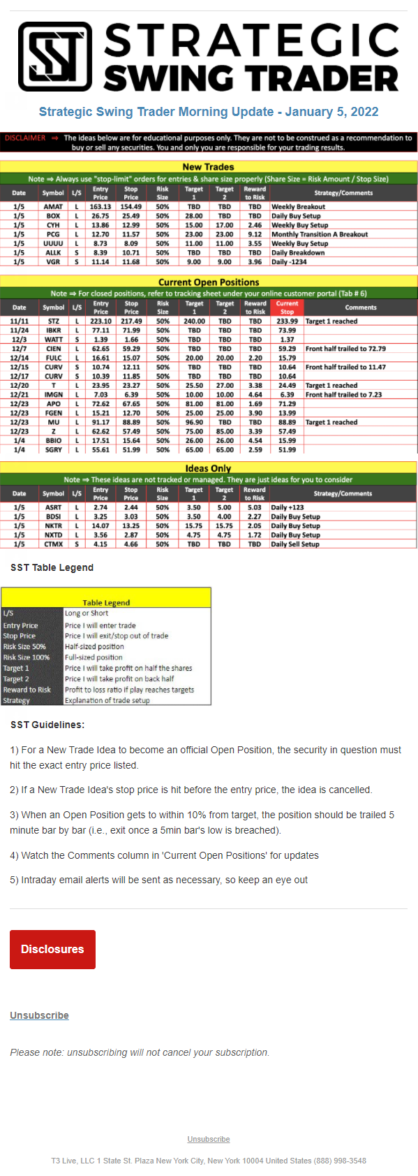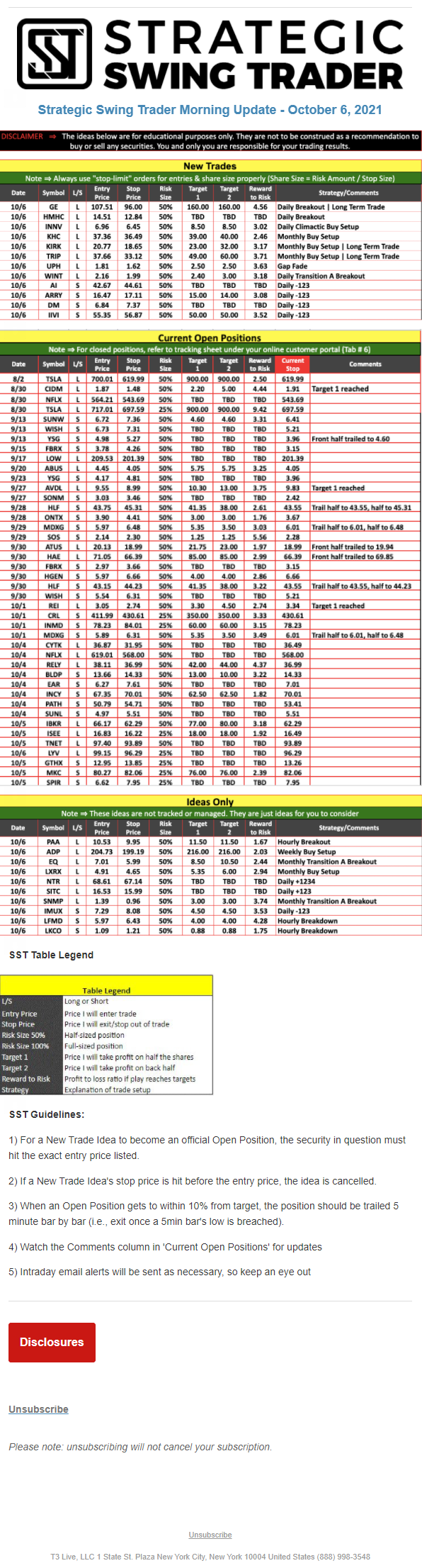 The programs that T3 Live distributes (including the “Virtual Trading Floor®,” articles, commentary, videos, blogs and social media postings) are for informational and educational purposes only. No one should consider the information disseminated by T3 Live to be personalized investment advice, a recommendation to buy, sell or hold any investment, an offer (or a solicitation of an offer) to buy or sell any investment, or the provision of any other kind of advice that would require T3 Live to register as a broker-dealer, investment adviser or similar entity. No one associated with T3 Live is authorized to make any representation to the contrary.