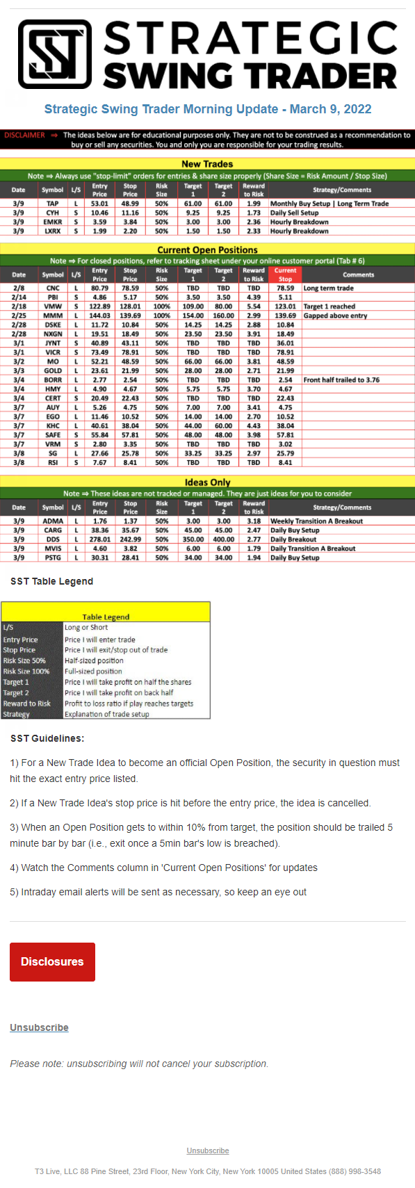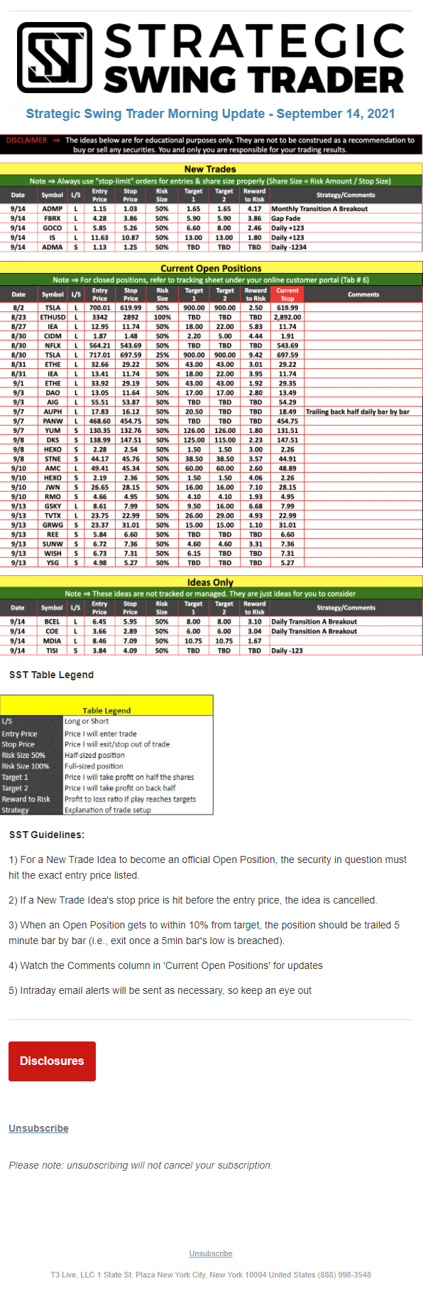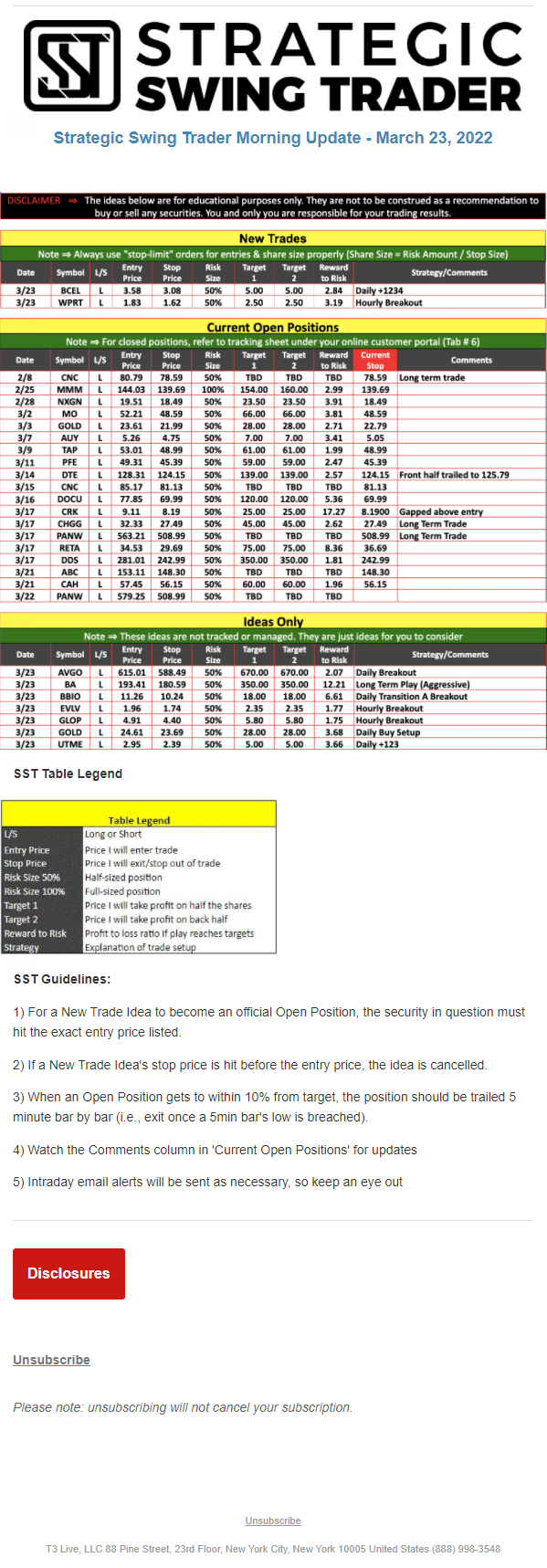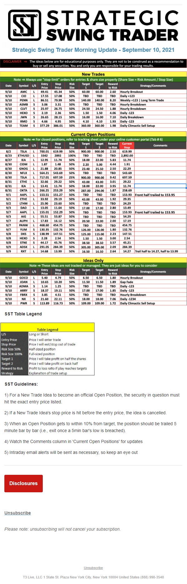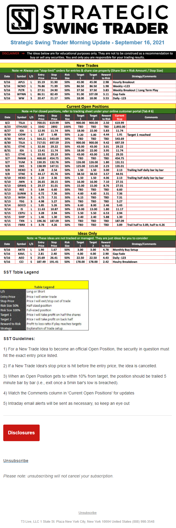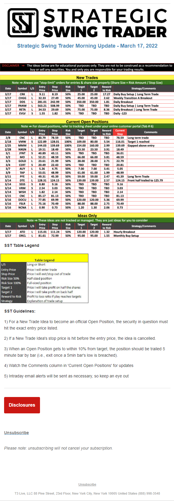 The programs that T3 Live distributes (including the “Virtual Trading Floor®,” articles, commentary, videos, blogs and social media postings) are for informational and educational purposes only. No one should consider the information disseminated by T3 Live to be personalized investment advice, a recommendation to buy, sell or hold any investment, an offer (or a solicitation of an offer) to buy or sell any investment, or the provision of any other kind of advice that would require T3 Live to register as a broker-dealer, investment adviser or similar entity. No one associated with T3 Live is authorized to make any representation to the contrary.