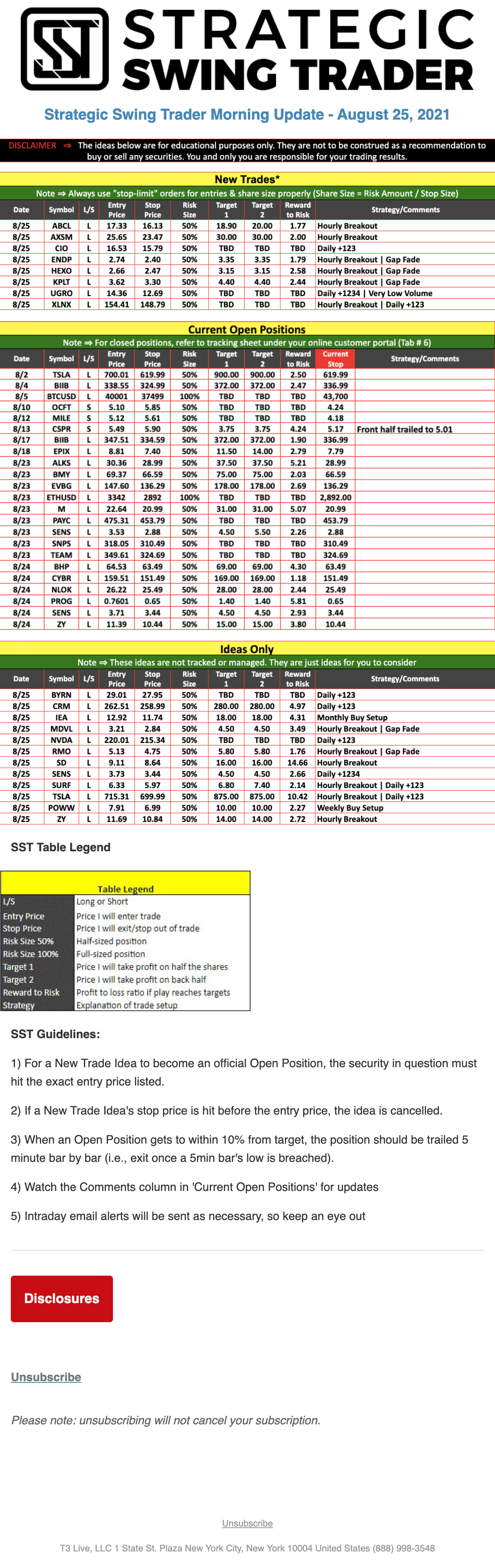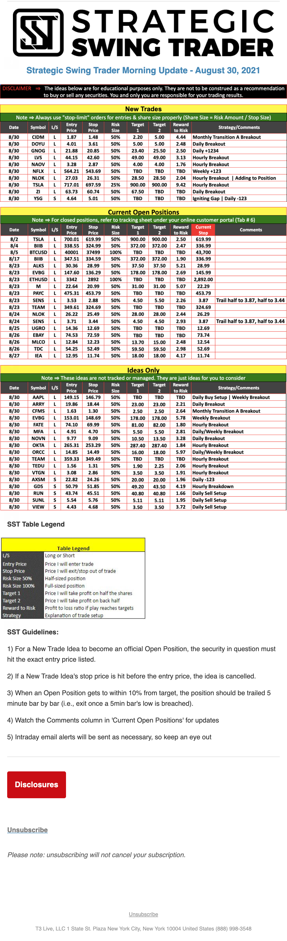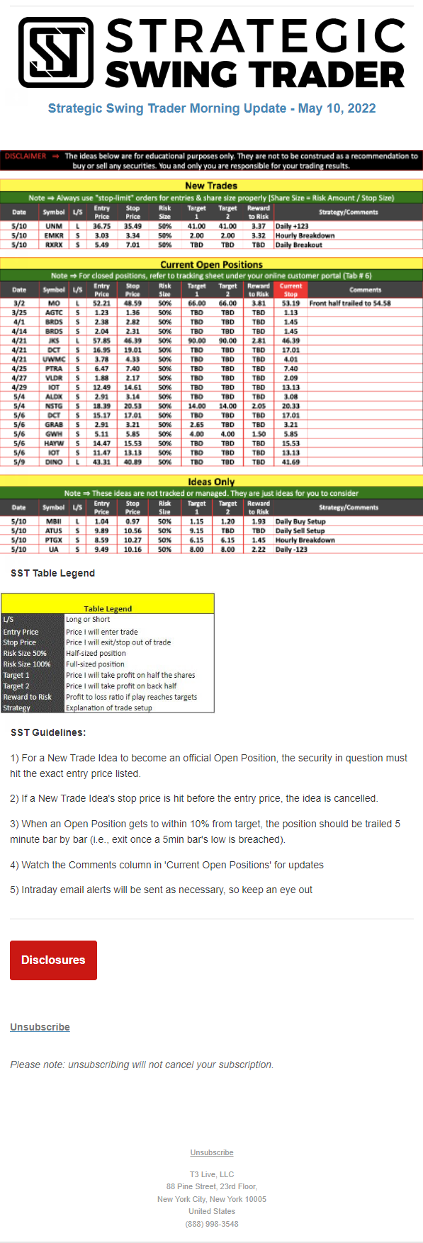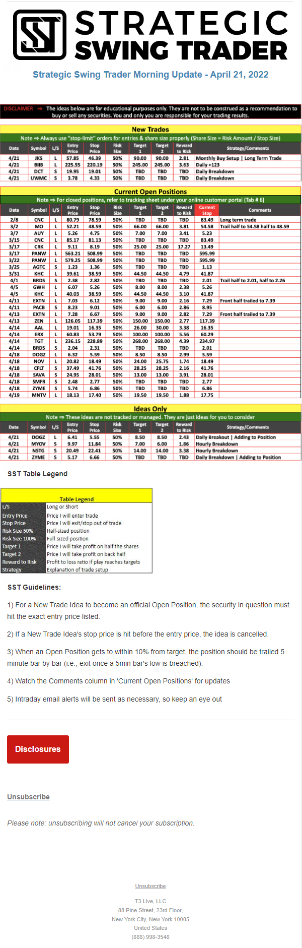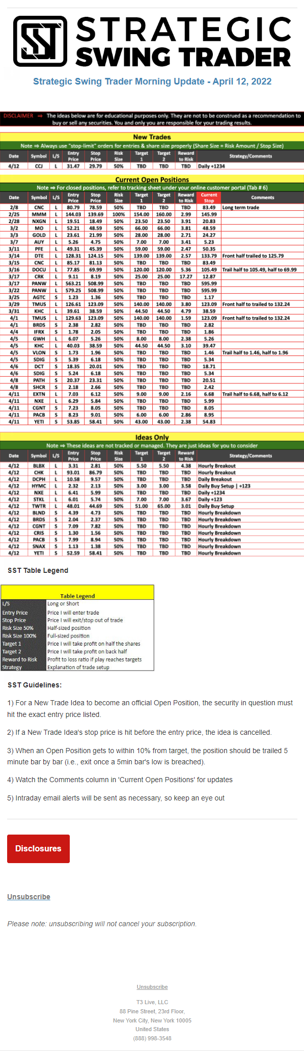 The programs that T3 Live distributes (including the “Virtual Trading Floor®,” articles, commentary, videos, blogs and social media postings) are for informational and educational purposes only. No one should consider the information disseminated by T3 Live to be personalized investment advice, a recommendation to buy, sell or hold any investment, an offer (or a solicitation of an offer) to buy or sell any investment, or the provision of any other kind of advice that would require T3 Live to register as a broker-dealer, investment adviser or similar entity. No one associated with T3 Live is authorized to make any representation to the contrary.