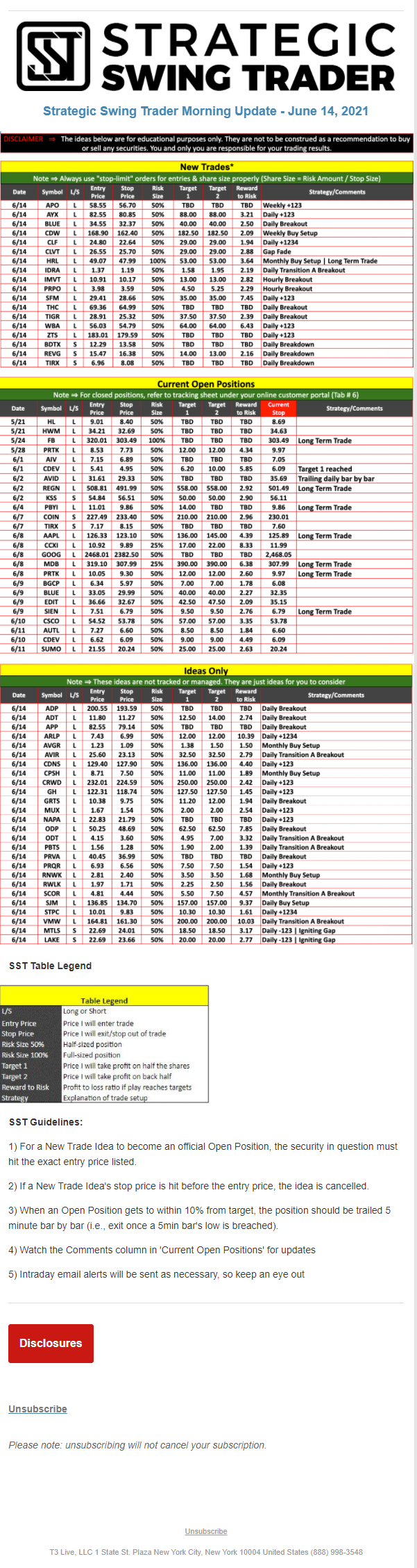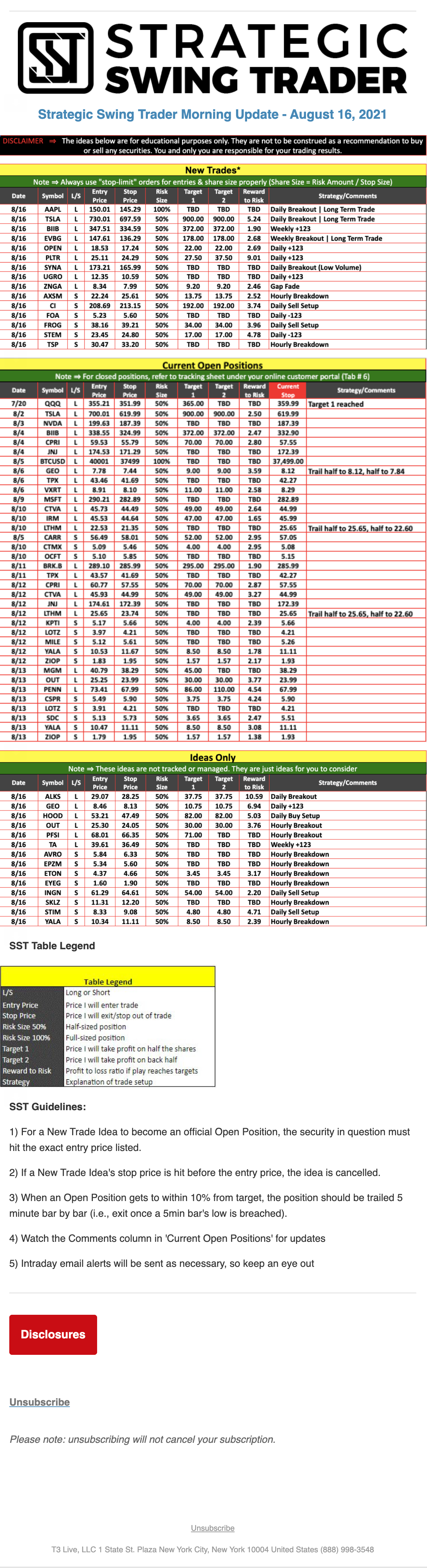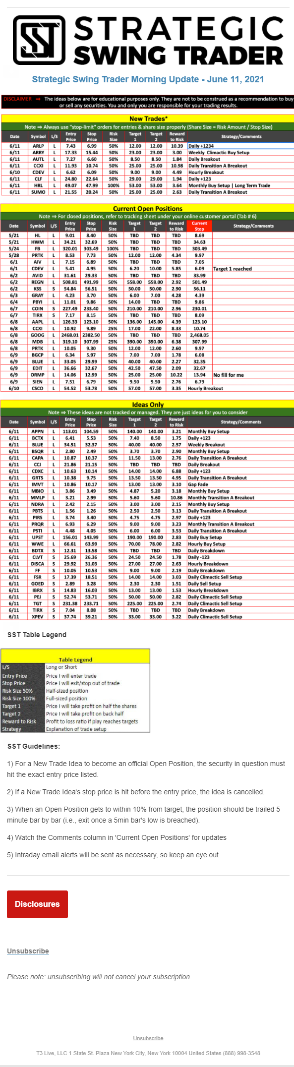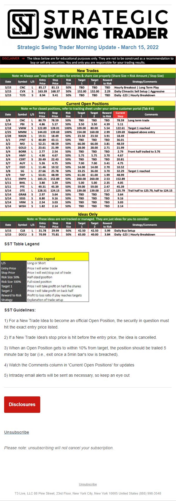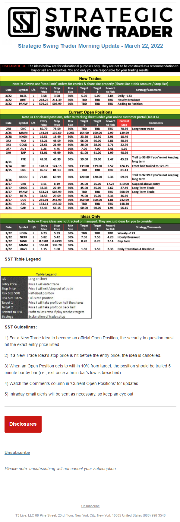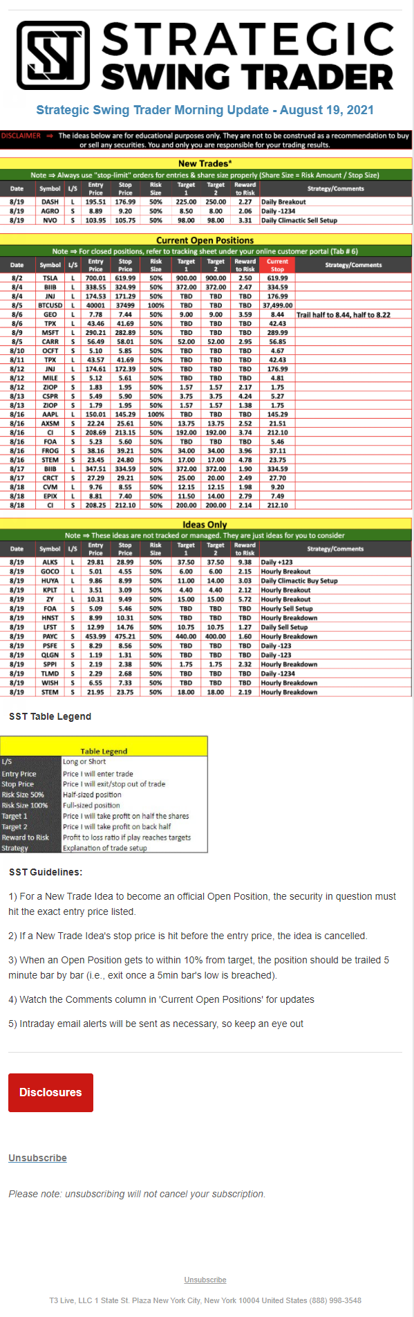The programs that T3 Live distributes (including the “Virtual Trading Floor®,” articles, commentary, videos, blogs and social media postings) are for informational and educational purposes only. No one should consider the information disseminated by T3 Live to be personalized investment advice, a recommendation to buy, sell or hold any investment, an offer (or a solicitation of an offer) to buy or sell any investment, or the provision of any other kind of advice that would require T3 Live to register as a broker-dealer, investment adviser or similar entity. No one associated with T3 Live is authorized to make any representation to the contrary.