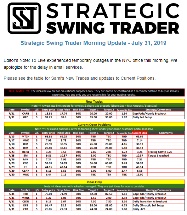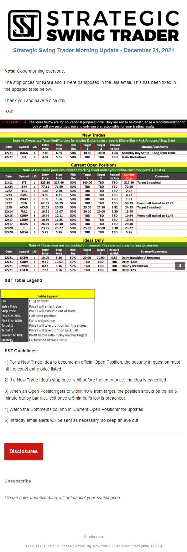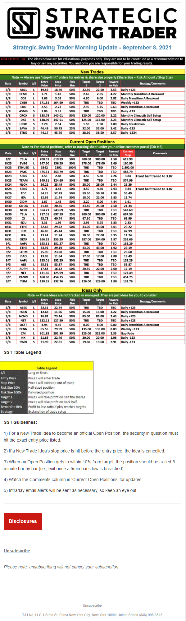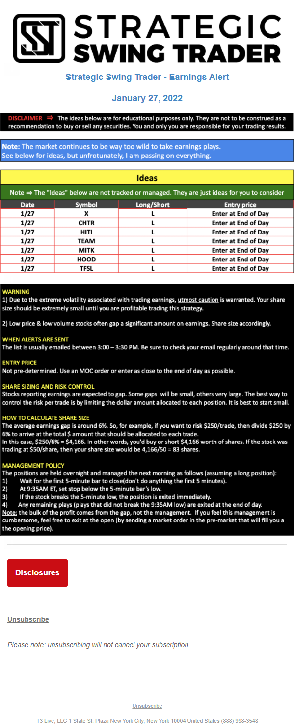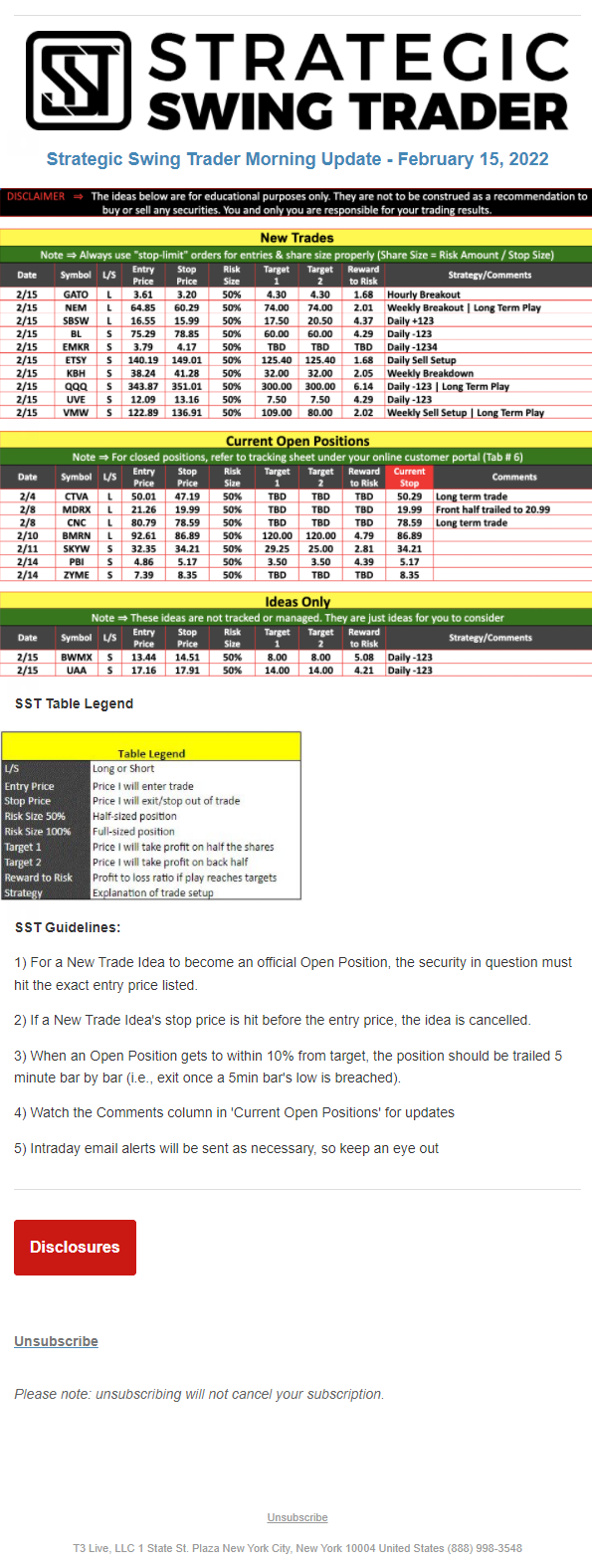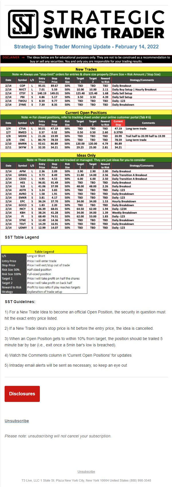 The programs that T3 Live distributes (including the “Virtual Trading Floor®,” articles, commentary, videos, blogs and social media postings) are for informational and educational purposes only. No one should consider the information disseminated by T3 Live to be personalized investment advice, a recommendation to buy, sell or hold any investment, an offer (or a solicitation of an offer) to buy or sell any investment, or the provision of any other kind of advice that would require T3 Live to register as a broker-dealer, investment adviser or similar entity. No one associated with T3 Live is authorized to make any representation to the contrary.