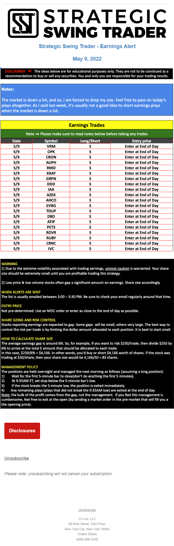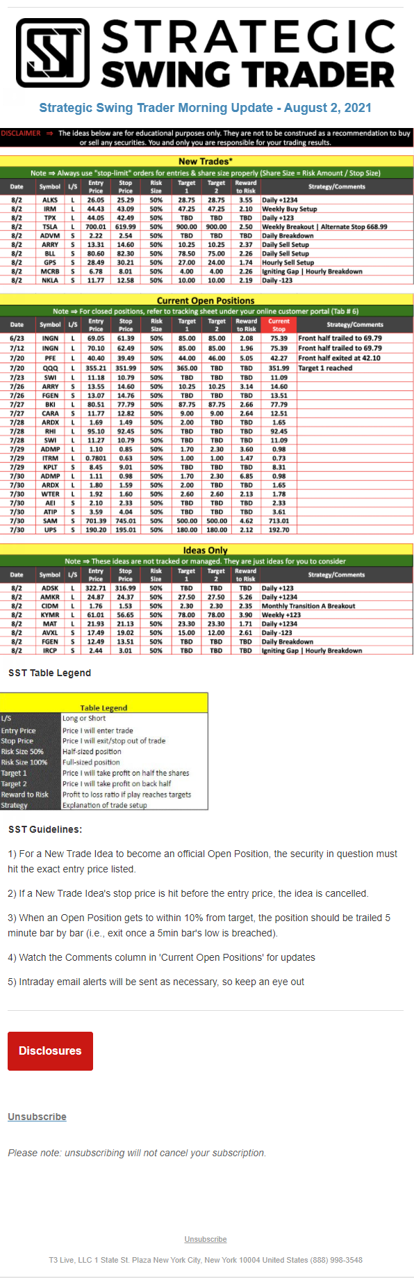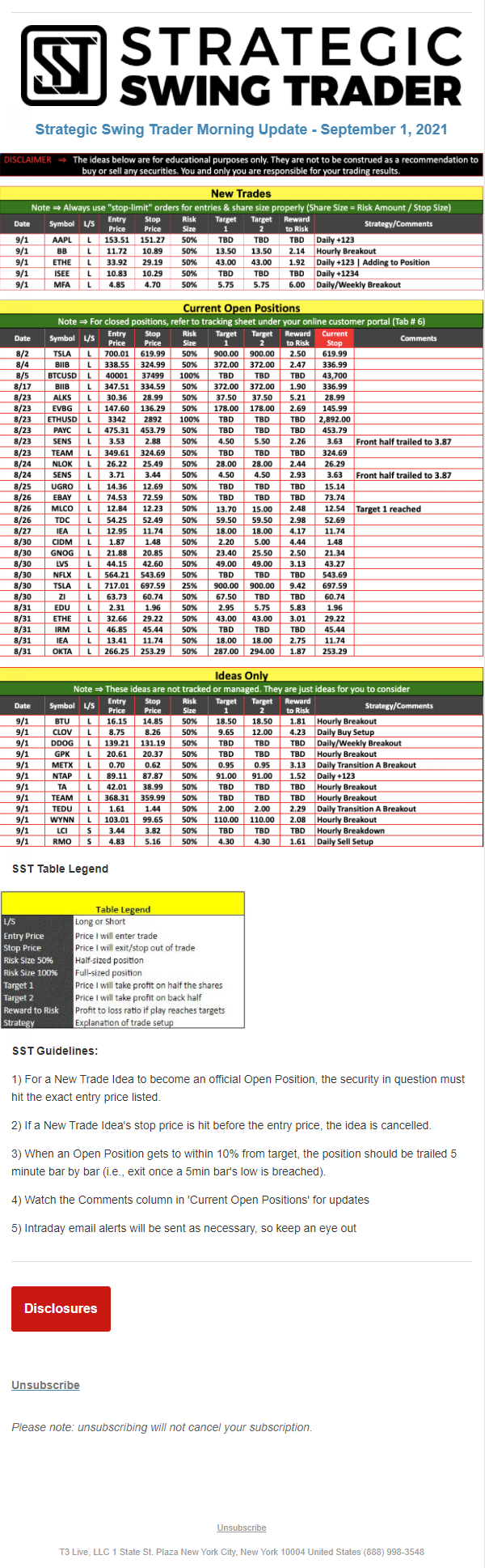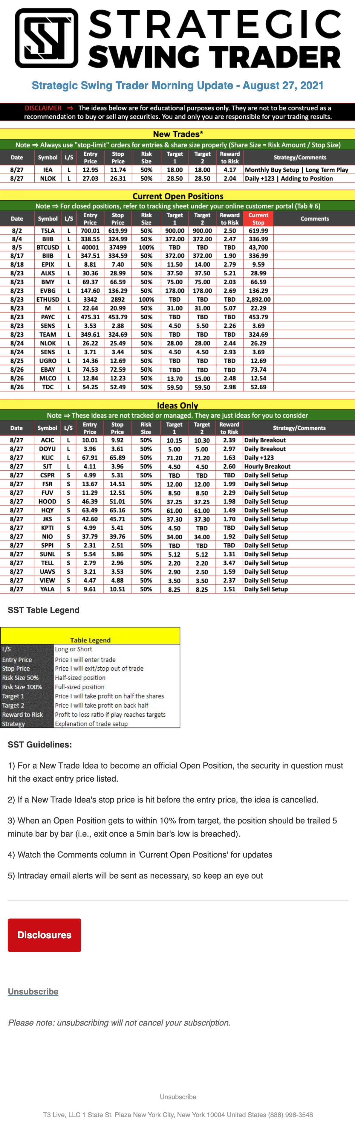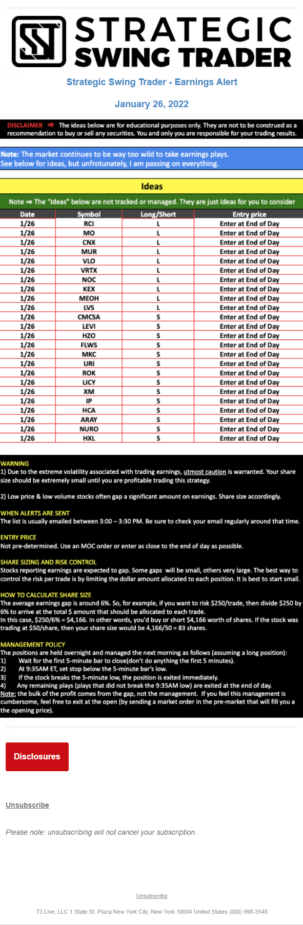 The programs that T3 Live distributes (including the “Virtual Trading Floor®,” articles, commentary, videos, blogs and social media postings) are for informational and educational purposes only. No one should consider the information disseminated by T3 Live to be personalized investment advice, a recommendation to buy, sell or hold any investment, an offer (or a solicitation of an offer) to buy or sell any investment, or the provision of any other kind of advice that would require T3 Live to register as a broker-dealer, investment adviser or similar entity. No one associated with T3 Live is authorized to make any representation to the contrary.