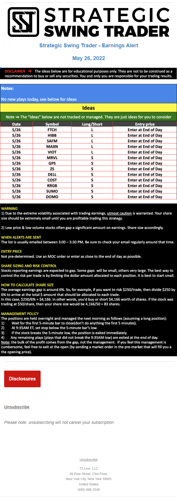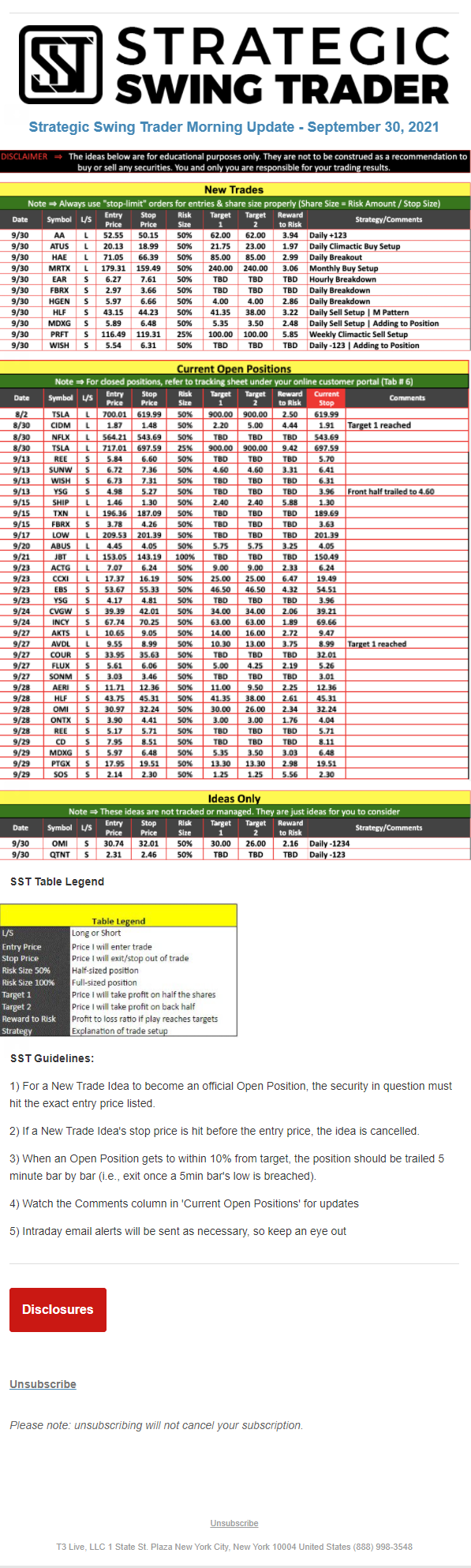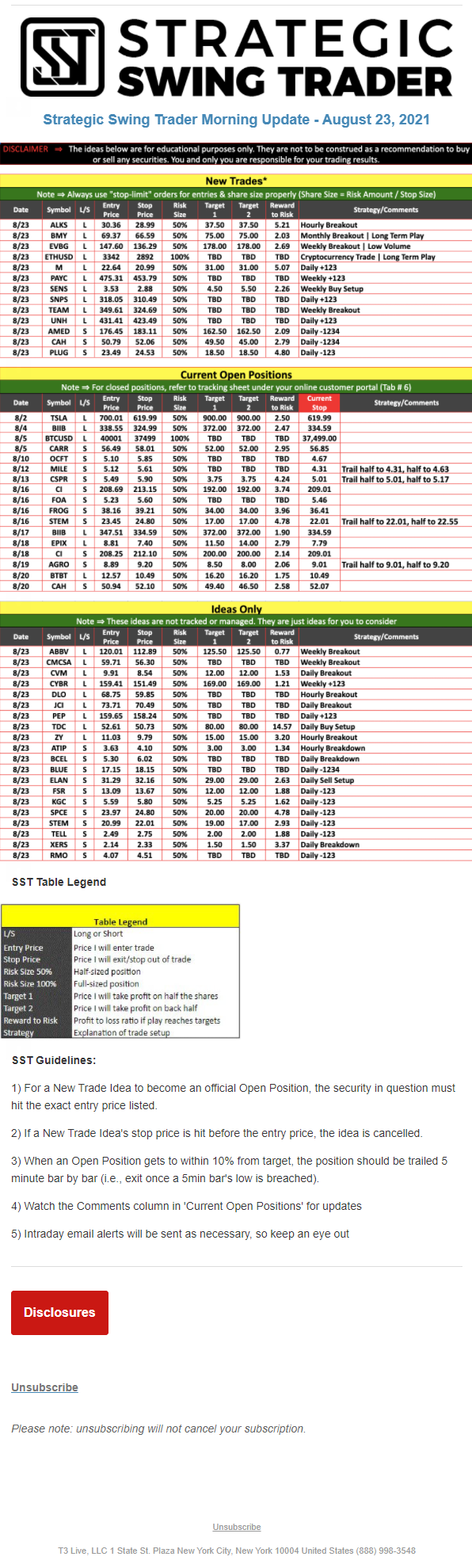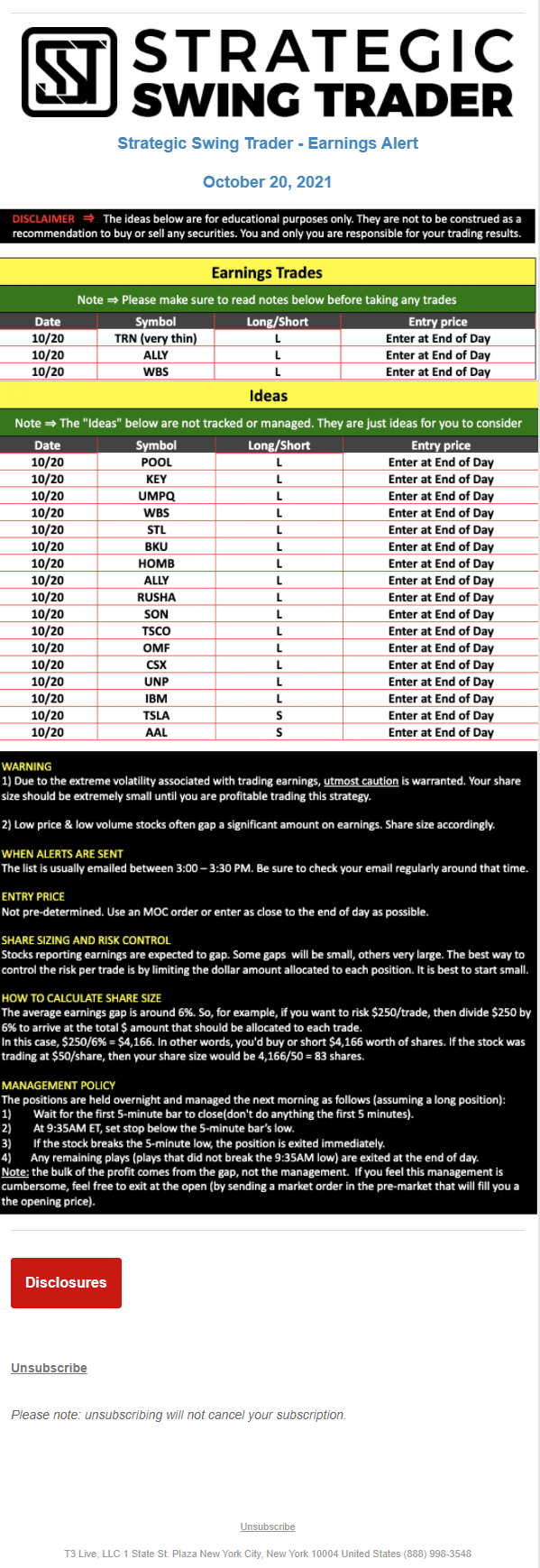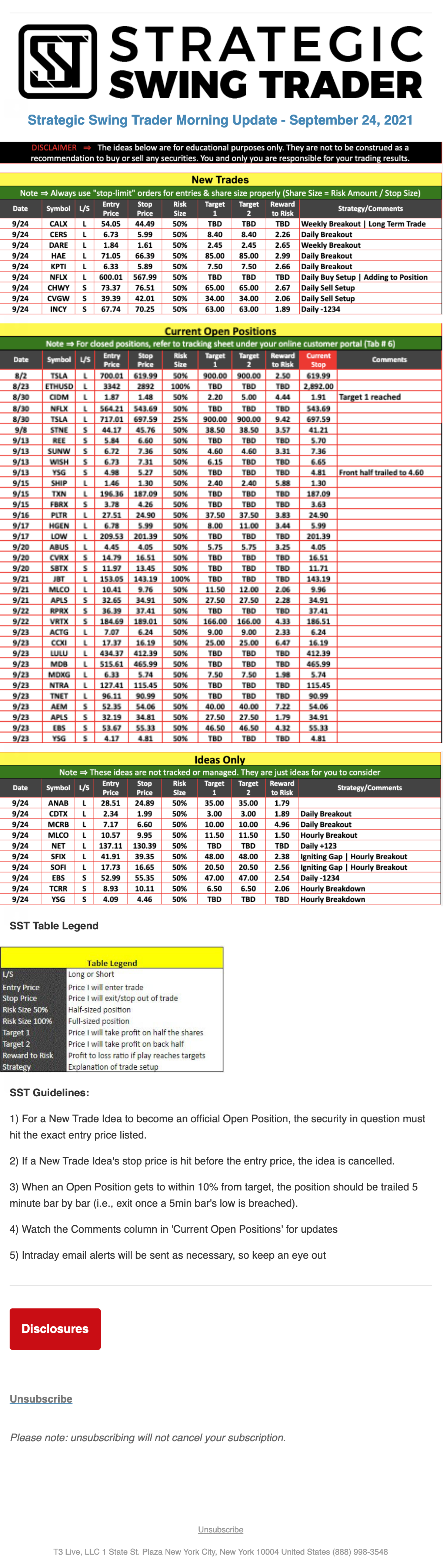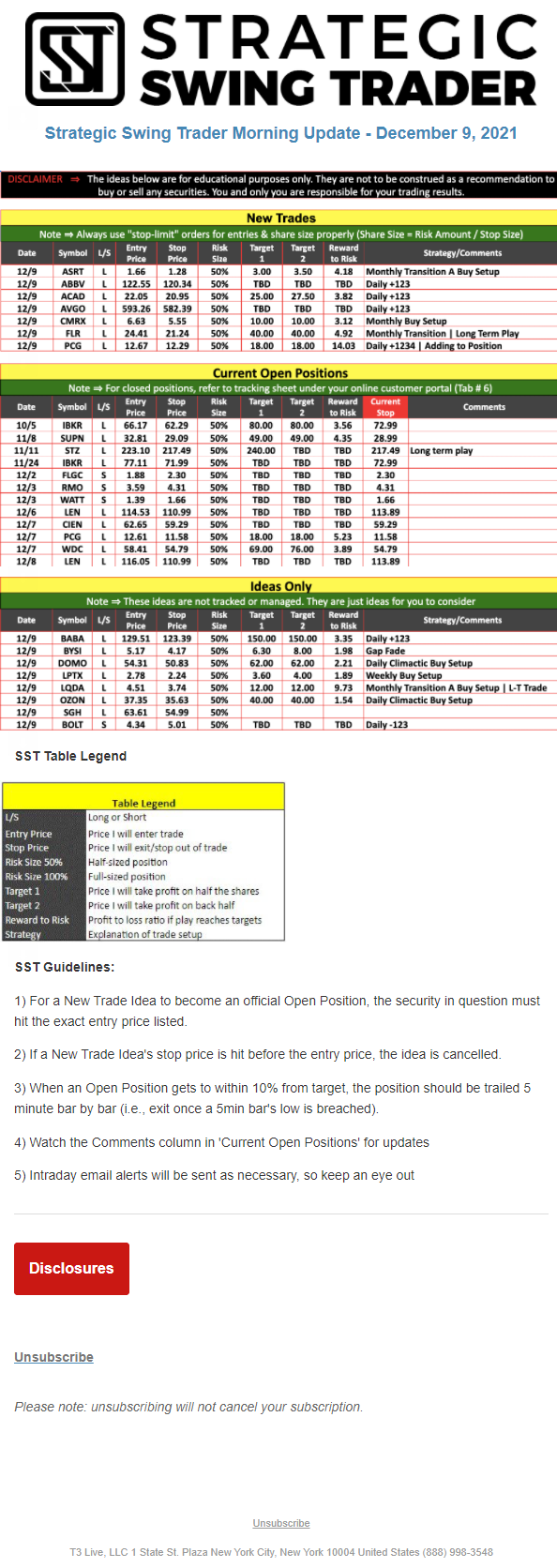 The programs that T3 Live distributes (including the “Virtual Trading Floor®,” articles, commentary, videos, blogs and social media postings) are for informational and educational purposes only. No one should consider the information disseminated by T3 Live to be personalized investment advice, a recommendation to buy, sell or hold any investment, an offer (or a solicitation of an offer) to buy or sell any investment, or the provision of any other kind of advice that would require T3 Live to register as a broker-dealer, investment adviser or similar entity. No one associated with T3 Live is authorized to make any representation to the contrary.
