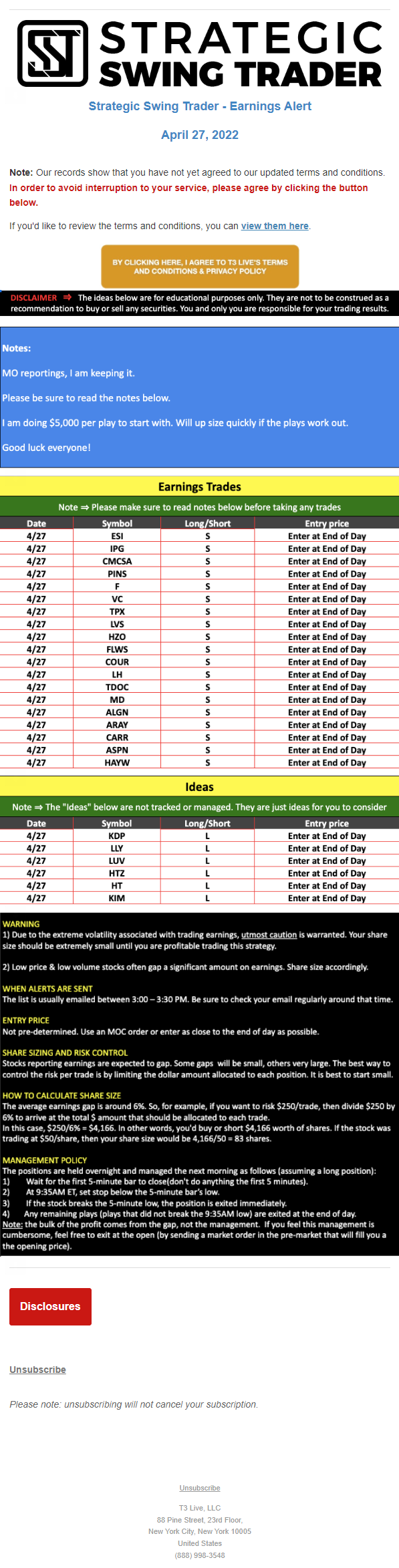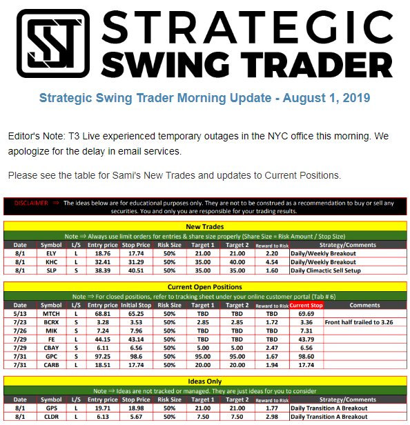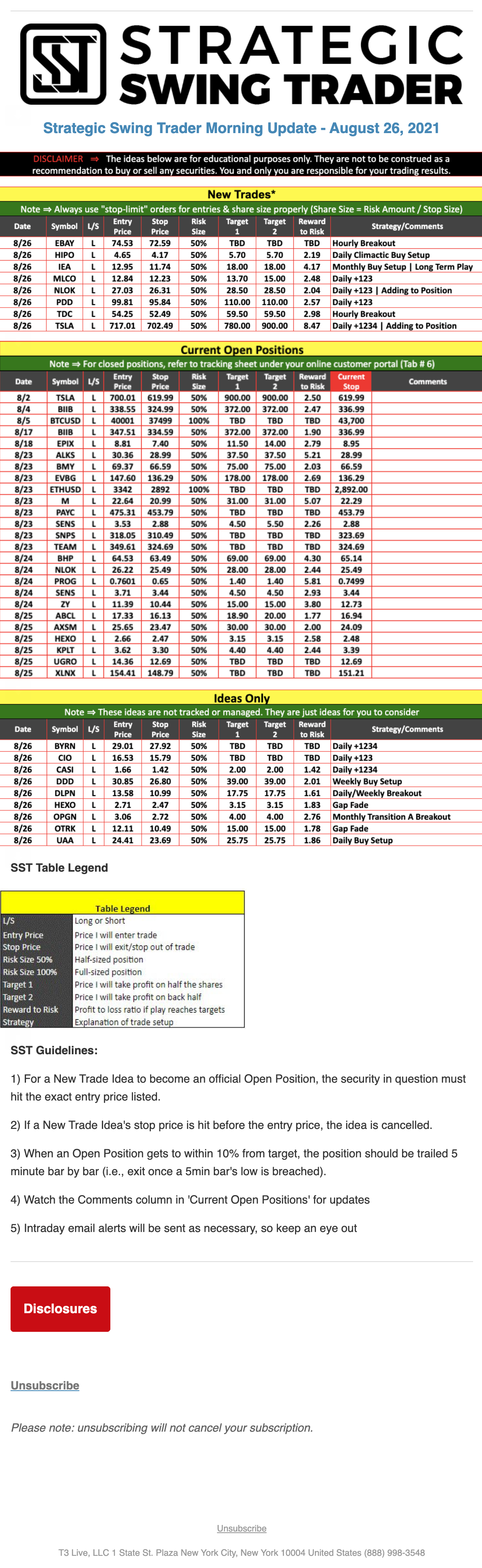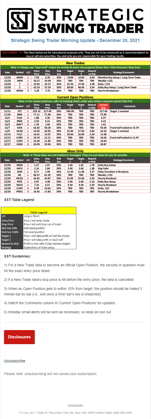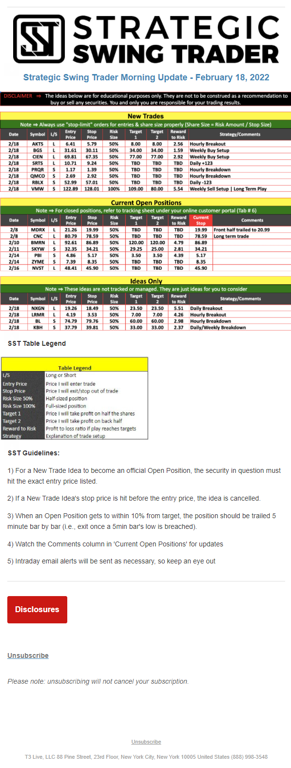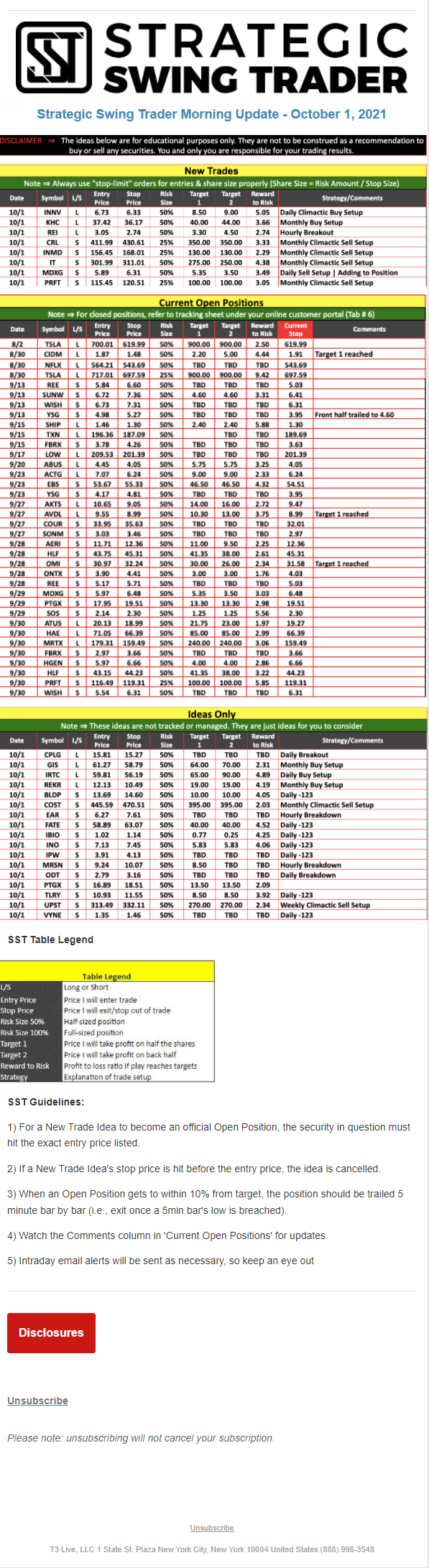 The programs that T3 Live distributes (including the “Virtual Trading Floor®,” articles, commentary, videos, blogs and social media postings) are for informational and educational purposes only. No one should consider the information disseminated by T3 Live to be personalized investment advice, a recommendation to buy, sell or hold any investment, an offer (or a solicitation of an offer) to buy or sell any investment, or the provision of any other kind of advice that would require T3 Live to register as a broker-dealer, investment adviser or similar entity. No one associated with T3 Live is authorized to make any representation to the contrary.