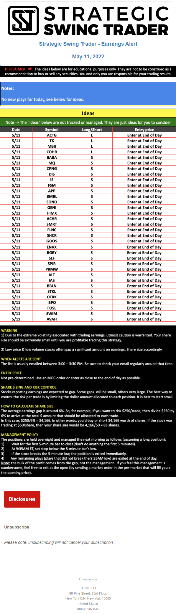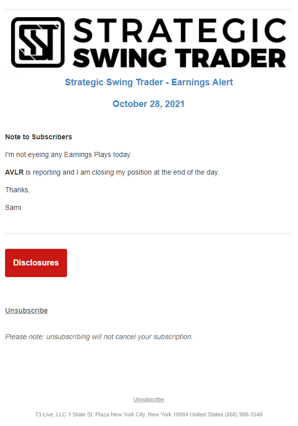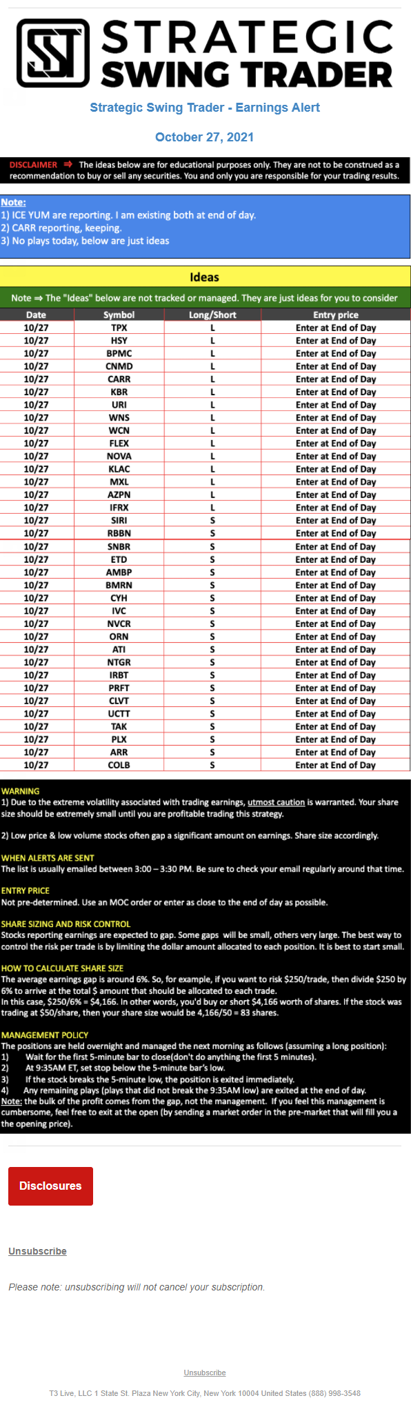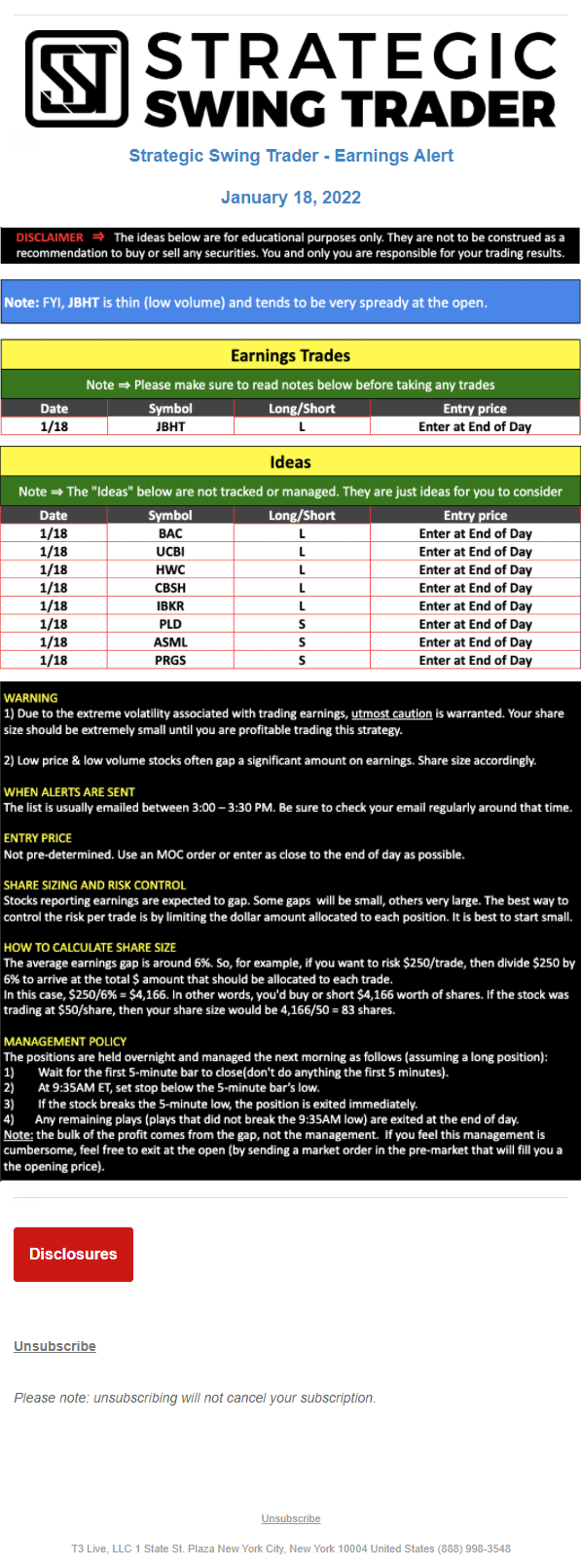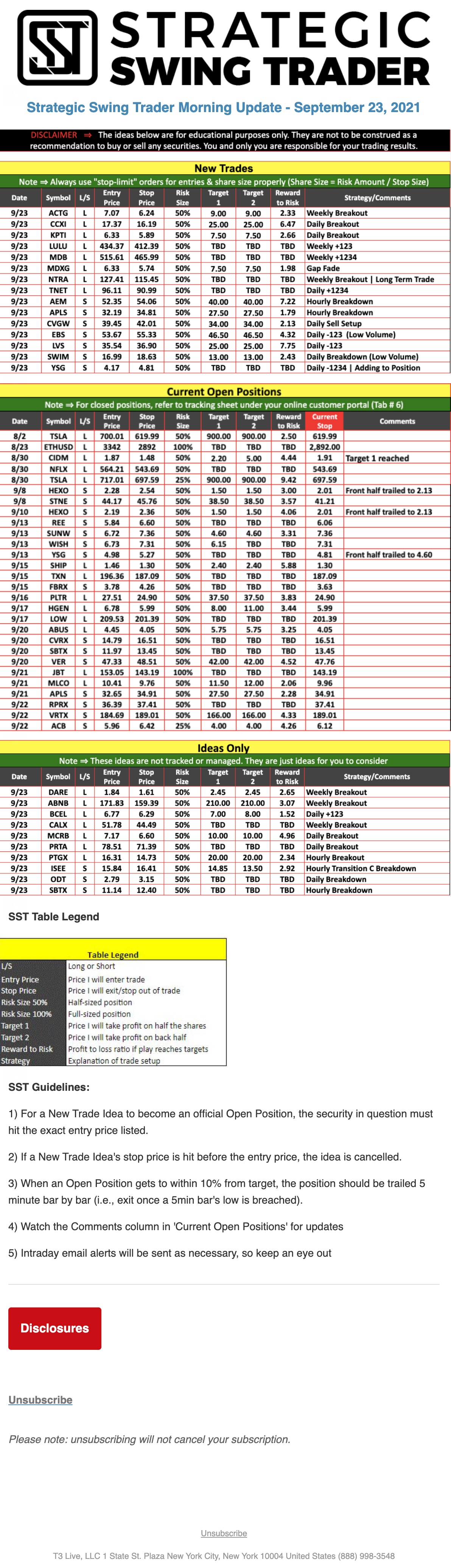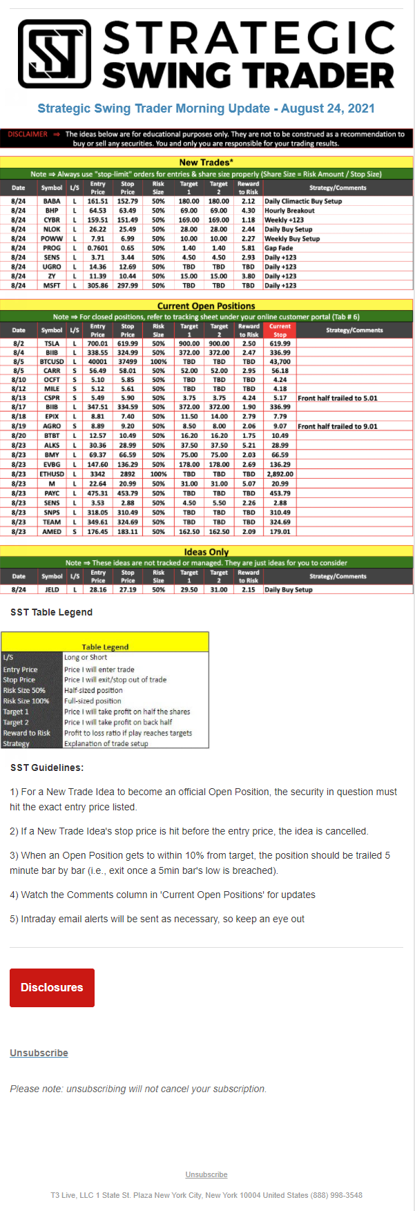 The programs that T3 Live distributes (including the “Virtual Trading Floor®,” articles, commentary, videos, blogs and social media postings) are for informational and educational purposes only. No one should consider the information disseminated by T3 Live to be personalized investment advice, a recommendation to buy, sell or hold any investment, an offer (or a solicitation of an offer) to buy or sell any investment, or the provision of any other kind of advice that would require T3 Live to register as a broker-dealer, investment adviser or similar entity. No one associated with T3 Live is authorized to make any representation to the contrary.
