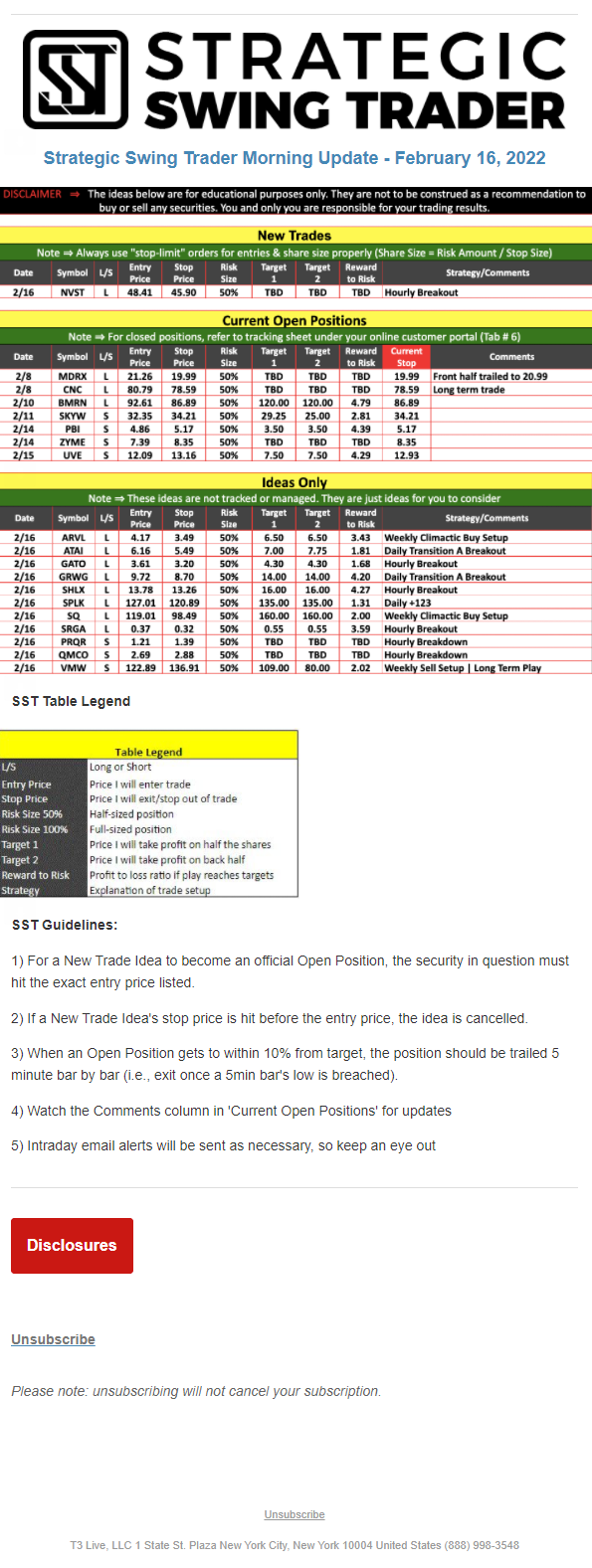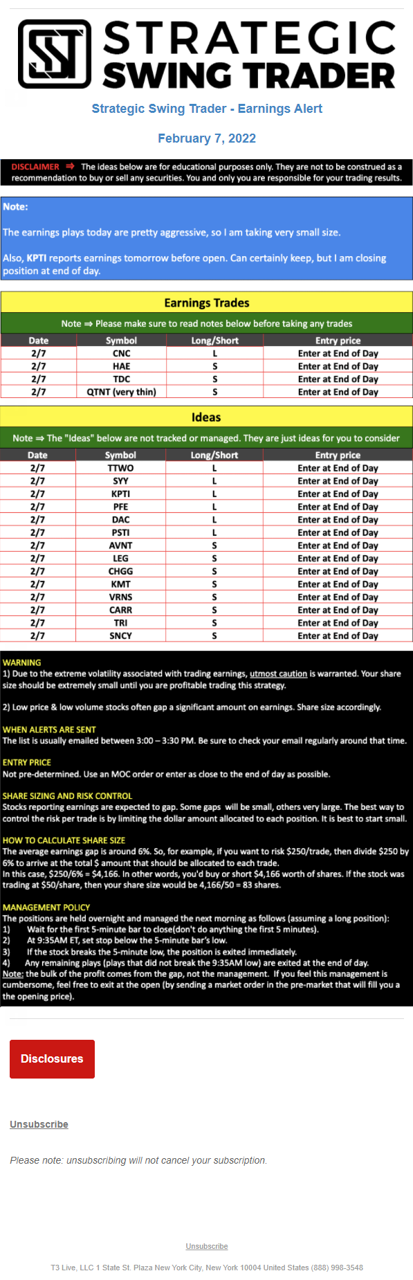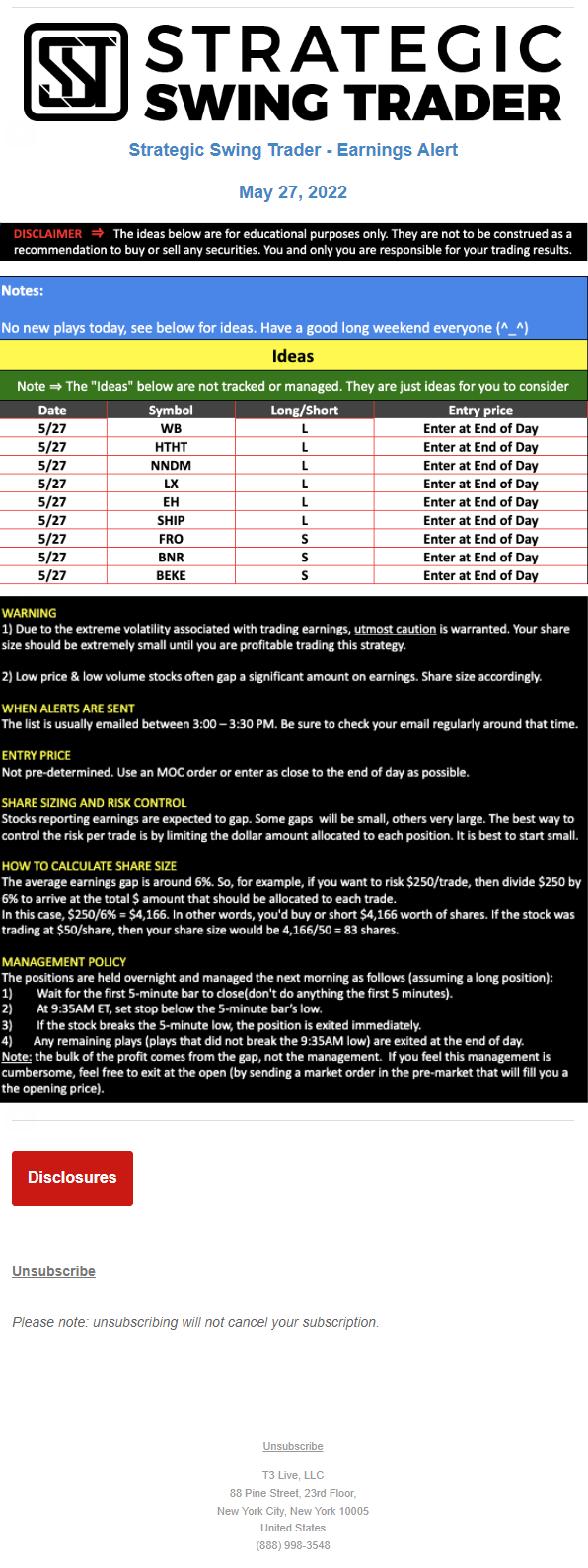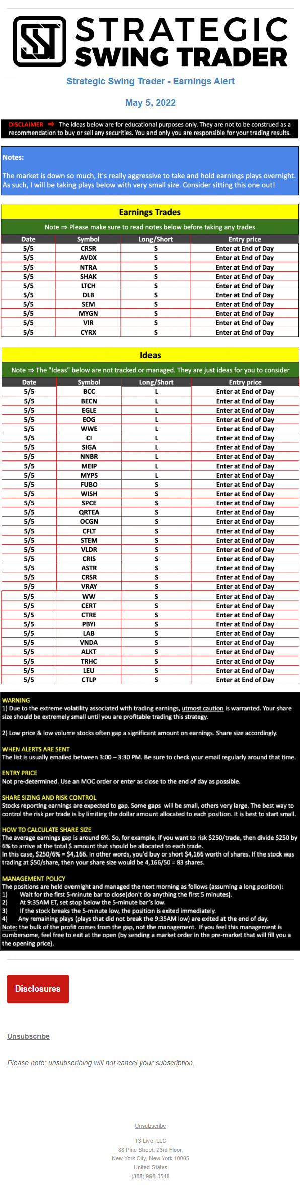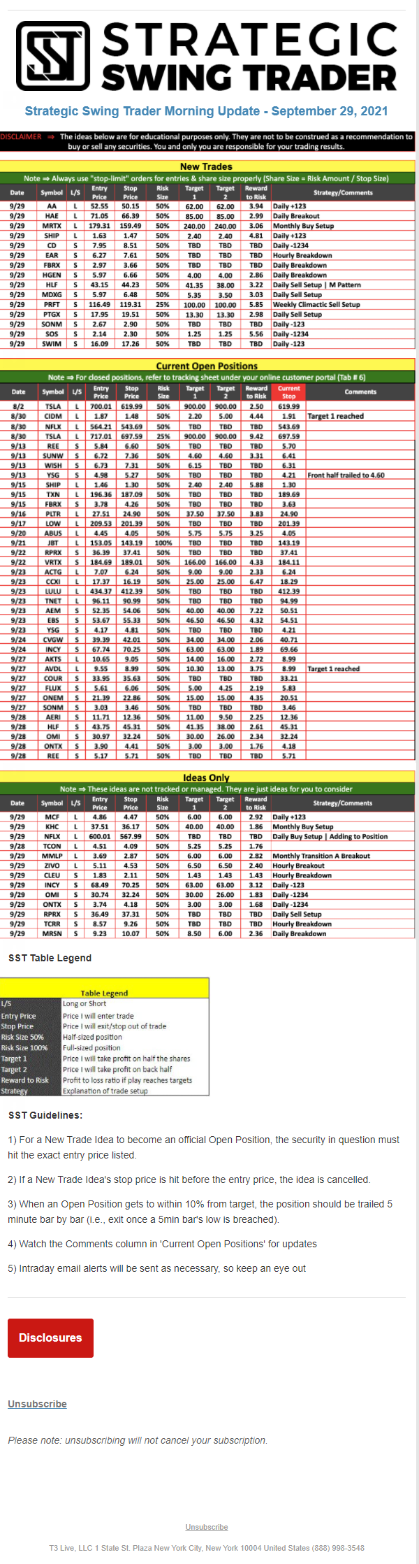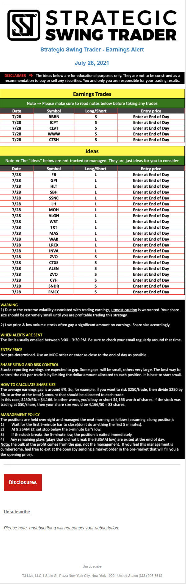 The programs that T3 Live distributes (including the “Virtual Trading Floor®,” articles, commentary, videos, blogs and social media postings) are for informational and educational purposes only. No one should consider the information disseminated by T3 Live to be personalized investment advice, a recommendation to buy, sell or hold any investment, an offer (or a solicitation of an offer) to buy or sell any investment, or the provision of any other kind of advice that would require T3 Live to register as a broker-dealer, investment adviser or similar entity. No one associated with T3 Live is authorized to make any representation to the contrary.