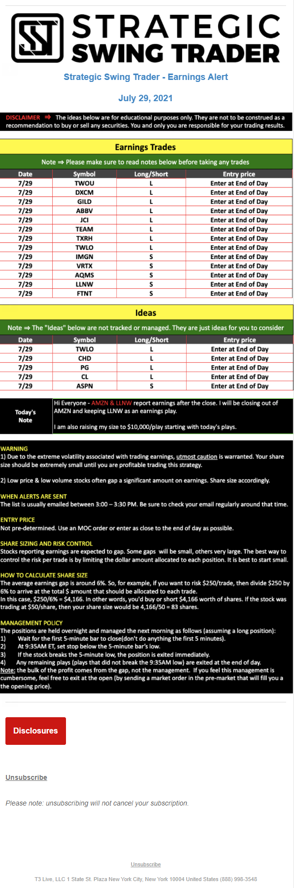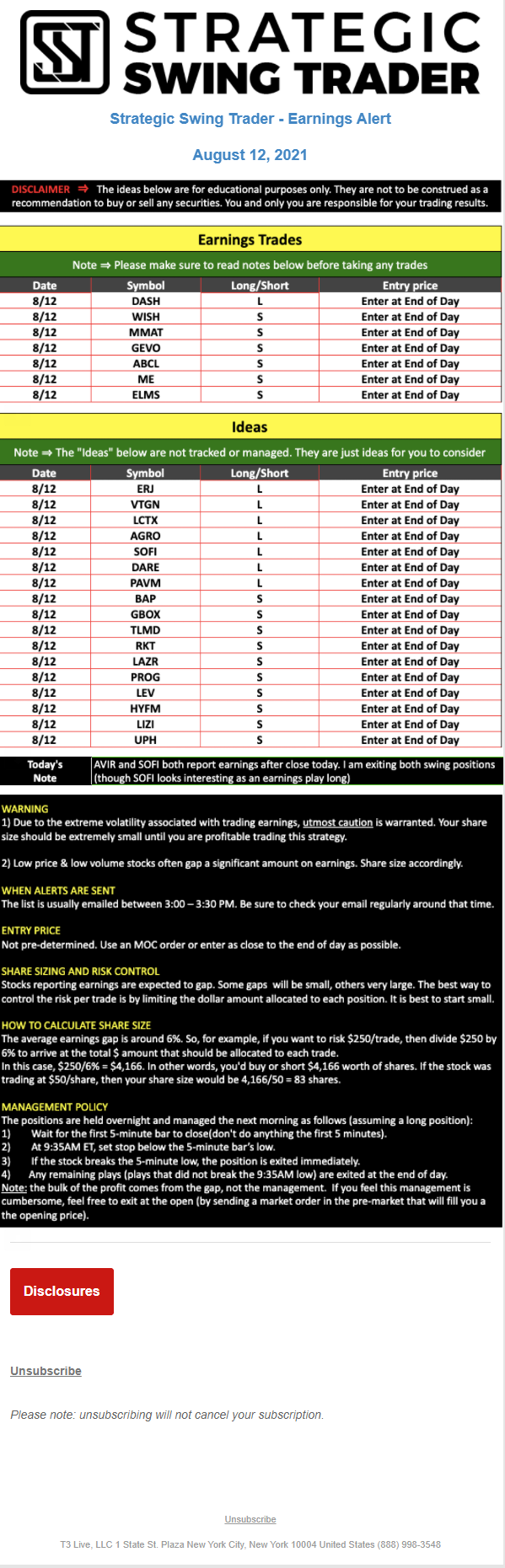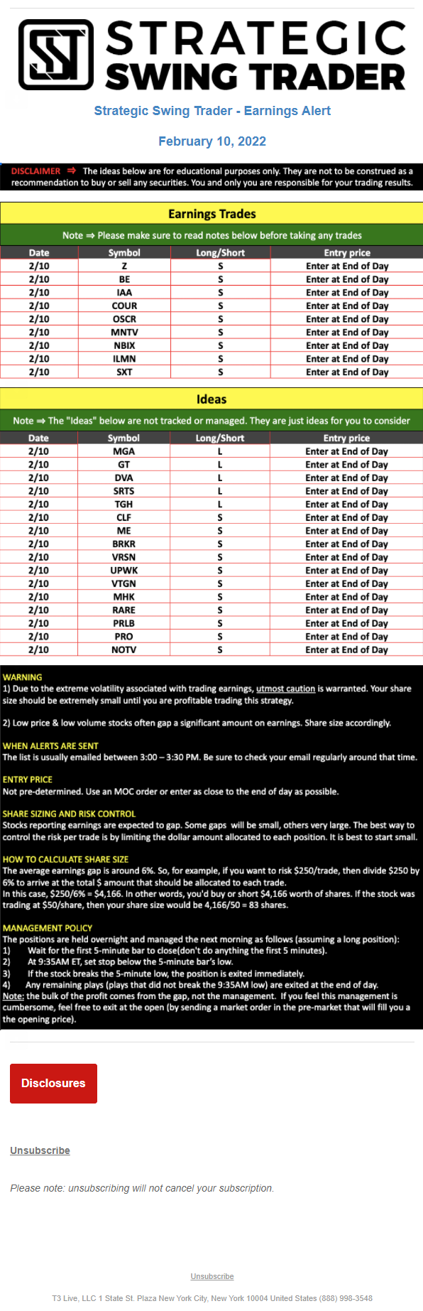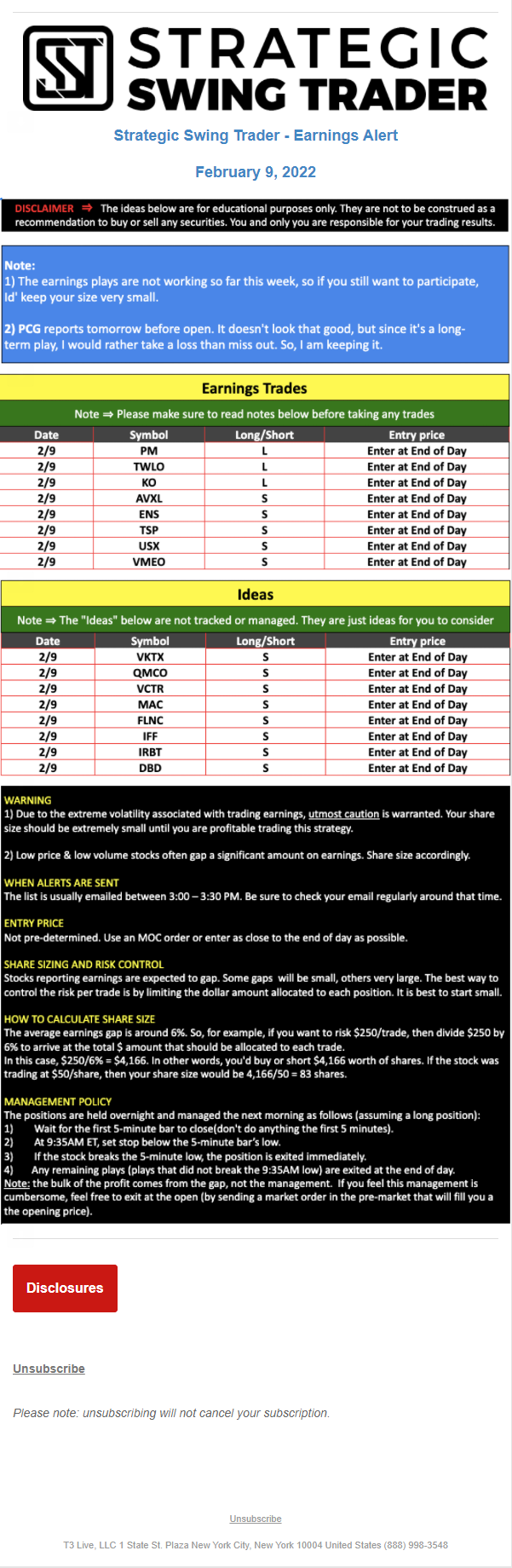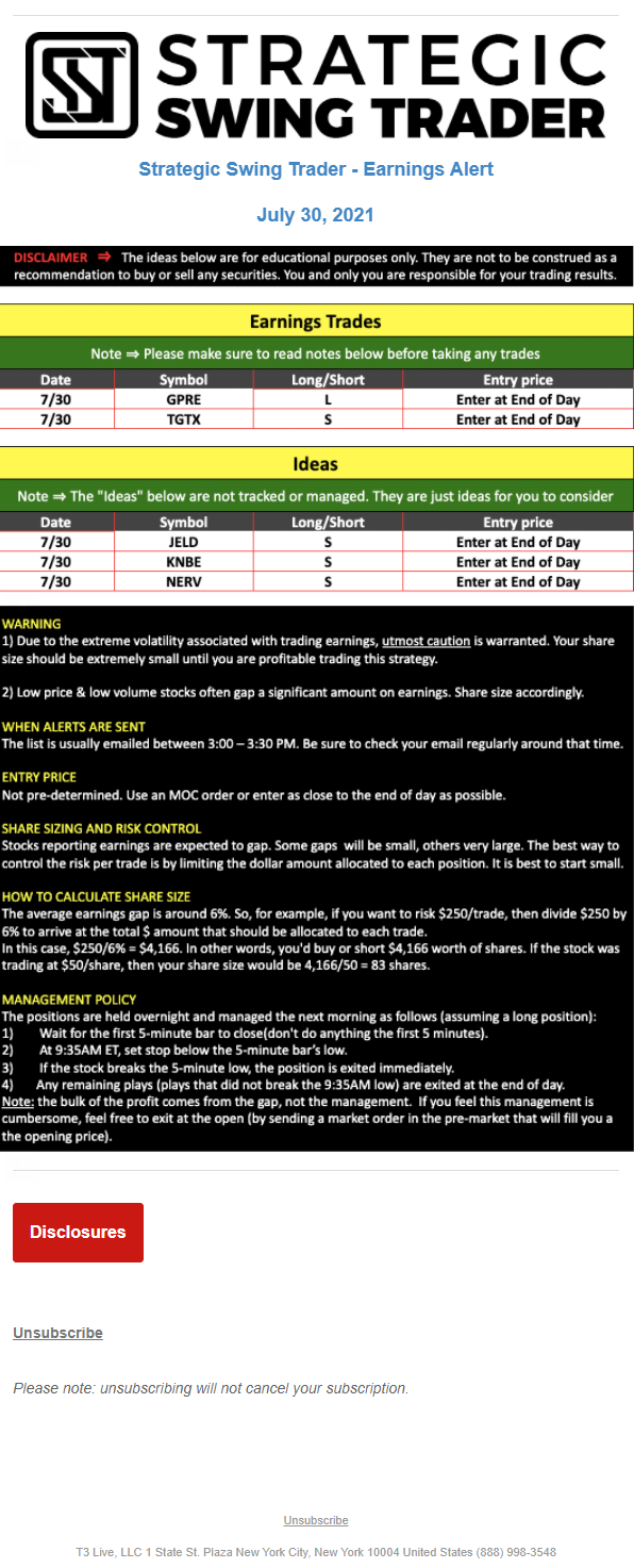 The programs that T3 Live distributes (including the “Virtual Trading Floor®,” articles, commentary, videos, blogs and social media postings) are for informational and educational purposes only. No one should consider the information disseminated by T3 Live to be personalized investment advice, a recommendation to buy, sell or hold any investment, an offer (or a solicitation of an offer) to buy or sell any investment, or the provision of any other kind of advice that would require T3 Live to register as a broker-dealer, investment adviser or similar entity. No one associated with T3 Live is authorized to make any representation to the contrary.