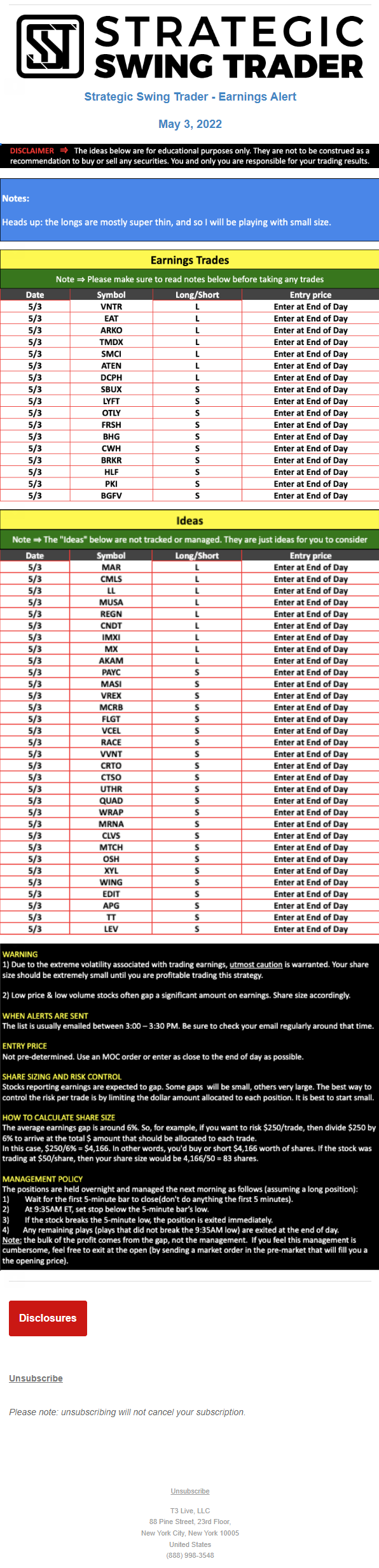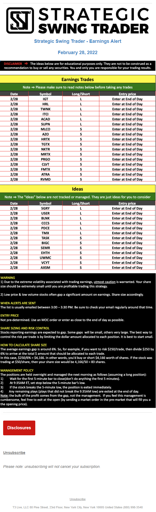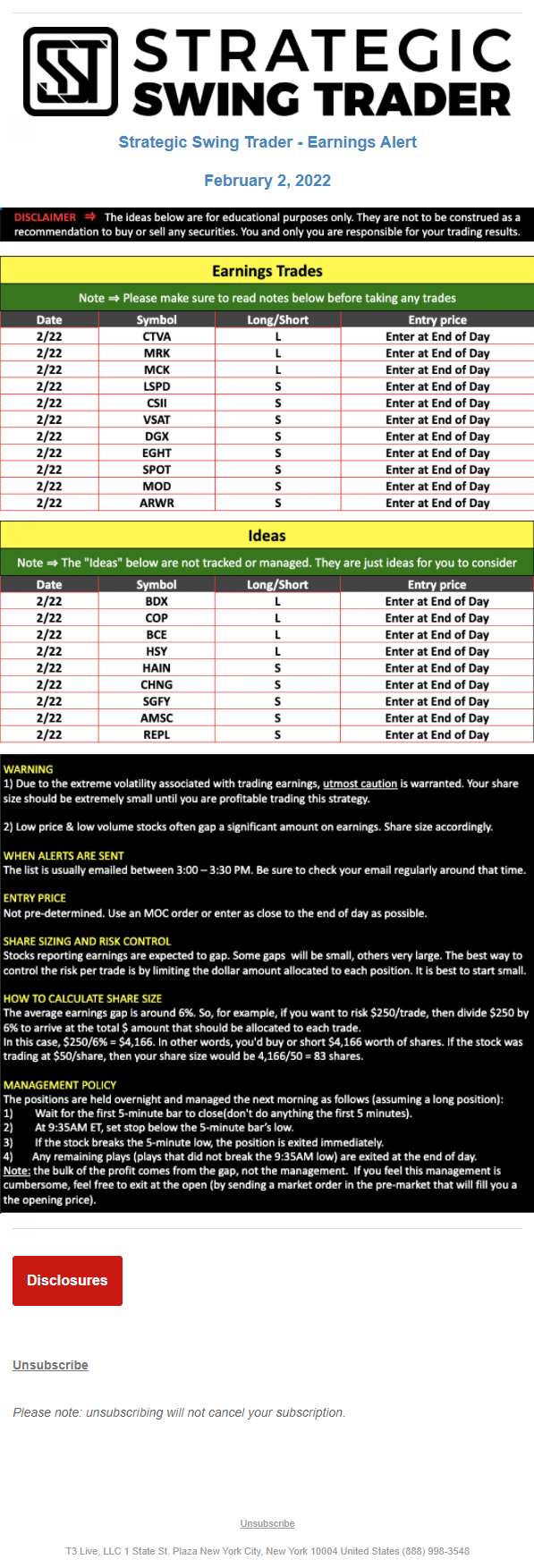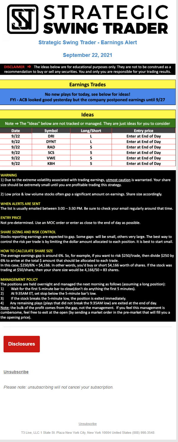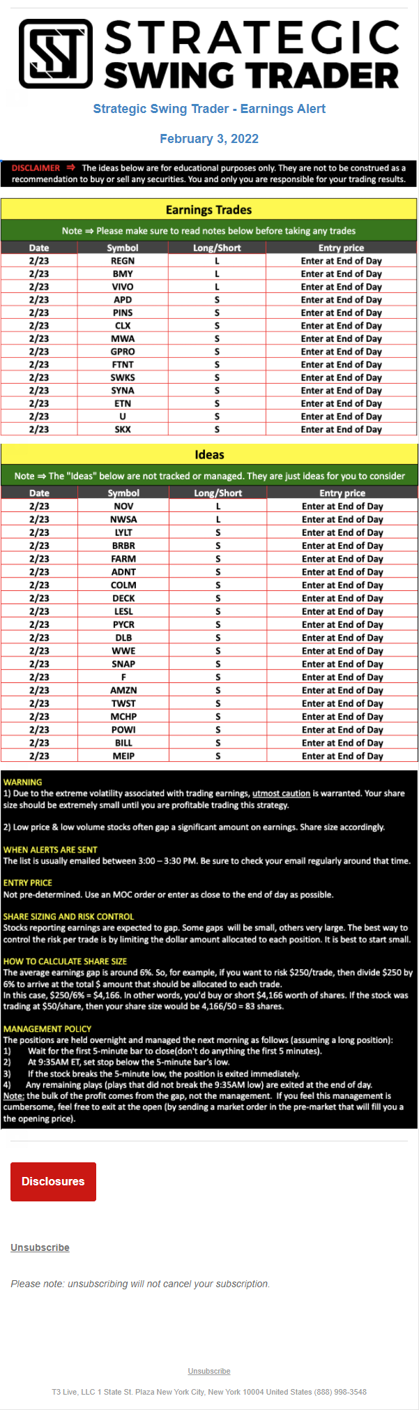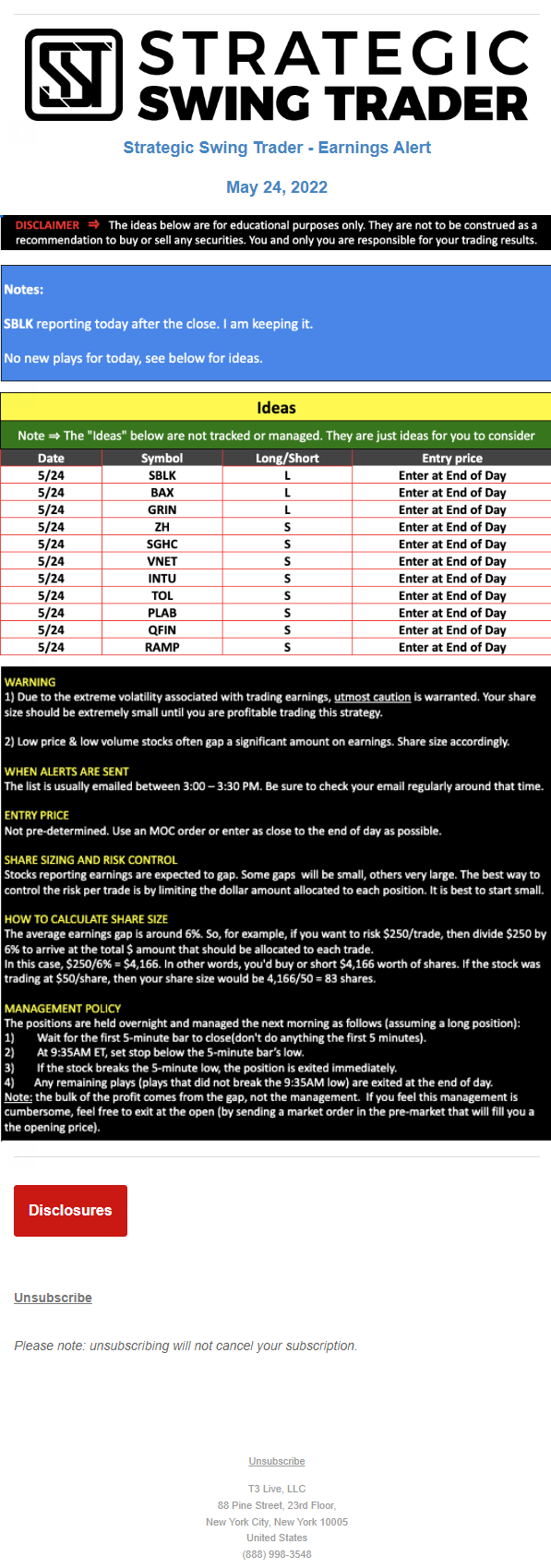 The programs that T3 Live distributes (including the “Virtual Trading Floor®,” articles, commentary, videos, blogs and social media postings) are for informational and educational purposes only. No one should consider the information disseminated by T3 Live to be personalized investment advice, a recommendation to buy, sell or hold any investment, an offer (or a solicitation of an offer) to buy or sell any investment, or the provision of any other kind of advice that would require T3 Live to register as a broker-dealer, investment adviser or similar entity. No one associated with T3 Live is authorized to make any representation to the contrary.