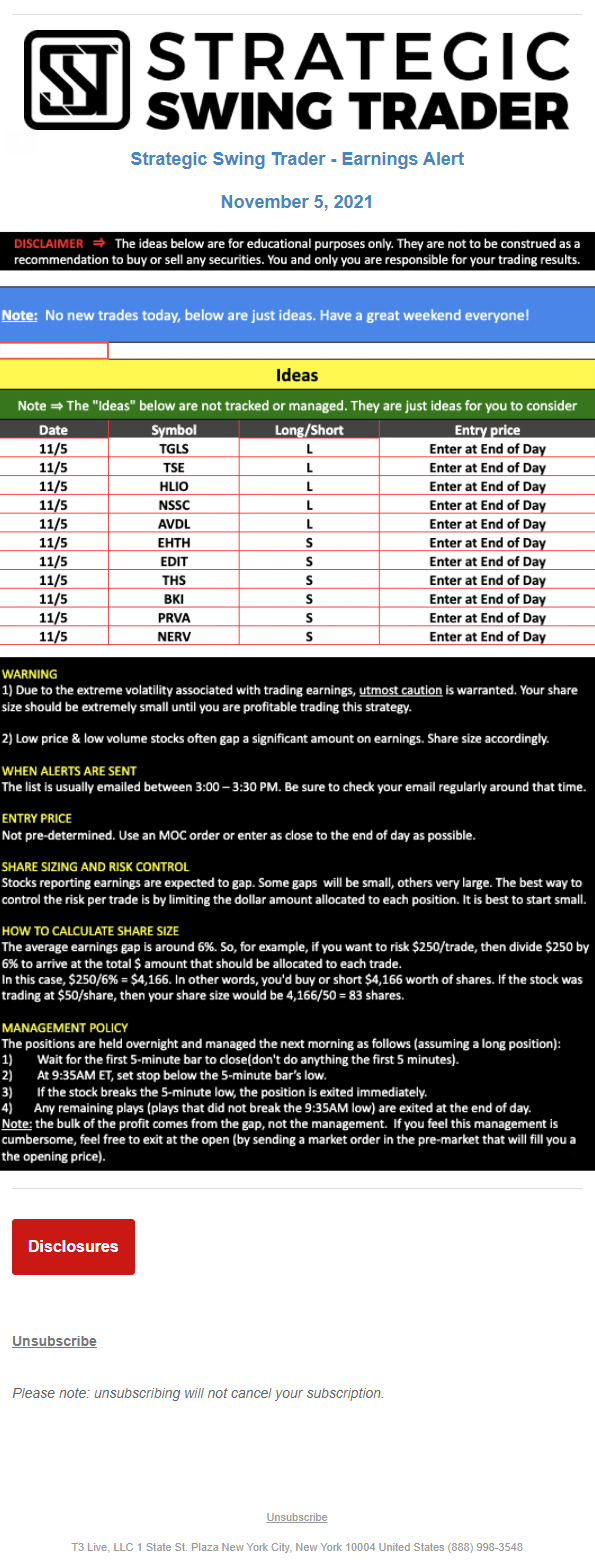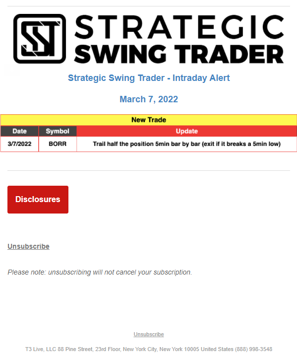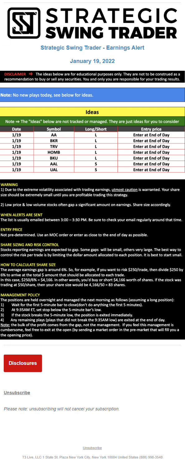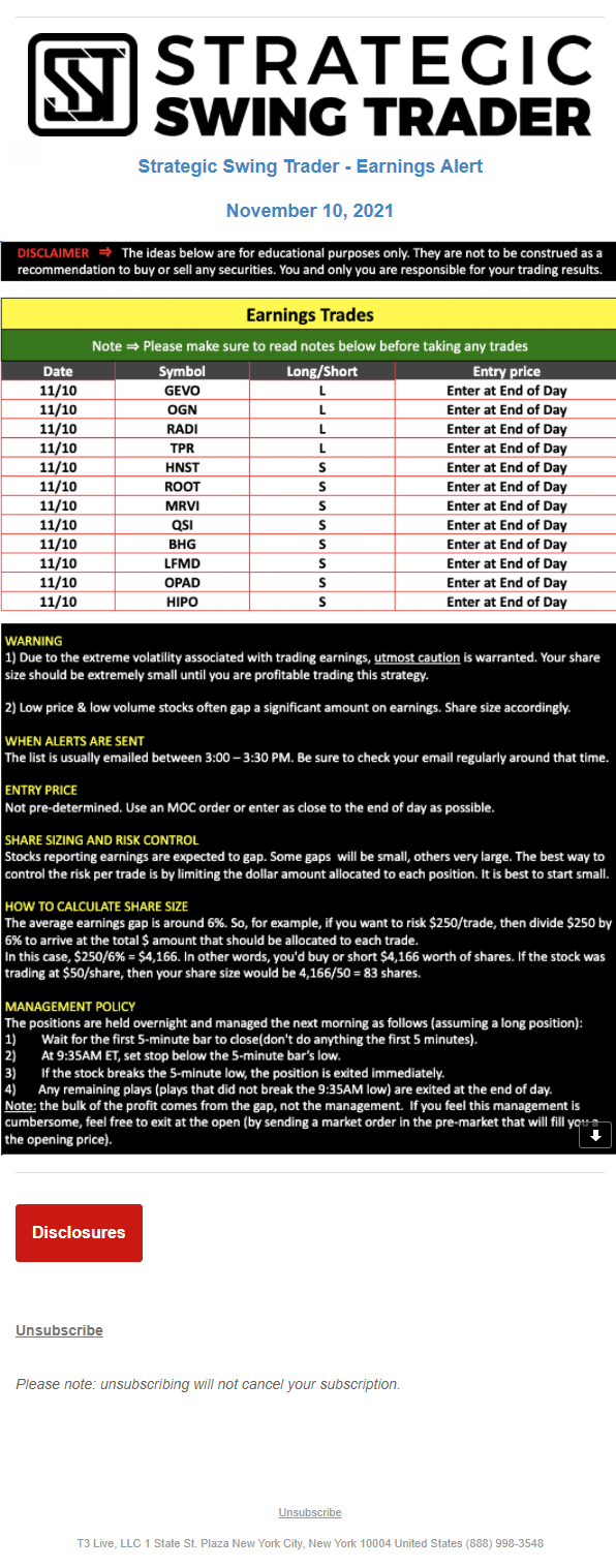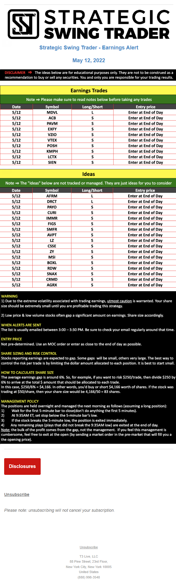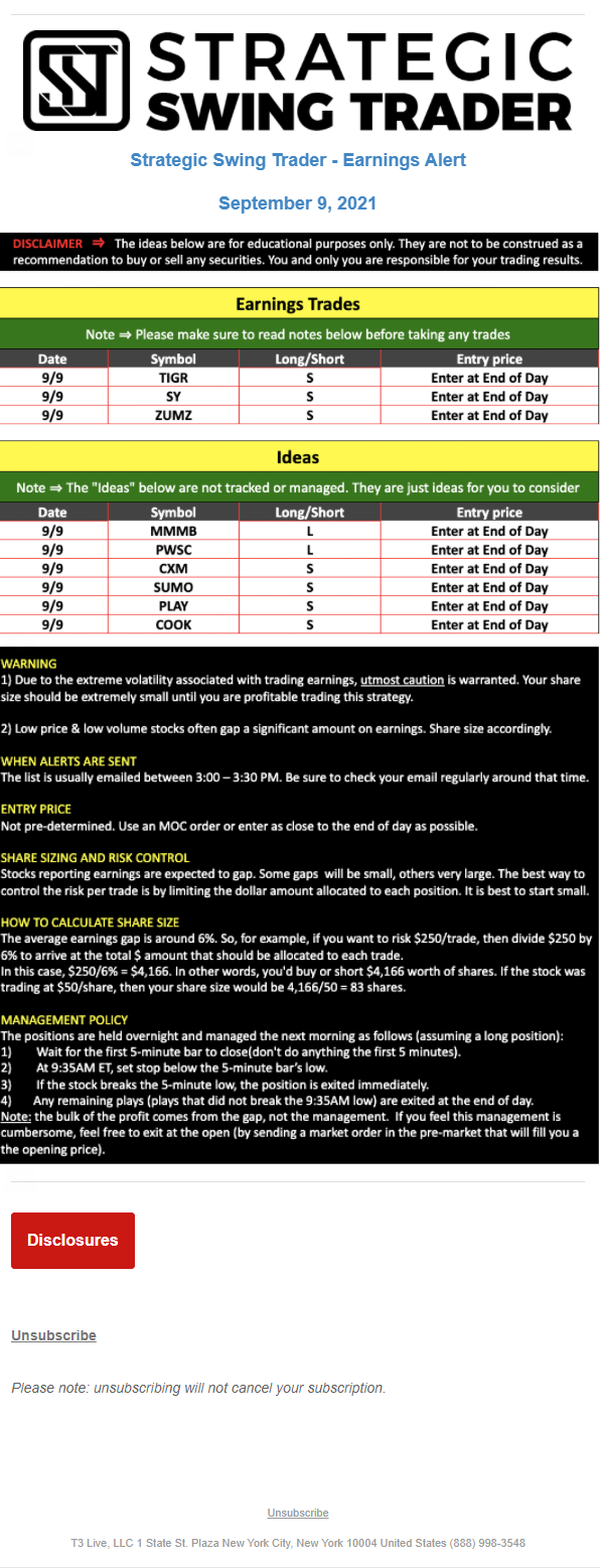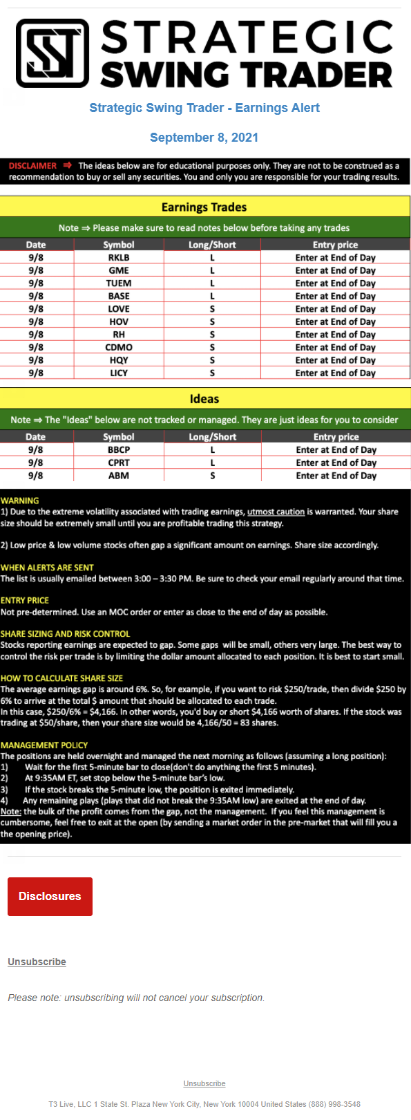 The programs that T3 Live distributes (including the “Virtual Trading Floor®,” articles, commentary, videos, blogs and social media postings) are for informational and educational purposes only. No one should consider the information disseminated by T3 Live to be personalized investment advice, a recommendation to buy, sell or hold any investment, an offer (or a solicitation of an offer) to buy or sell any investment, or the provision of any other kind of advice that would require T3 Live to register as a broker-dealer, investment adviser or similar entity. No one associated with T3 Live is authorized to make any representation to the contrary.