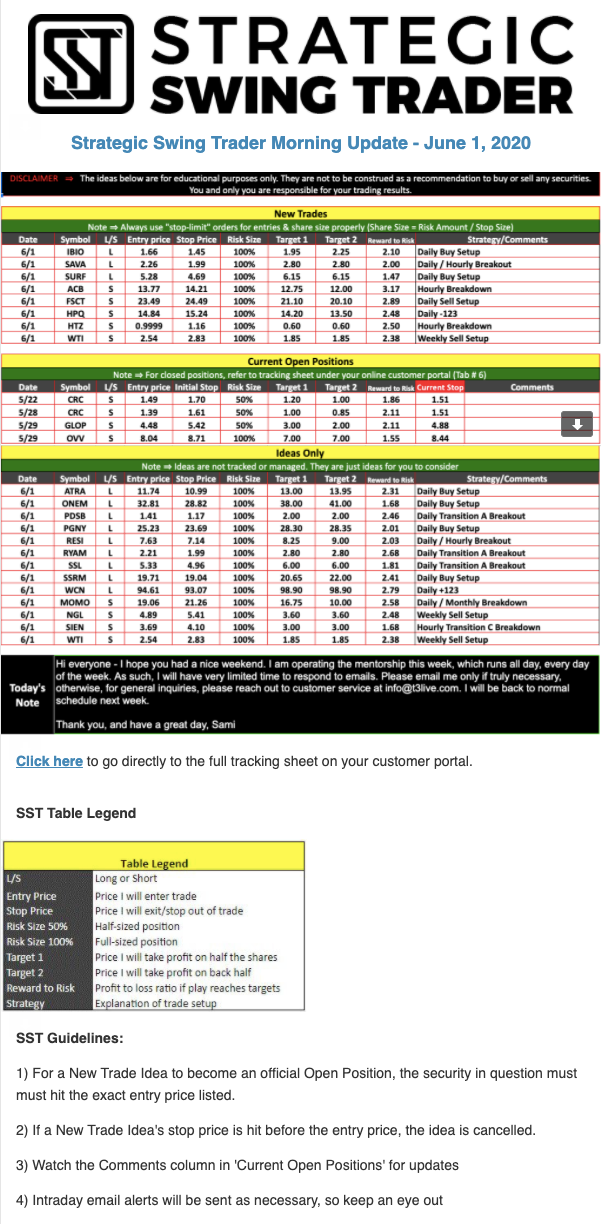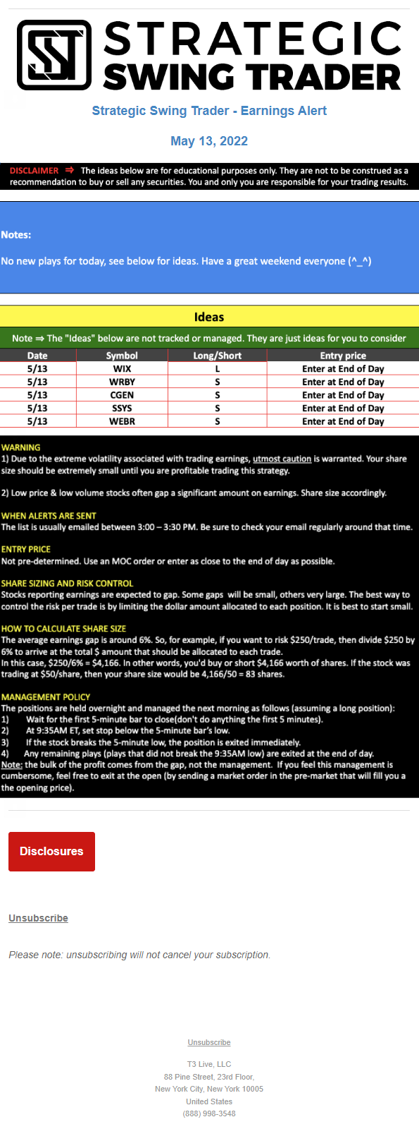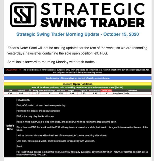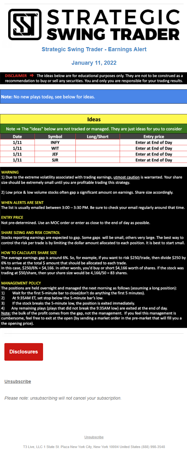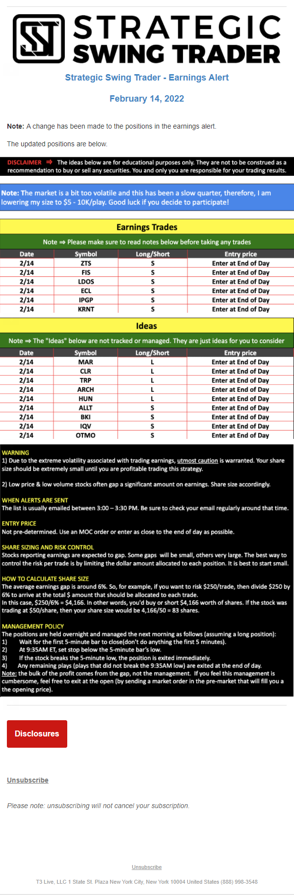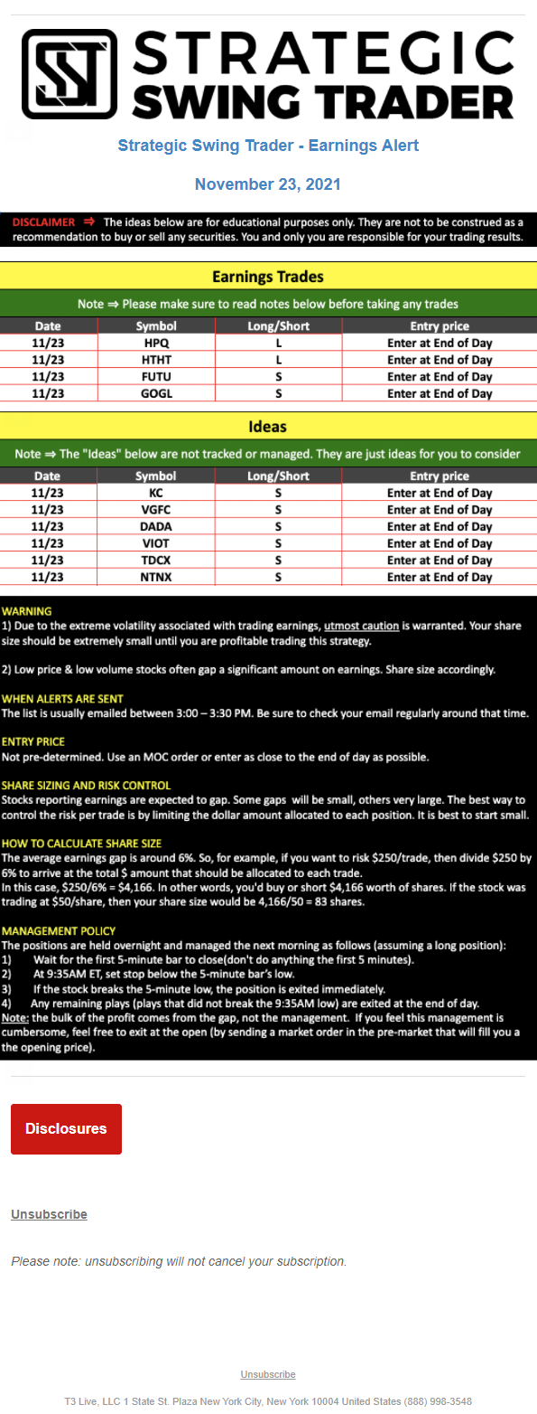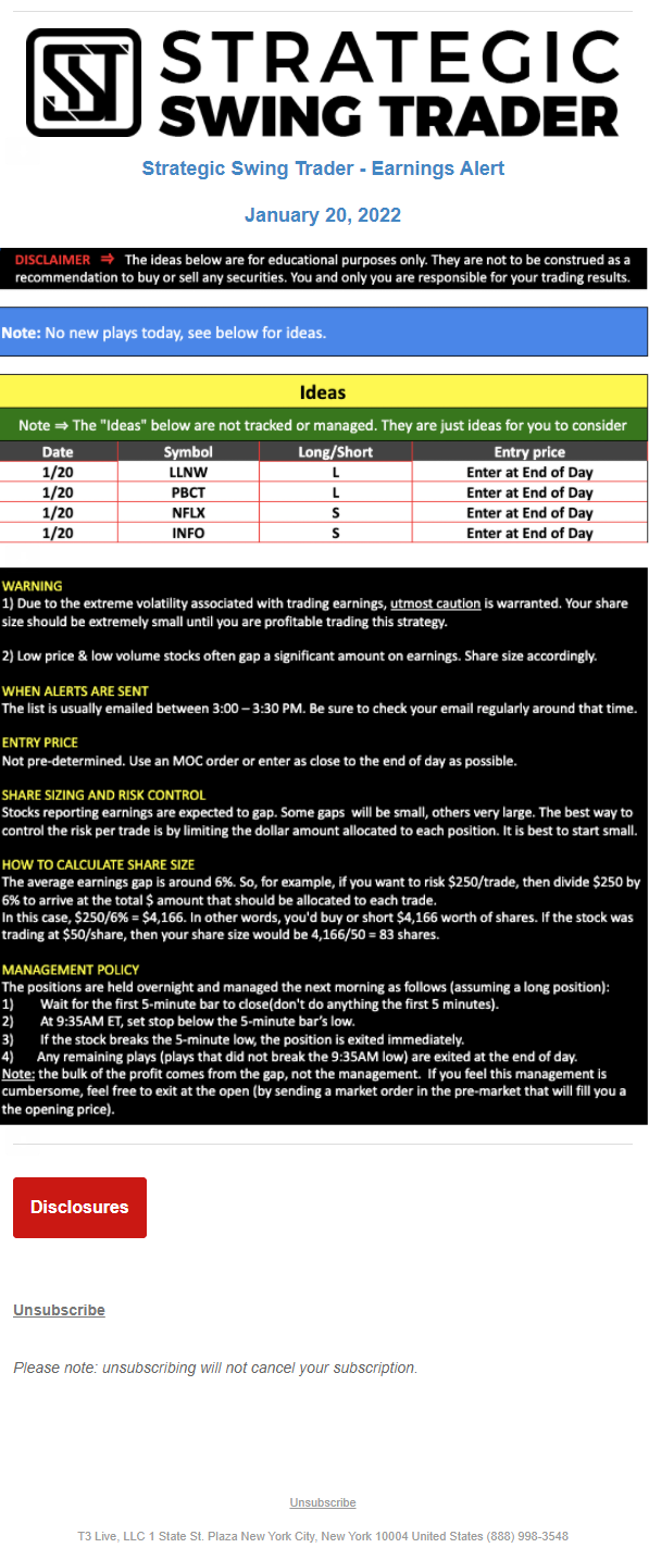 The programs that T3 Live distributes (including the “Virtual Trading Floor®,” articles, commentary, videos, blogs and social media postings) are for informational and educational purposes only. No one should consider the information disseminated by T3 Live to be personalized investment advice, a recommendation to buy, sell or hold any investment, an offer (or a solicitation of an offer) to buy or sell any investment, or the provision of any other kind of advice that would require T3 Live to register as a broker-dealer, investment adviser or similar entity. No one associated with T3 Live is authorized to make any representation to the contrary.