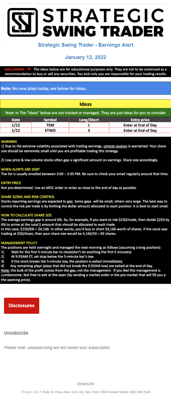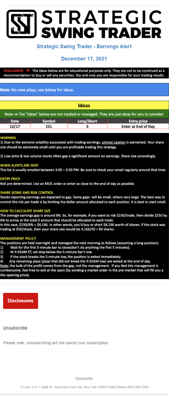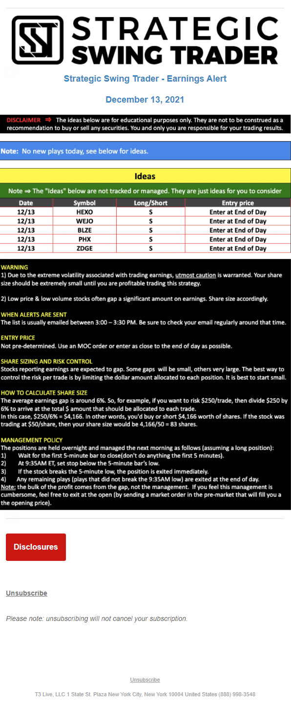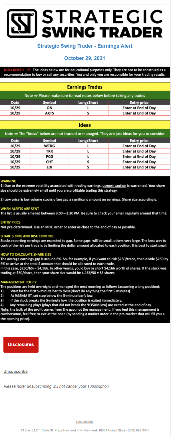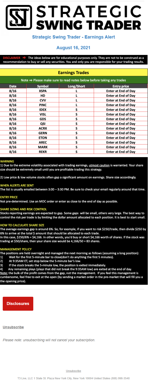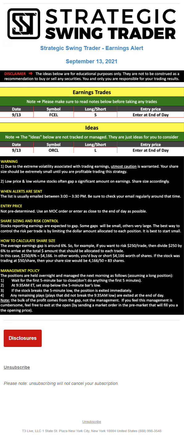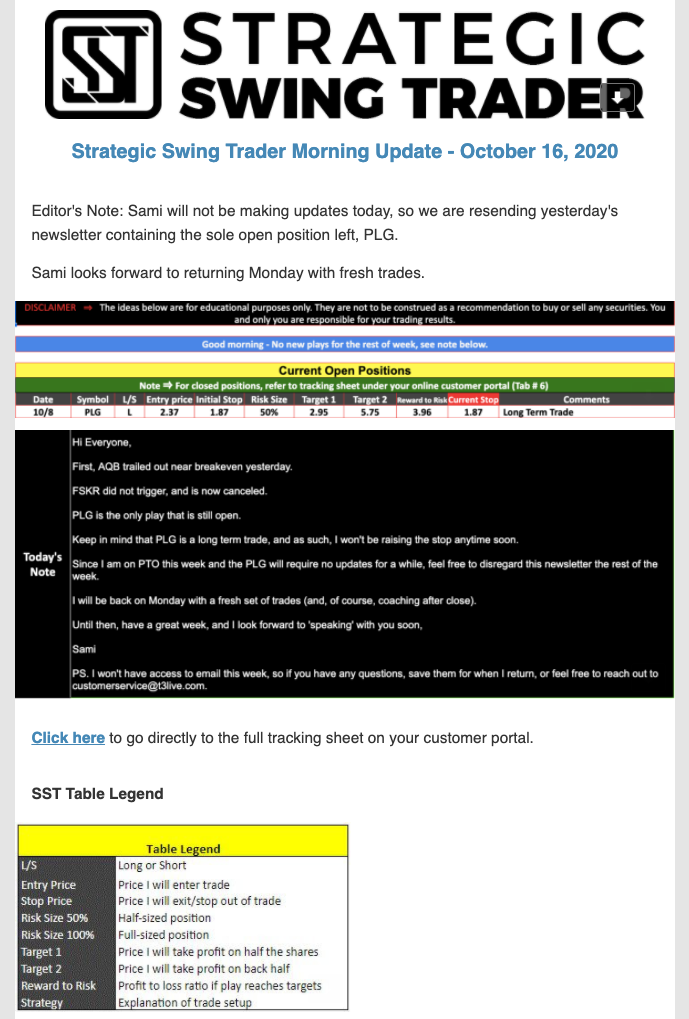 The programs that T3 Live distributes (including the “Virtual Trading Floor®,” articles, commentary, videos, blogs and social media postings) are for informational and educational purposes only. No one should consider the information disseminated by T3 Live to be personalized investment advice, a recommendation to buy, sell or hold any investment, an offer (or a solicitation of an offer) to buy or sell any investment, or the provision of any other kind of advice that would require T3 Live to register as a broker-dealer, investment adviser or similar entity. No one associated with T3 Live is authorized to make any representation to the contrary.