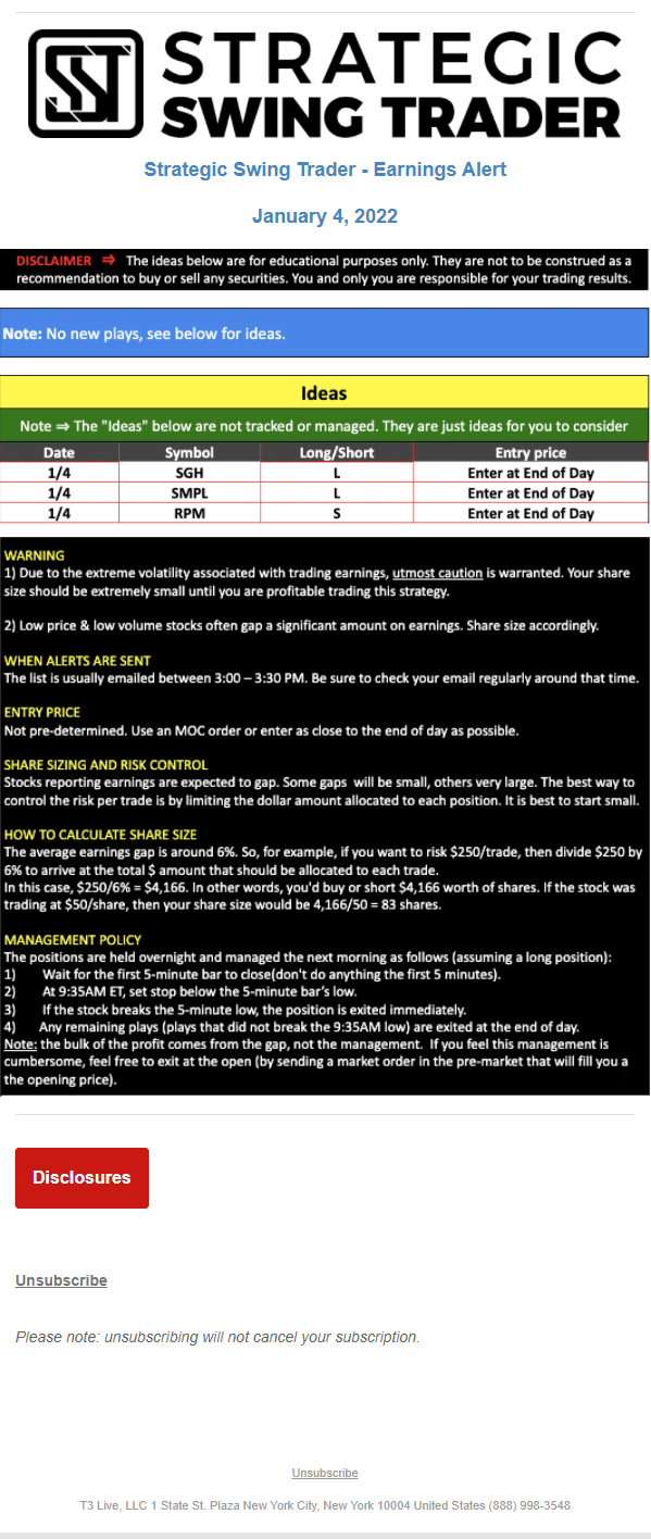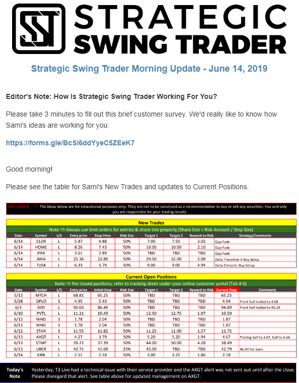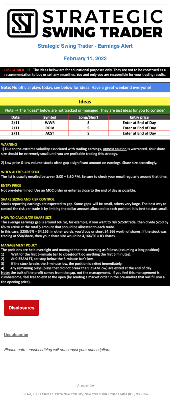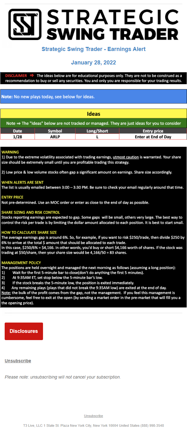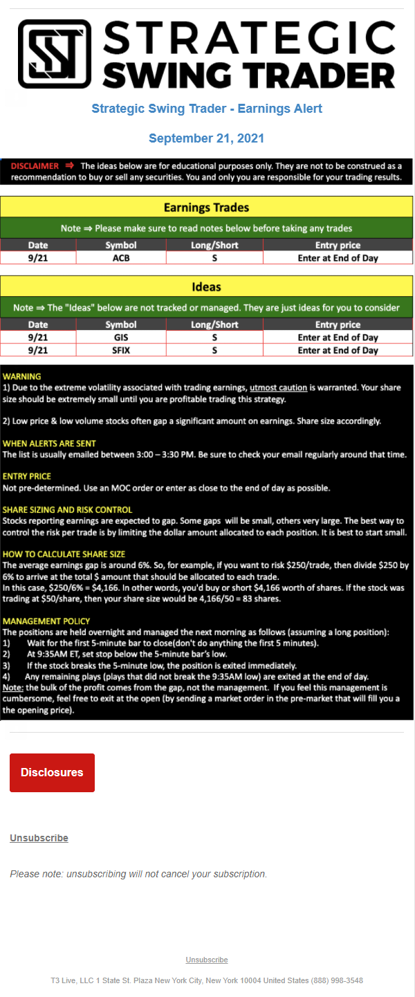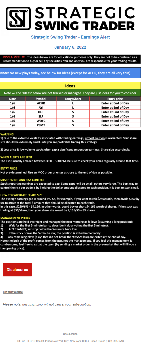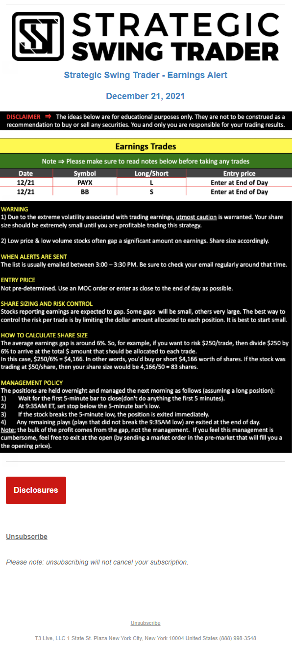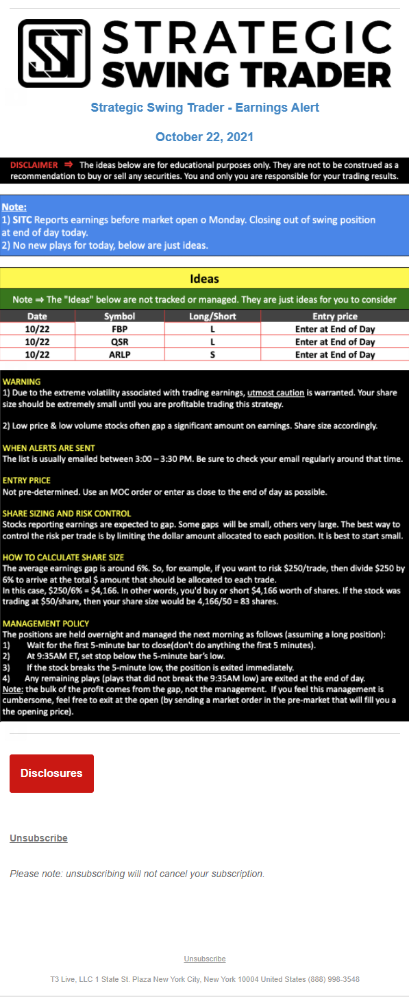 The programs that T3 Live distributes (including the “Virtual Trading Floor®,” articles, commentary, videos, blogs and social media postings) are for informational and educational purposes only. No one should consider the information disseminated by T3 Live to be personalized investment advice, a recommendation to buy, sell or hold any investment, an offer (or a solicitation of an offer) to buy or sell any investment, or the provision of any other kind of advice that would require T3 Live to register as a broker-dealer, investment adviser or similar entity. No one associated with T3 Live is authorized to make any representation to the contrary.