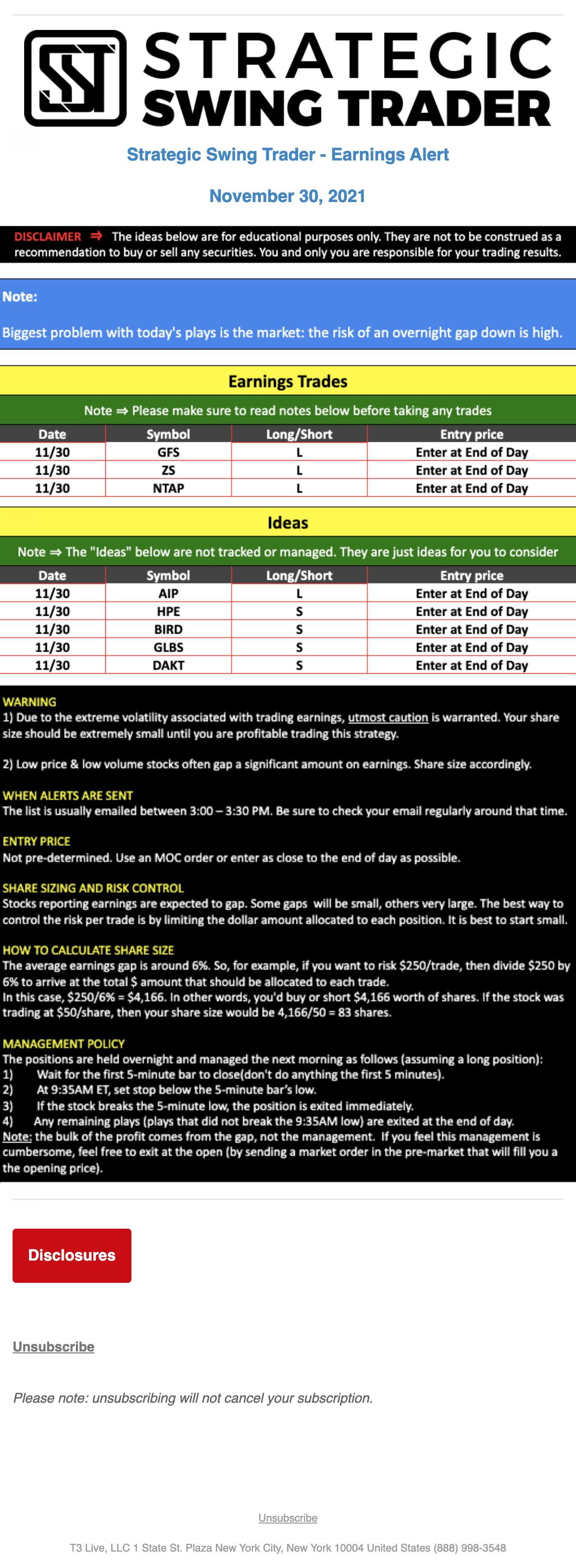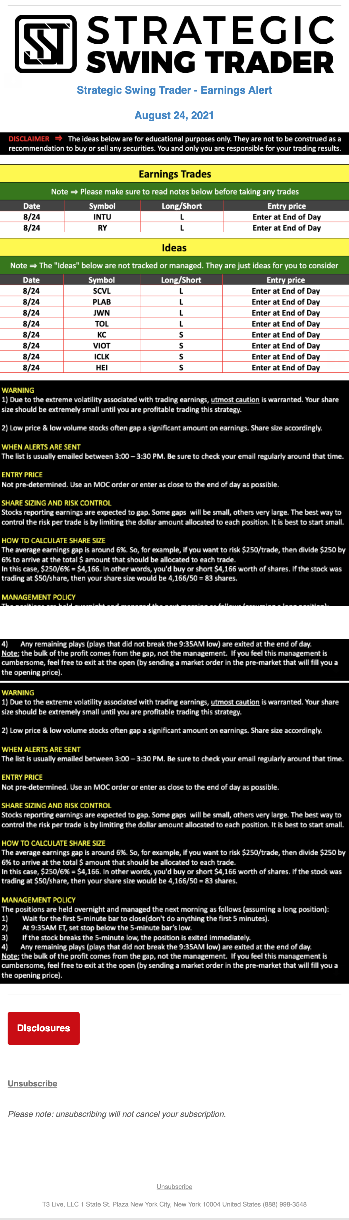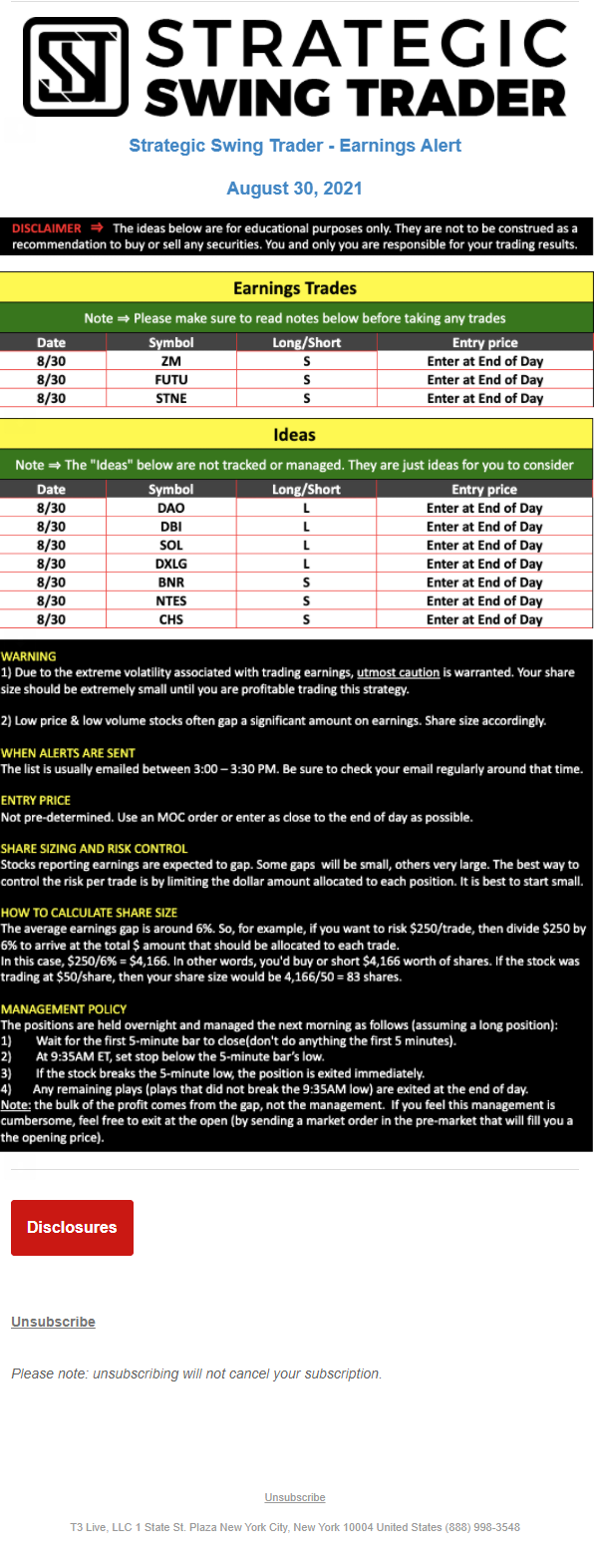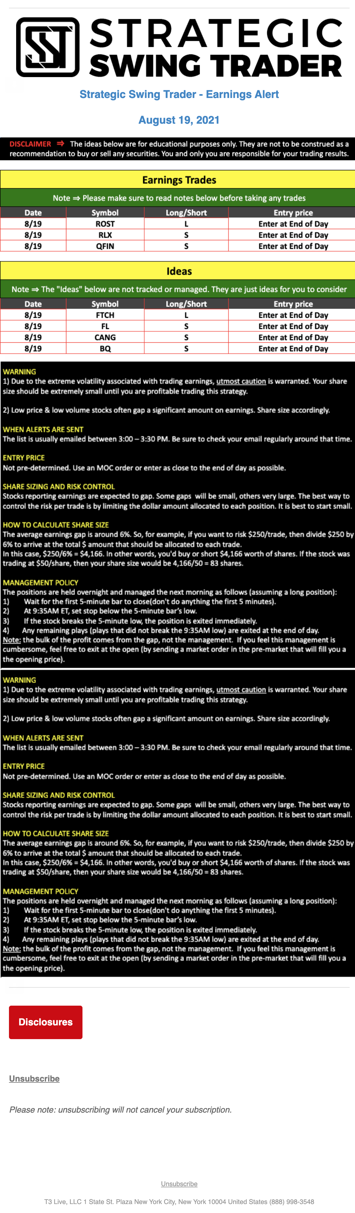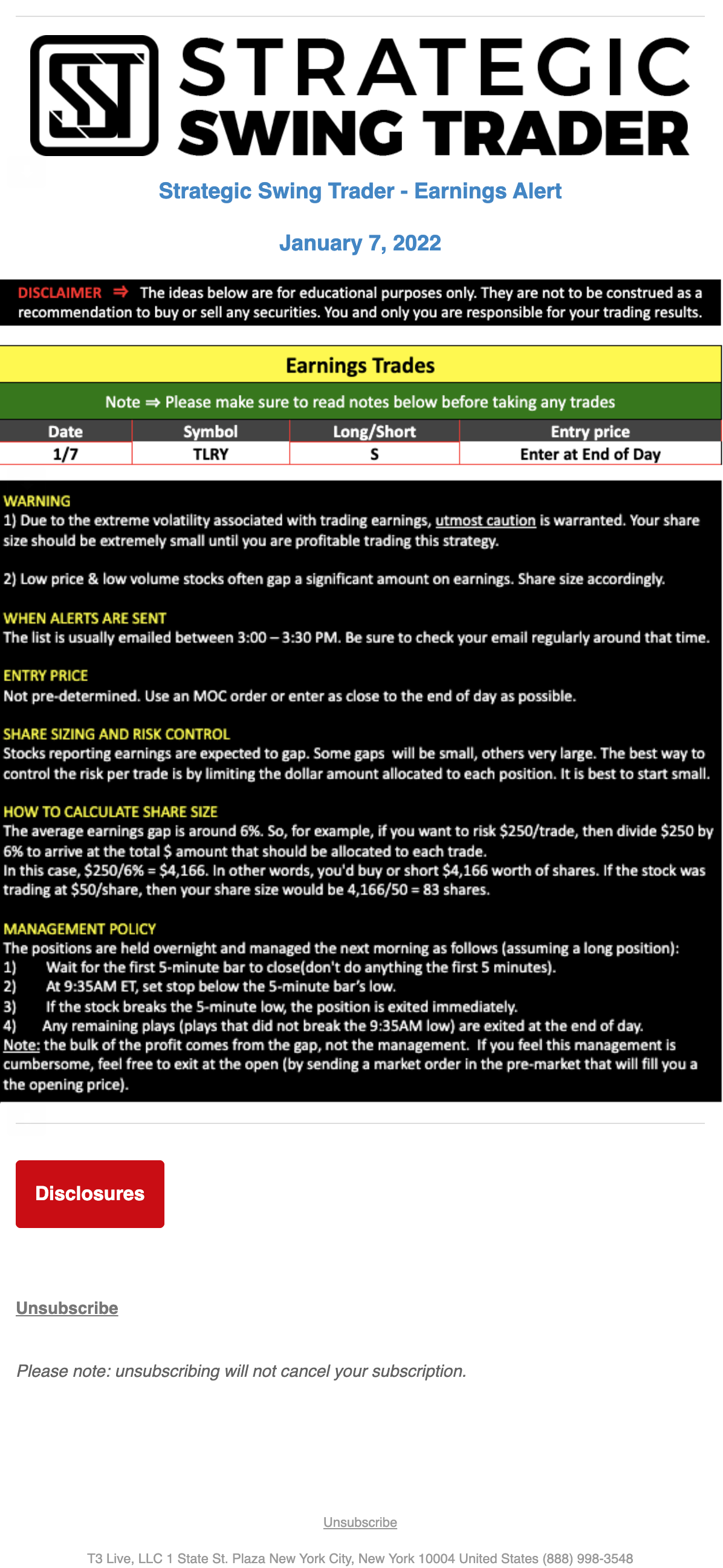 T3 Live, LLC is a financial publisher that disseminates information about economic, business, and capital markets issues through various media. T3 Live is not a Broker-Dealer, an Investment Adviser, or any other type of business subject to regulation by the SEC, CFTC, state securities regulators or any “self-regulatory organization” (such as FINRA). Although T3 Live and T3 Trading Group, LLC are affiliated companies by virtue of common ownership, the companies are managed separately and engage in different businesses.