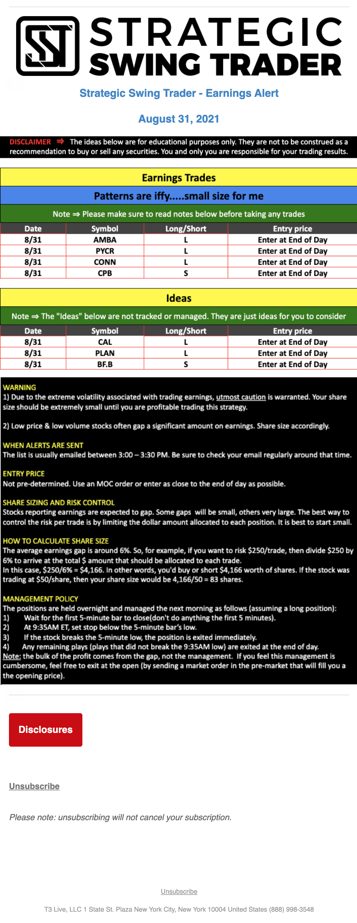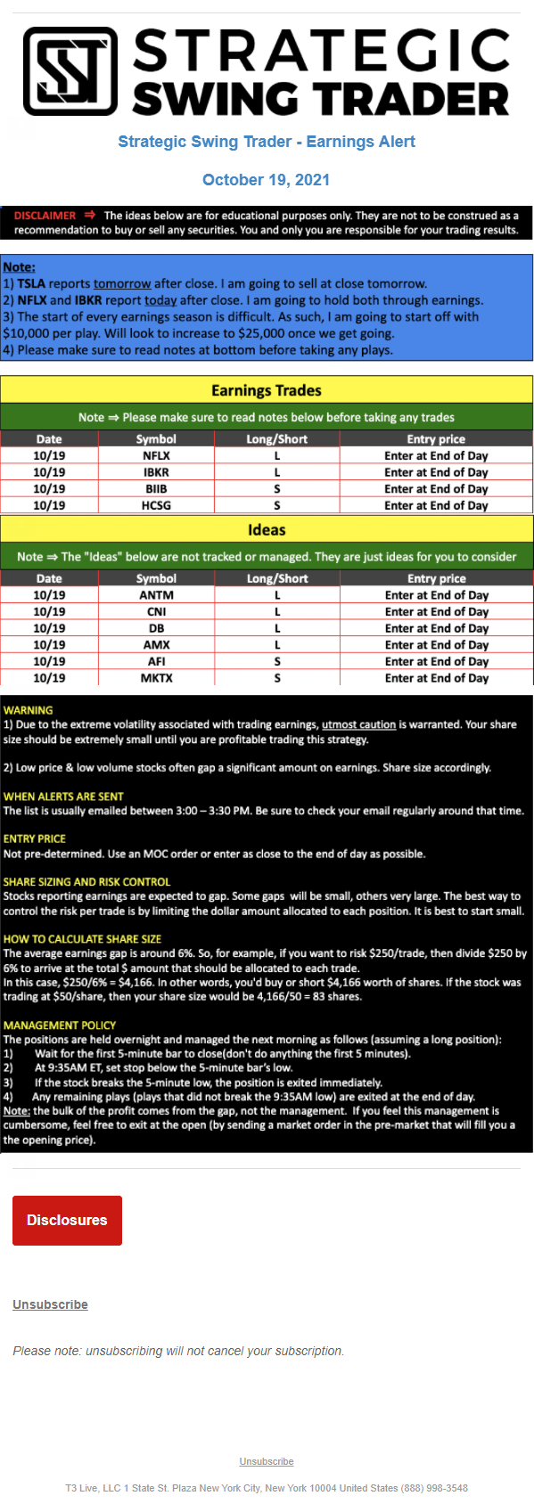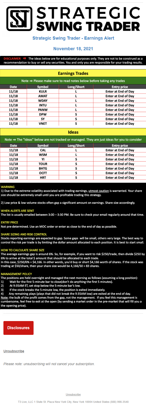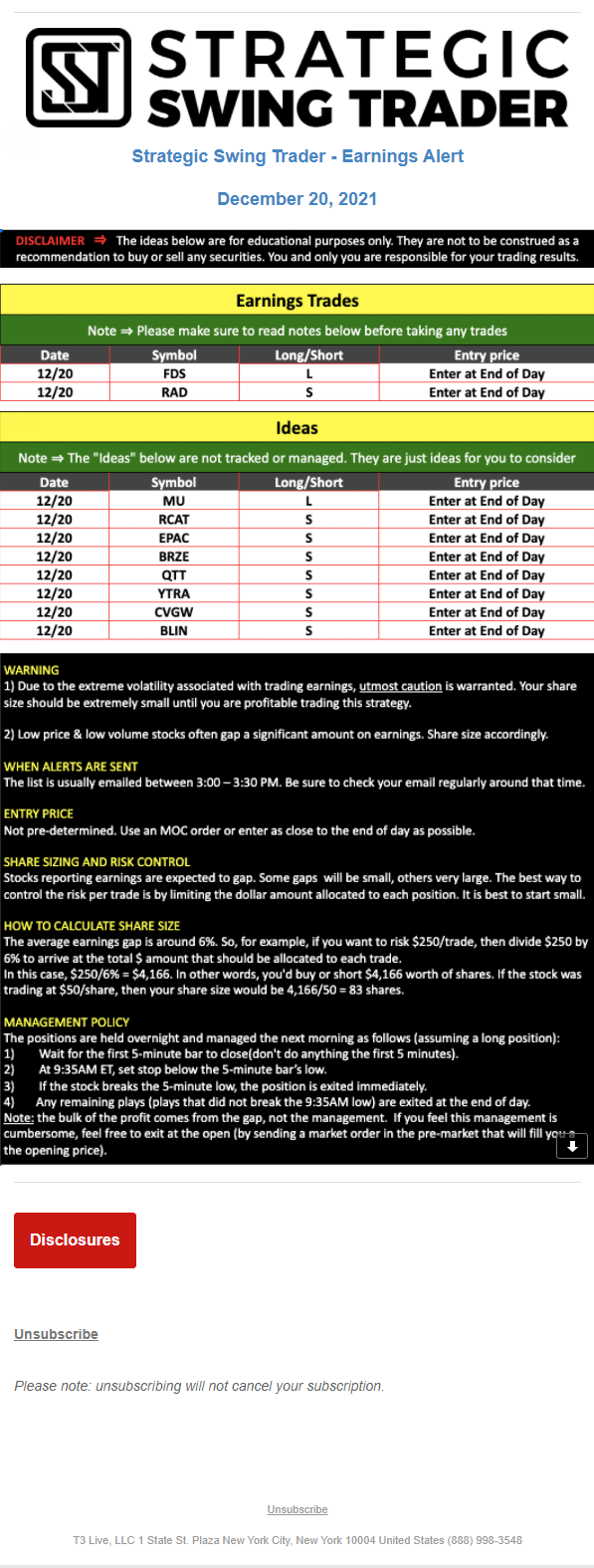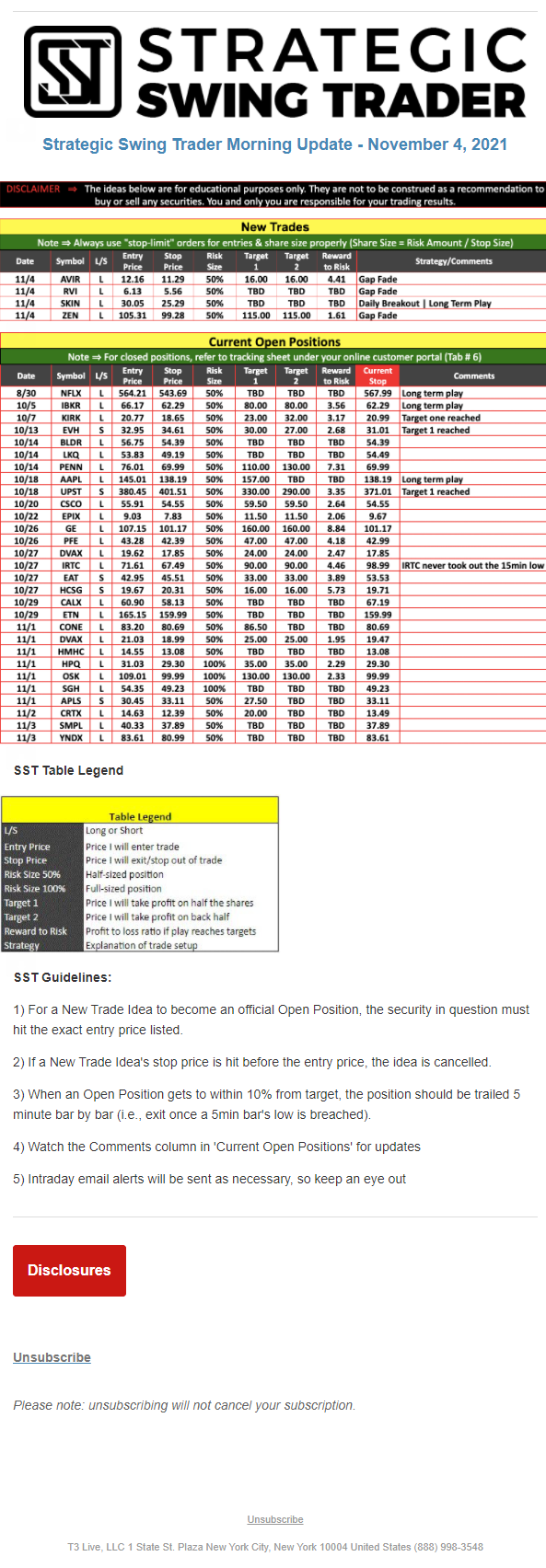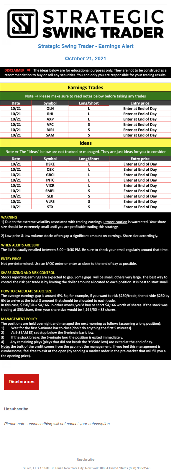 T3 Live, LLC is a financial publisher that disseminates information about economic, business, and capital markets issues through various media. T3 Live is not a Broker-Dealer, an Investment Adviser, or any other type of business subject to regulation by the SEC, CFTC, state securities regulators or any “self-regulatory organization” (such as FINRA). Although T3 Live and T3 Trading Group, LLC are affiliated companies by virtue of common ownership, the companies are managed separately and engage in different businesses.