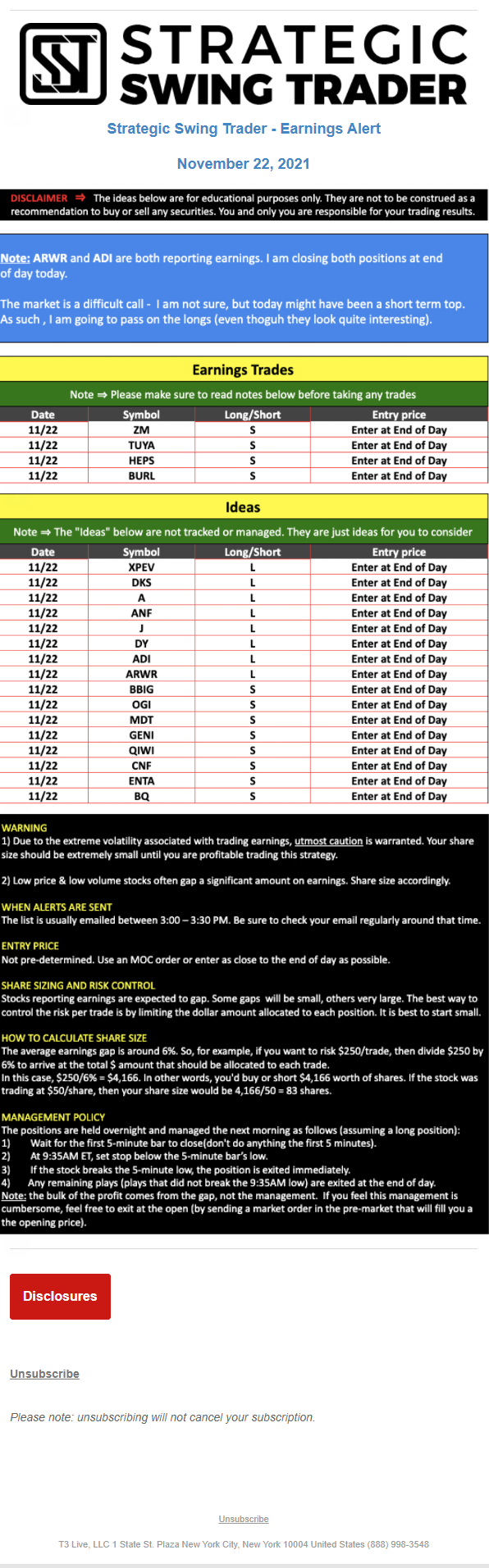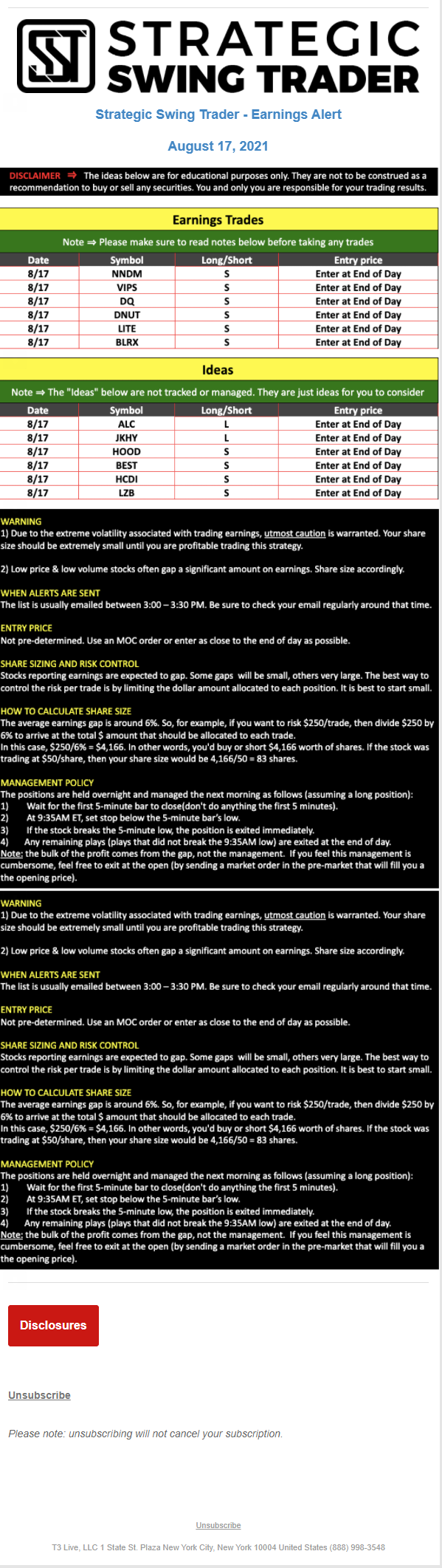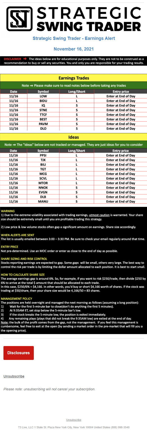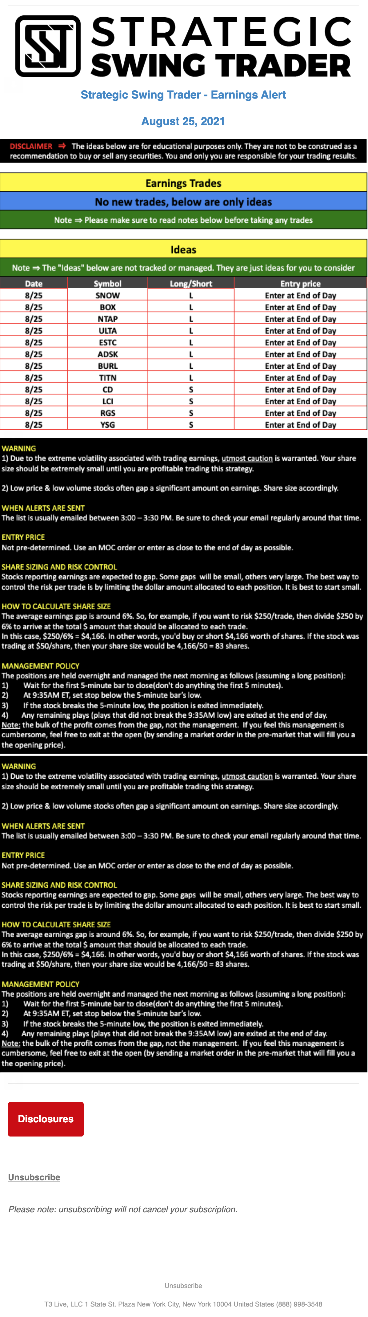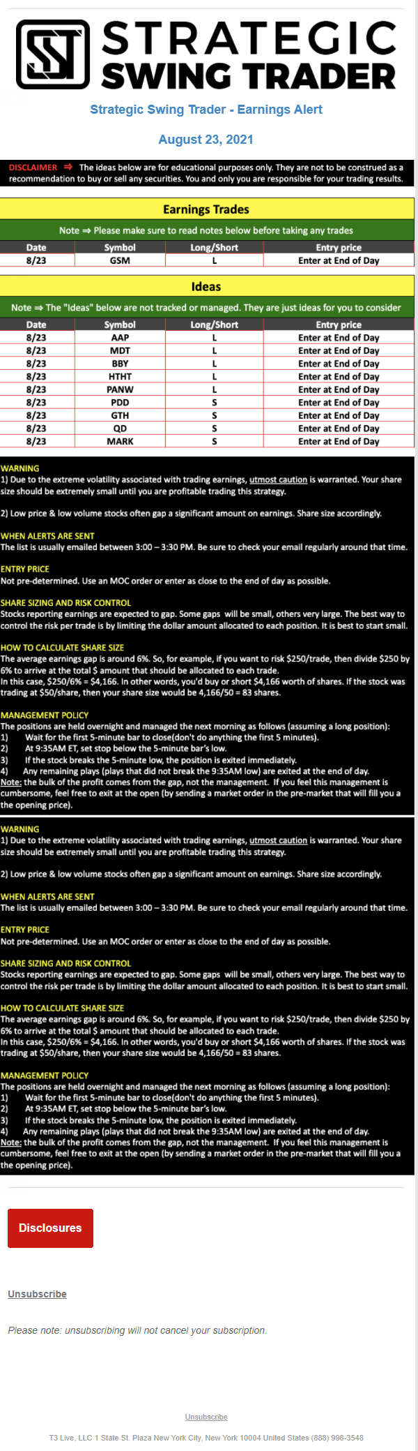 T3 Live, LLC is a financial publisher that disseminates information about economic, business, and capital markets issues through various media. T3 Live is not a Broker-Dealer, an Investment Adviser, or any other type of business subject to regulation by the SEC, CFTC, state securities regulators or any “self-regulatory organization” (such as FINRA). Although T3 Live and T3 Trading Group, LLC are affiliated companies by virtue of common ownership, the companies are managed separately and engage in different businesses.