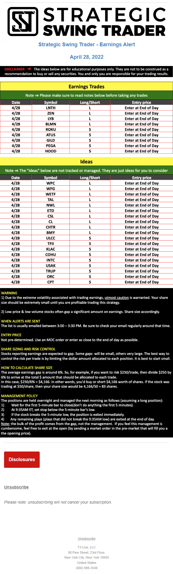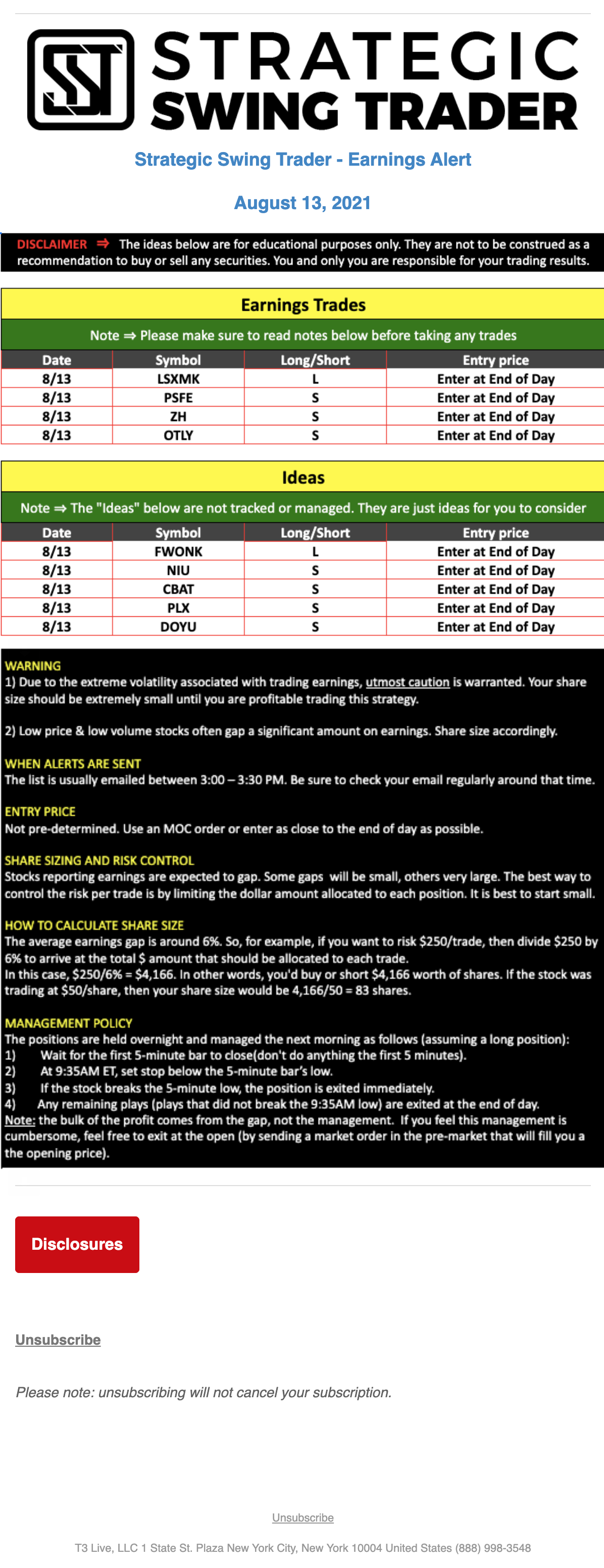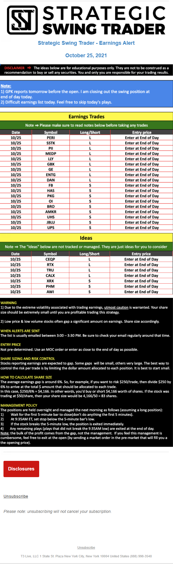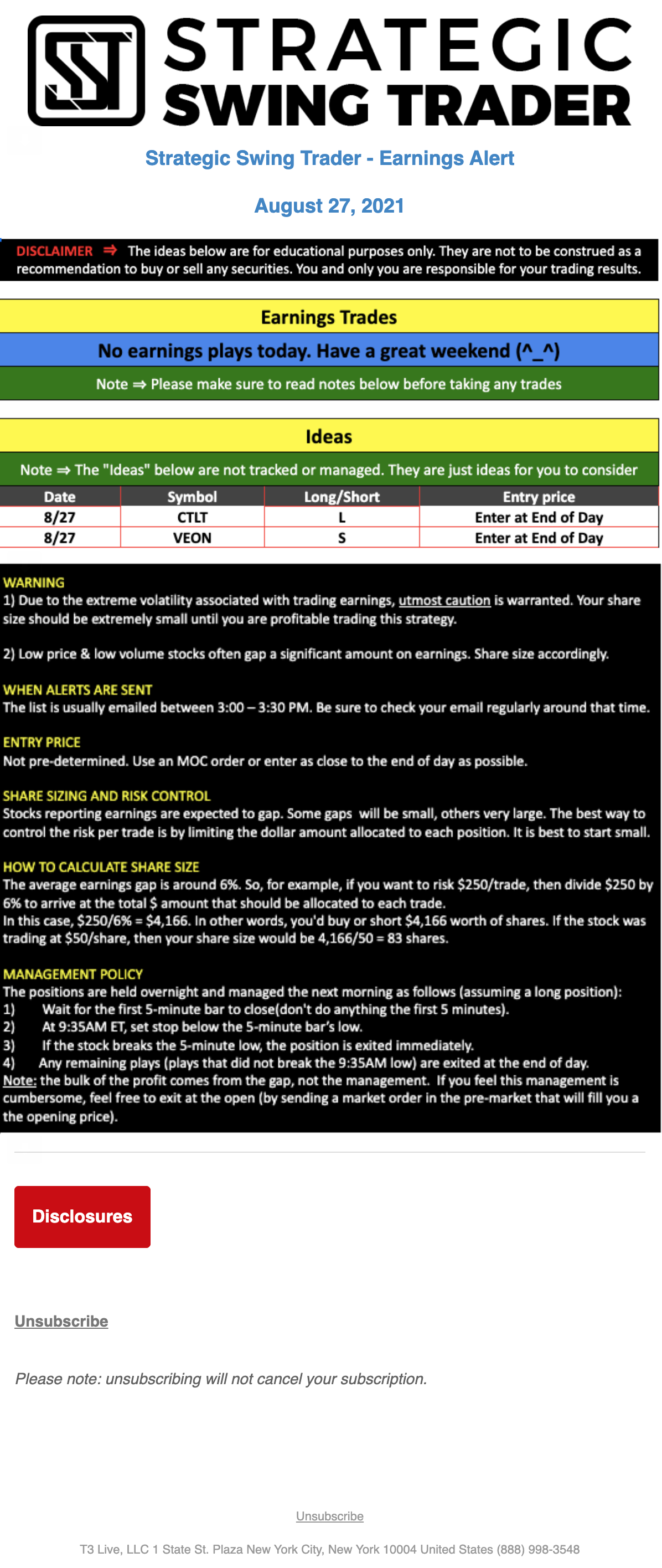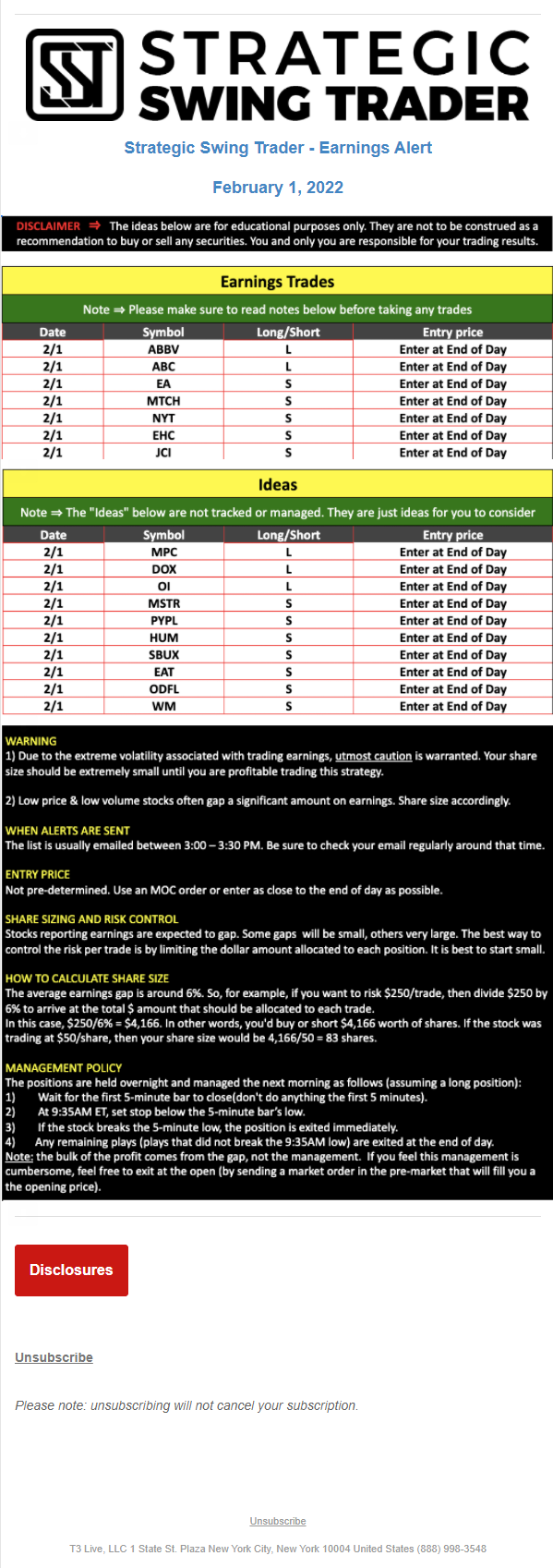 T3 Live, LLC is a financial publisher that disseminates information about economic, business, and capital markets issues through various media. T3 Live is not a Broker-Dealer, an Investment Adviser, or any other type of business subject to regulation by the SEC, CFTC, state securities regulators or any “self-regulatory organization” (such as FINRA). Although T3 Live and T3 Trading Group, LLC are affiliated companies by virtue of common ownership, the companies are managed separately and engage in different businesses.