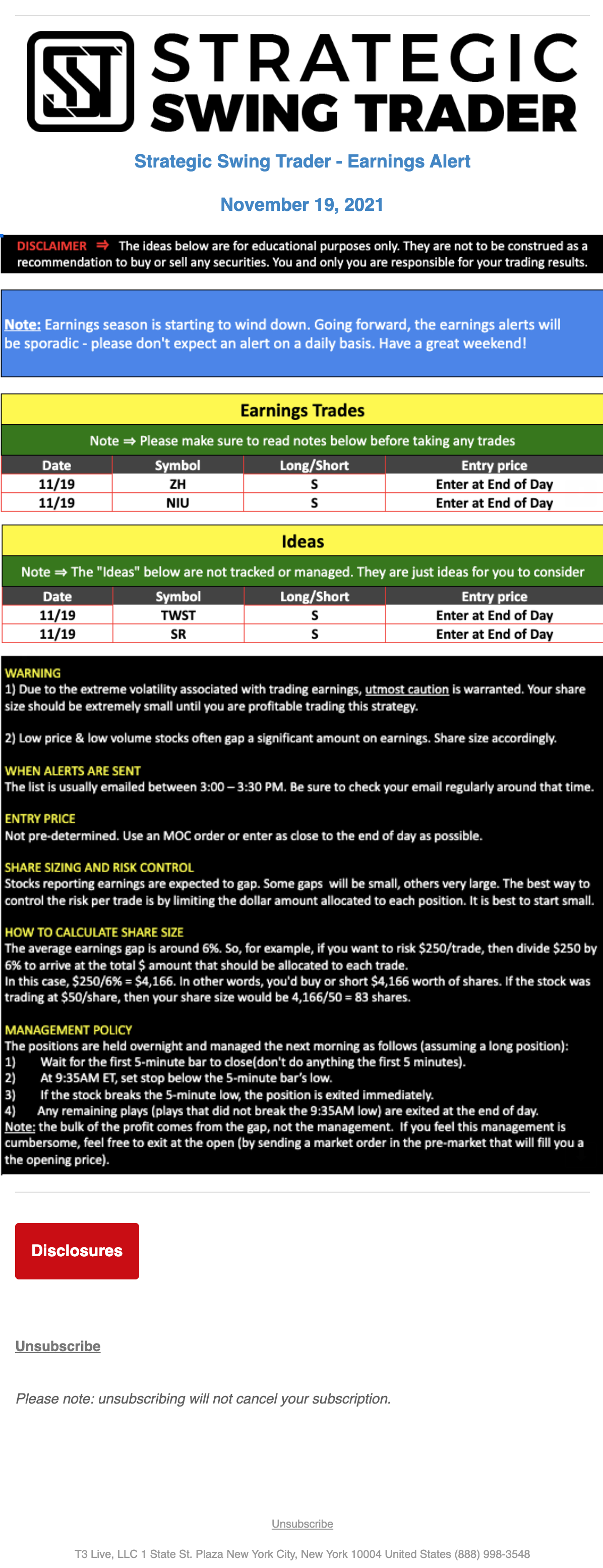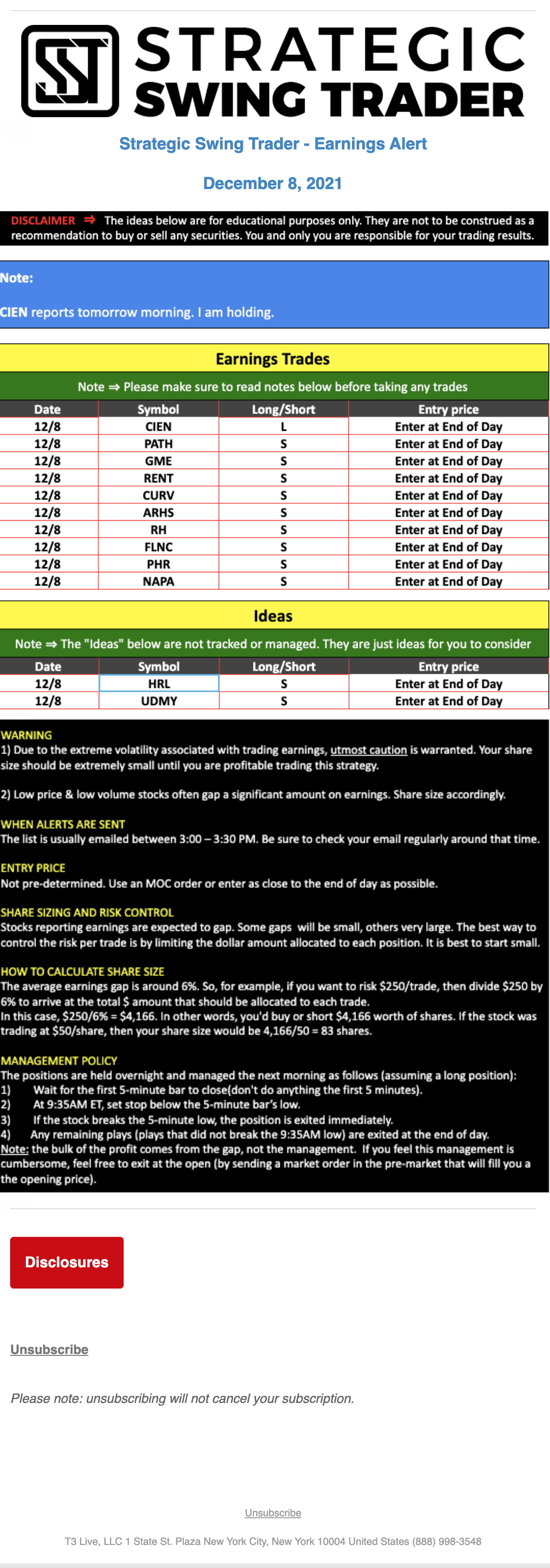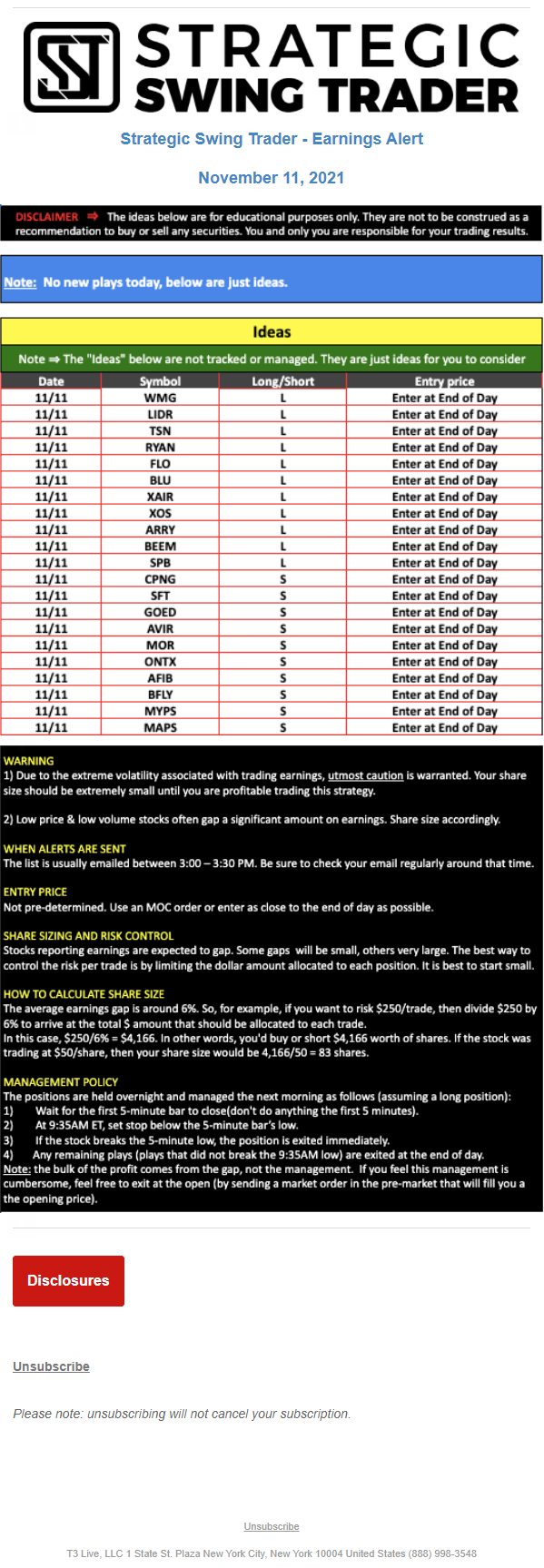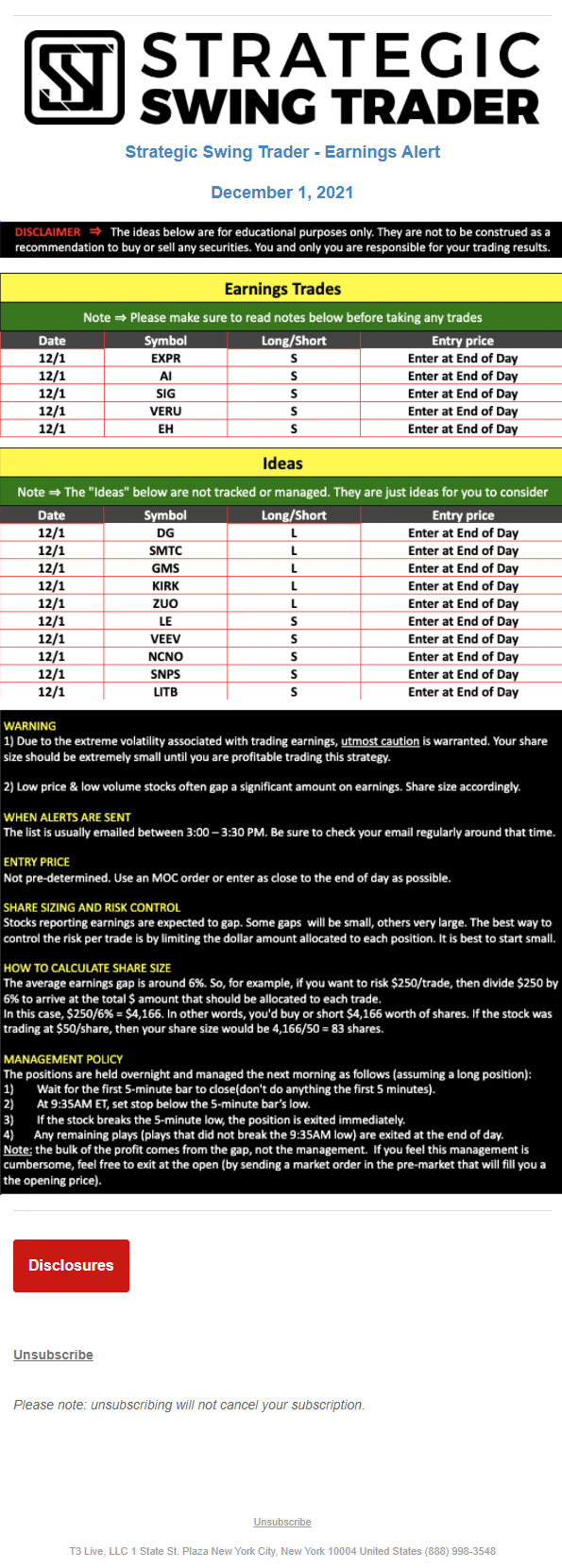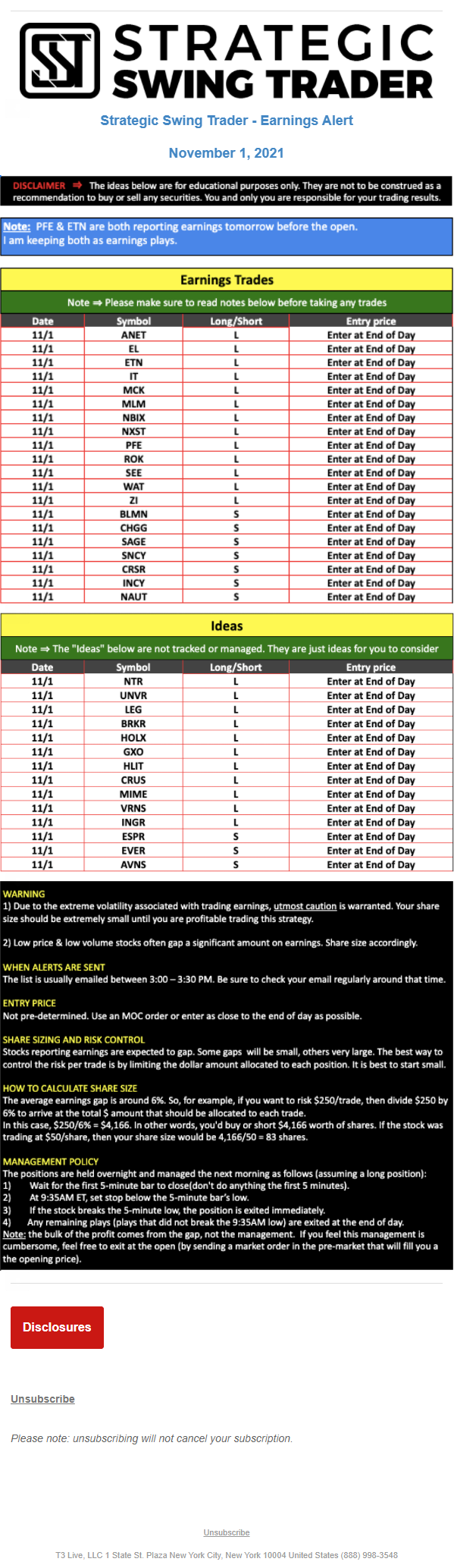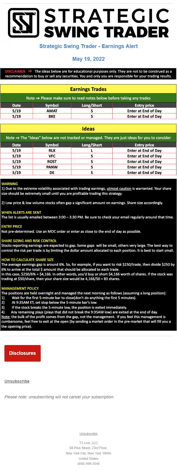 T3 Live, LLC is a financial publisher that disseminates information about economic, business, and capital markets issues through various media. T3 Live is not a Broker-Dealer, an Investment Adviser, or any other type of business subject to regulation by the SEC, CFTC, state securities regulators or any “self-regulatory organization” (such as FINRA). Although T3 Live and T3 Trading Group, LLC are affiliated companies by virtue of common ownership, the companies are managed separately and engage in different businesses.