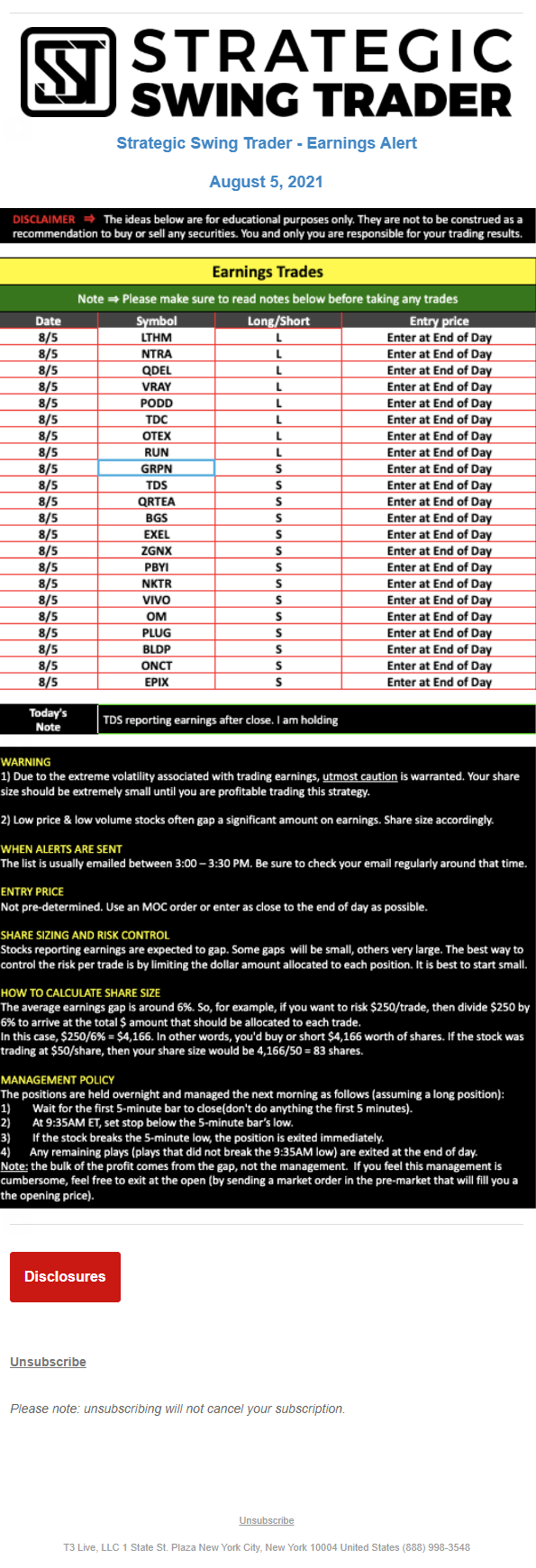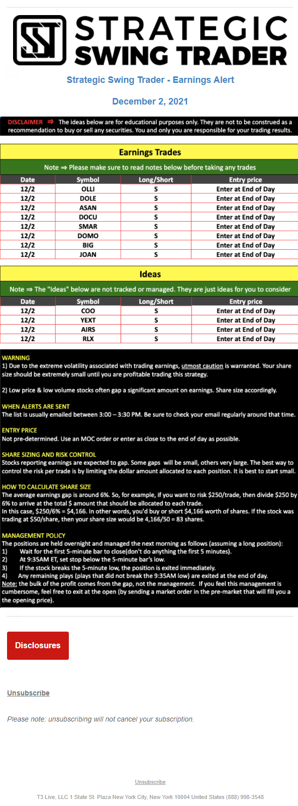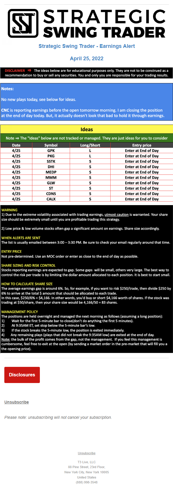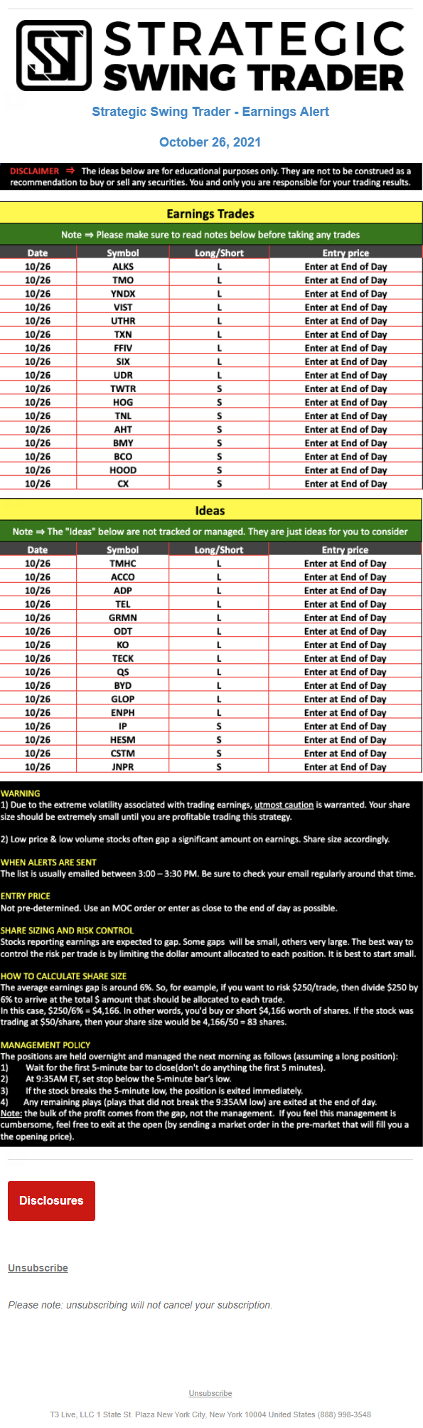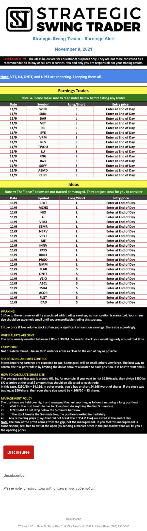 T3 Live, LLC is a financial publisher that disseminates information about economic, business, and capital markets issues through various media. T3 Live is not a Broker-Dealer, an Investment Adviser, or any other type of business subject to regulation by the SEC, CFTC, state securities regulators or any “self-regulatory organization” (such as FINRA). Although T3 Live and T3 Trading Group, LLC are affiliated companies by virtue of common ownership, the companies are managed separately and engage in different businesses.