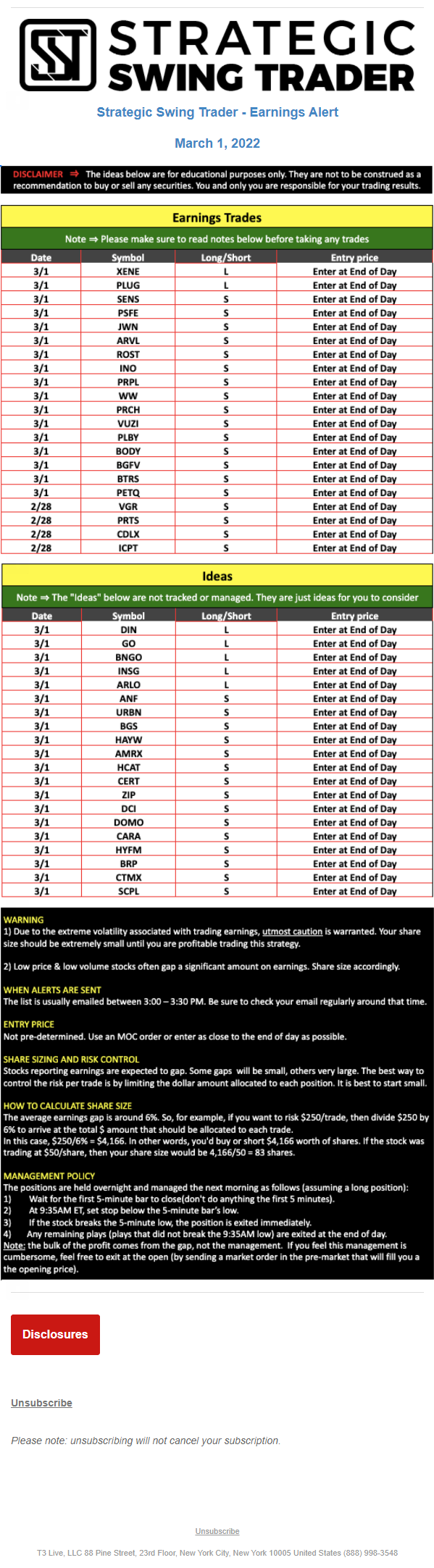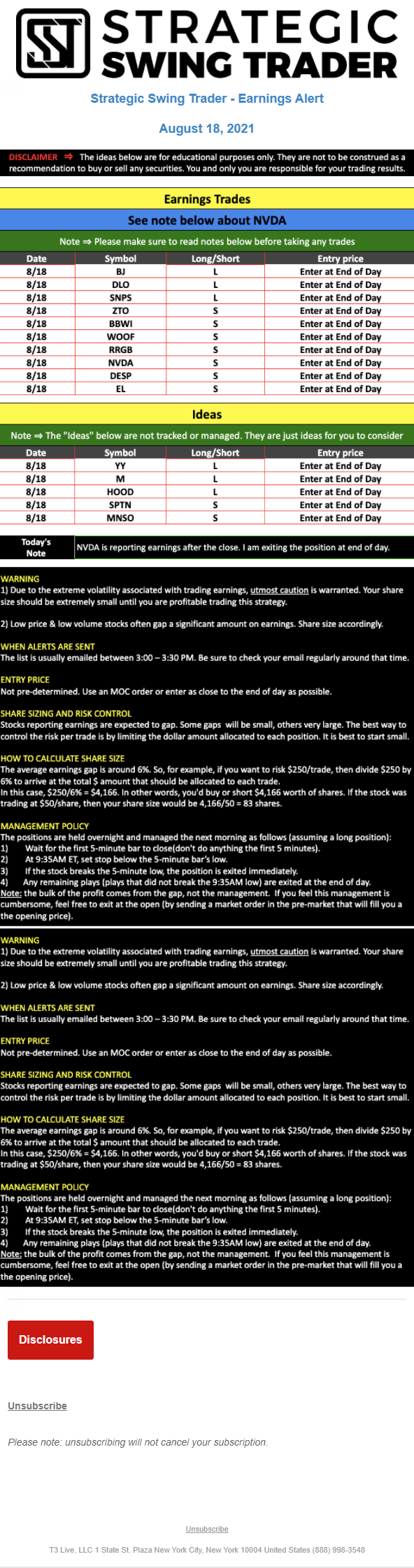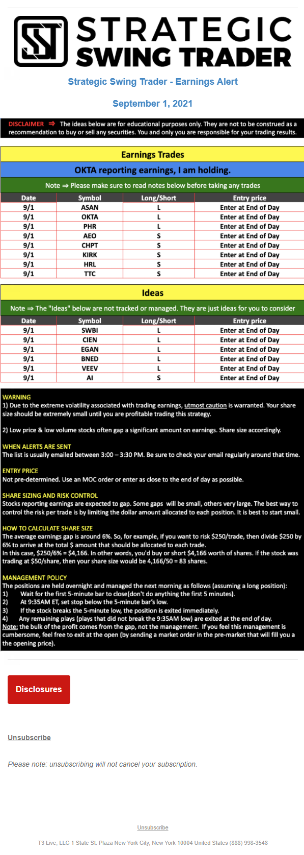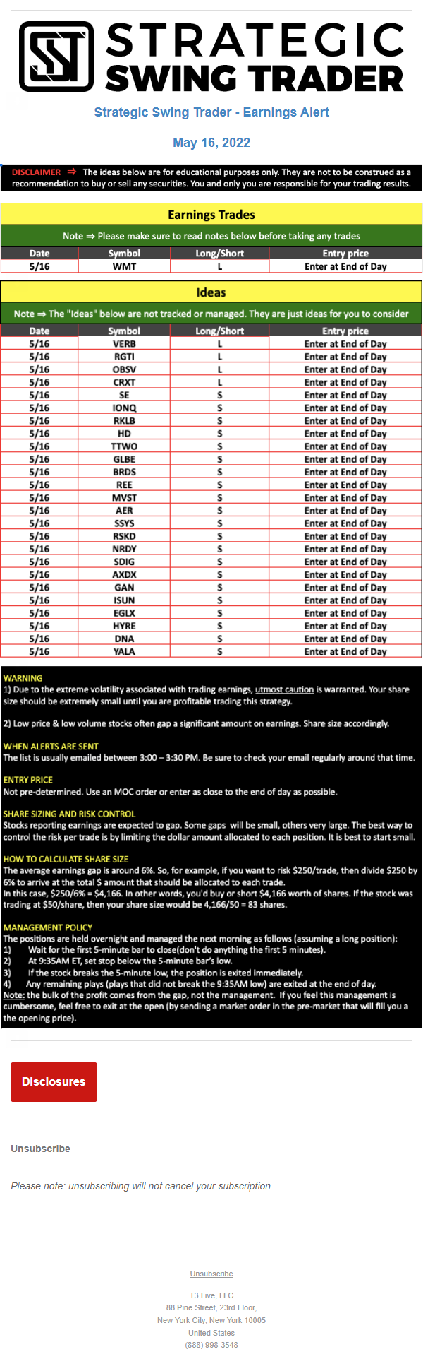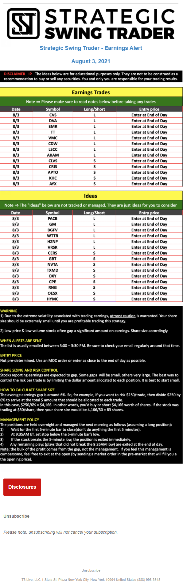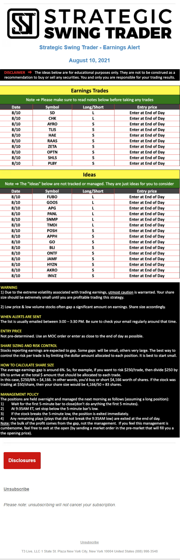 T3 Live, LLC is a financial publisher that disseminates information about economic, business, and capital markets issues through various media. T3 Live is not a Broker-Dealer, an Investment Adviser, or any other type of business subject to regulation by the SEC, CFTC, state securities regulators or any “self-regulatory organization” (such as FINRA). Although T3 Live and T3 Trading Group, LLC are affiliated companies by virtue of common ownership, the companies are managed separately and engage in different businesses.